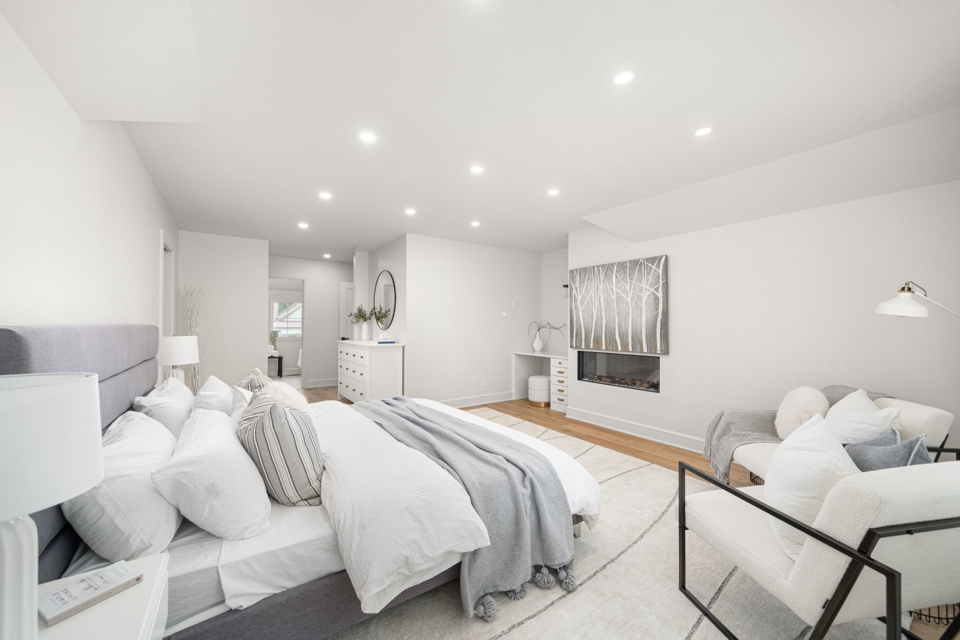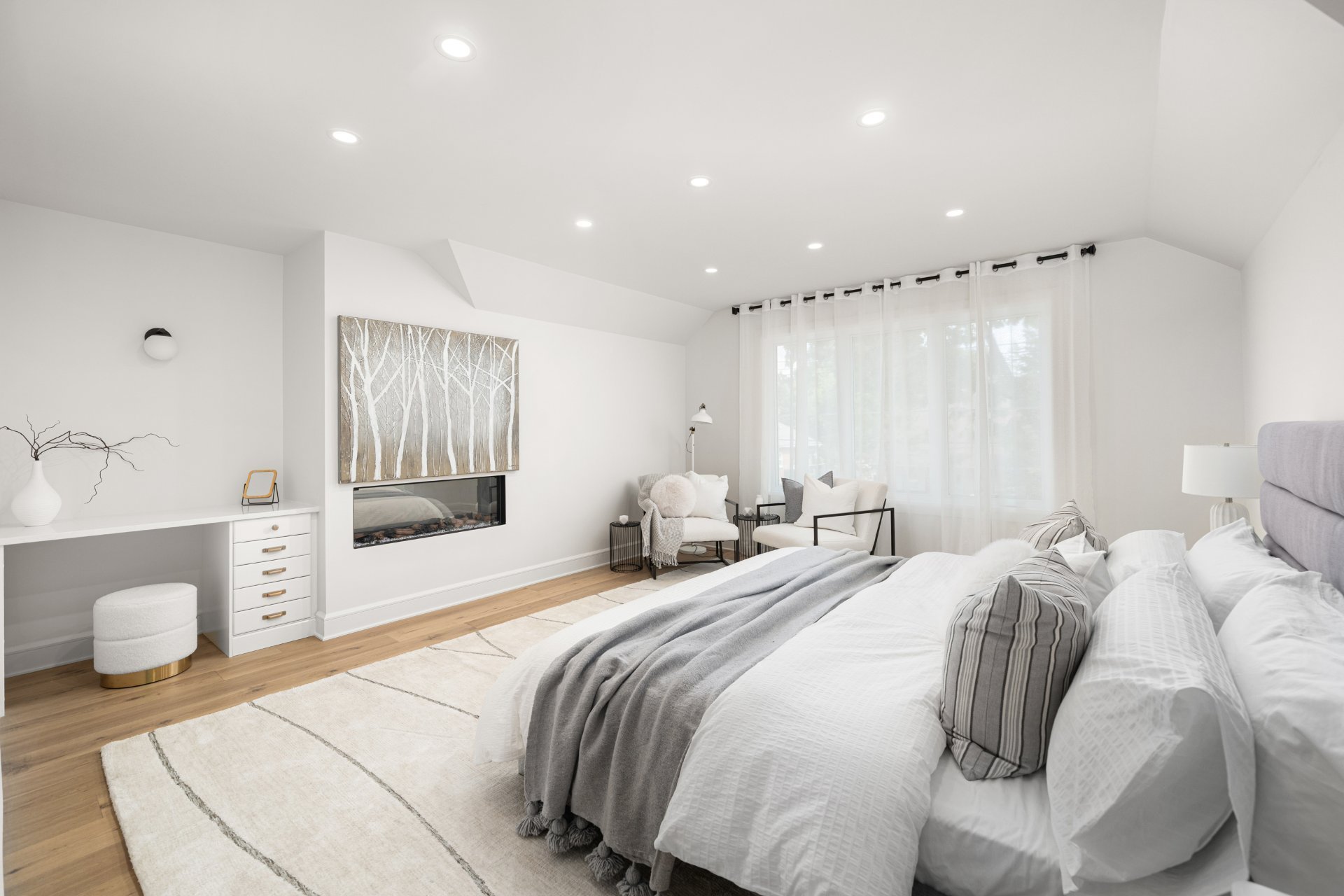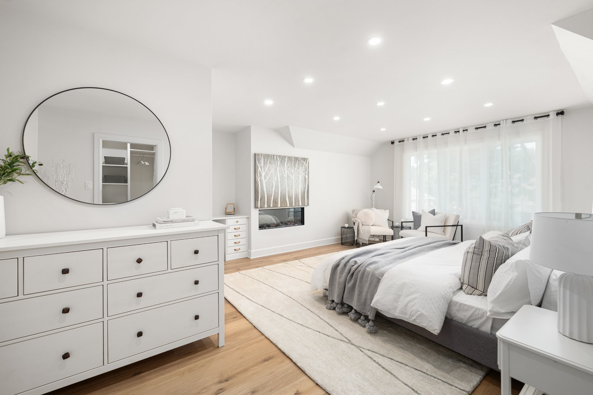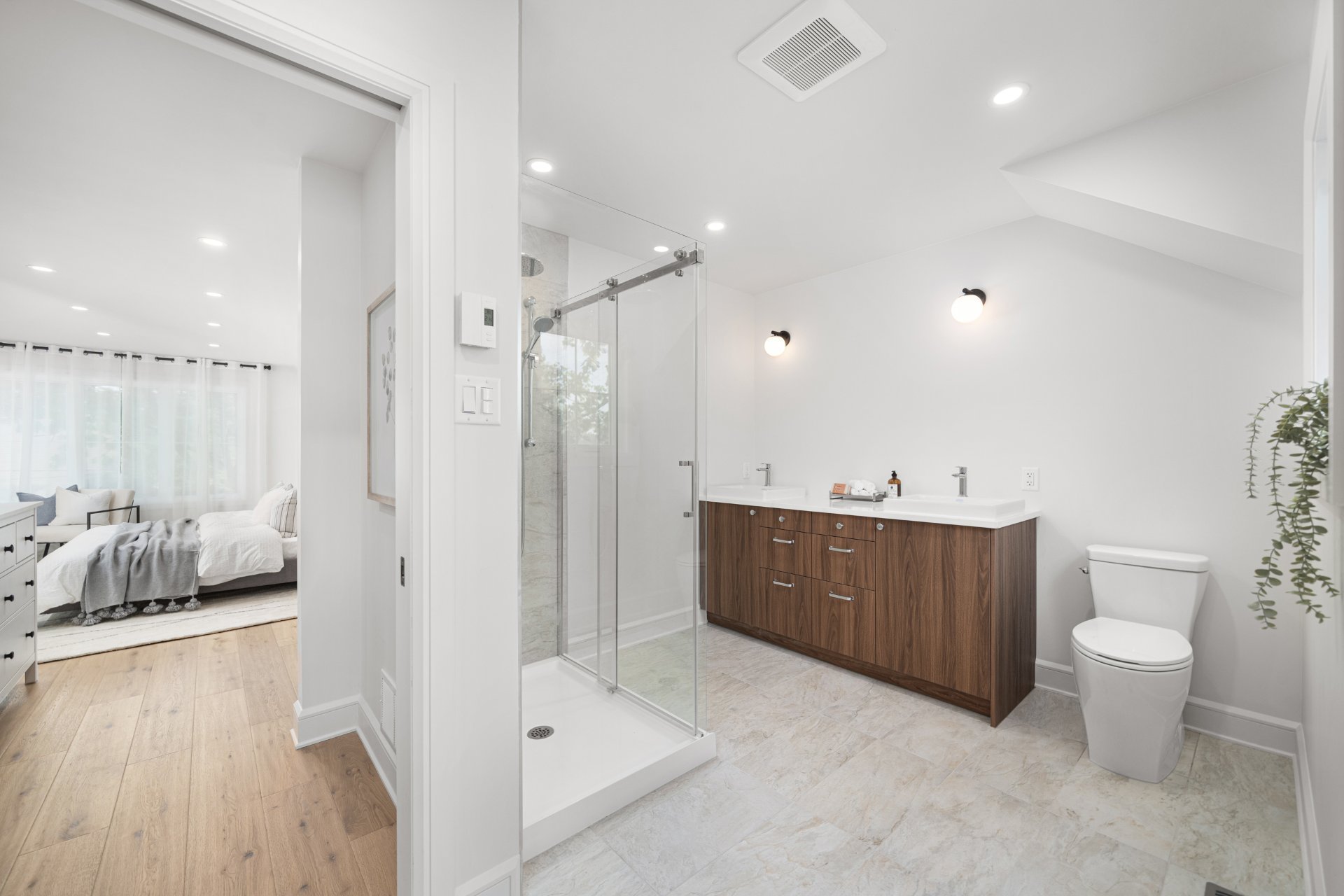 À l’étage, la suite principale constitue un véritable refuge avec salle de bain de style spa comprenant double lavabo, douche vitrée, bain autoportant, planchers chauffants et walk-in sur mesure. Deux chambres additionnelles et une salle de bain familiale élégante avec planchers chauffants complètent l’étage.