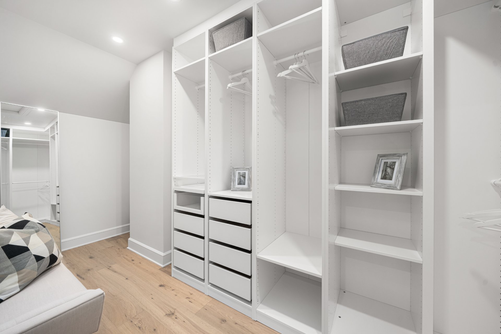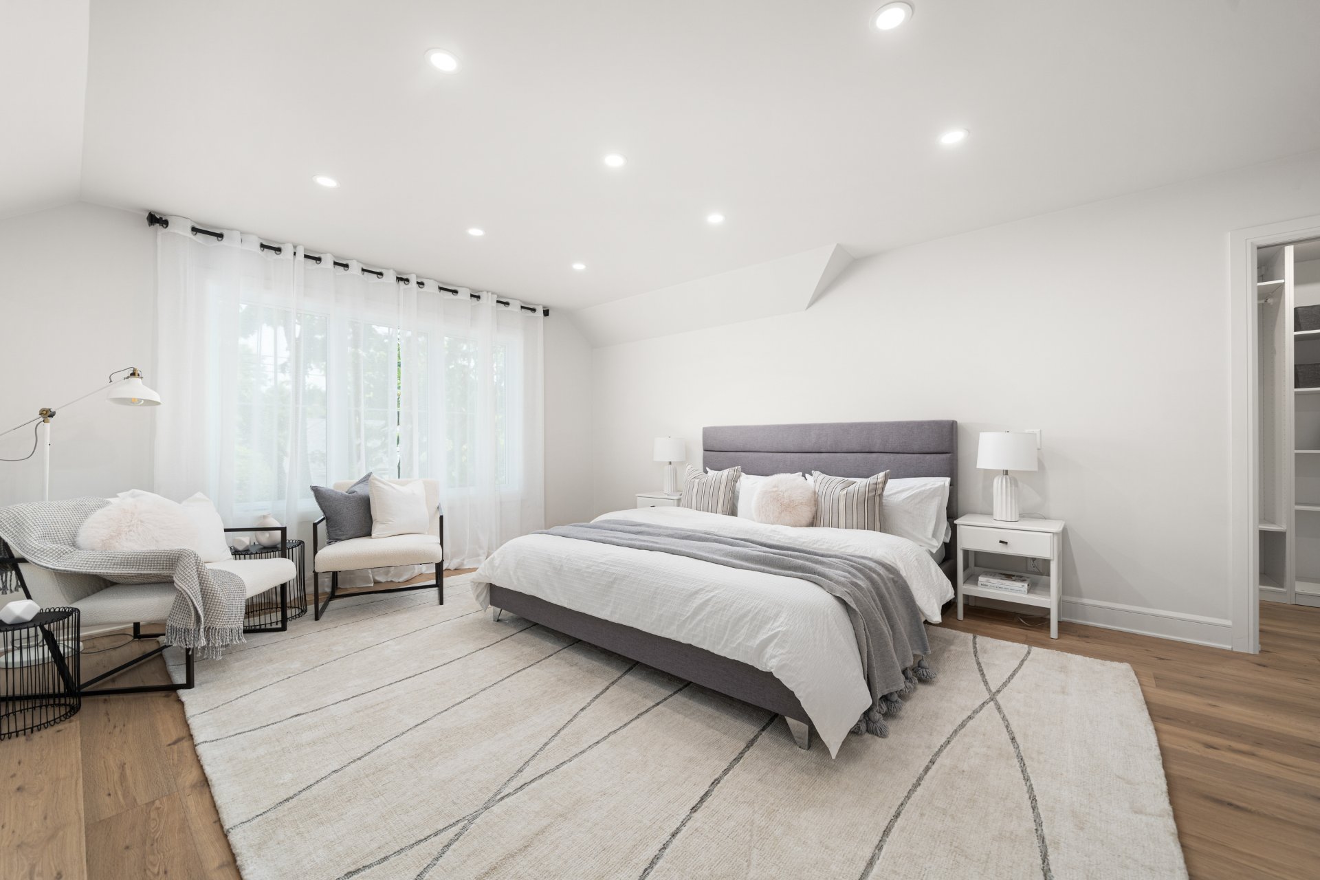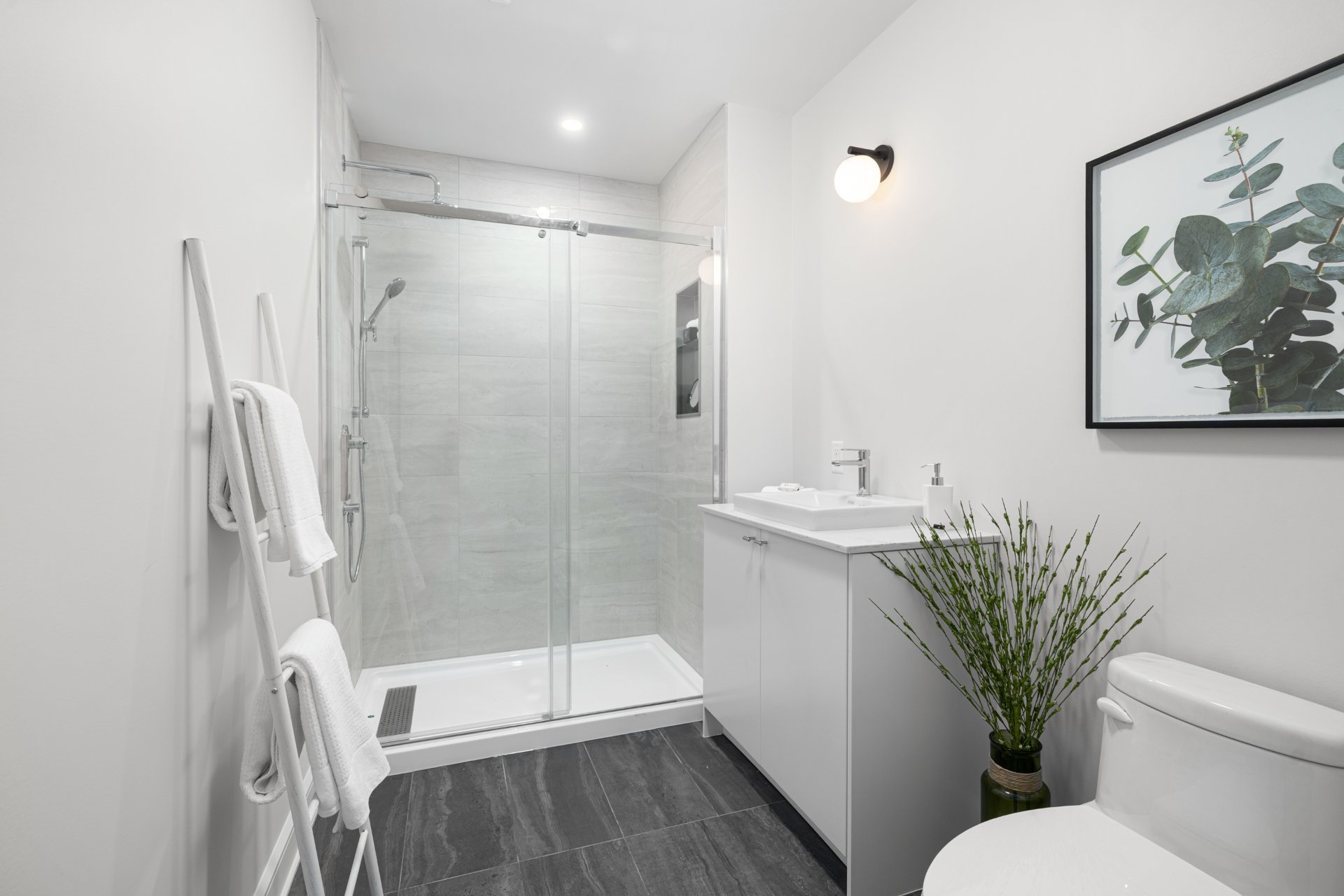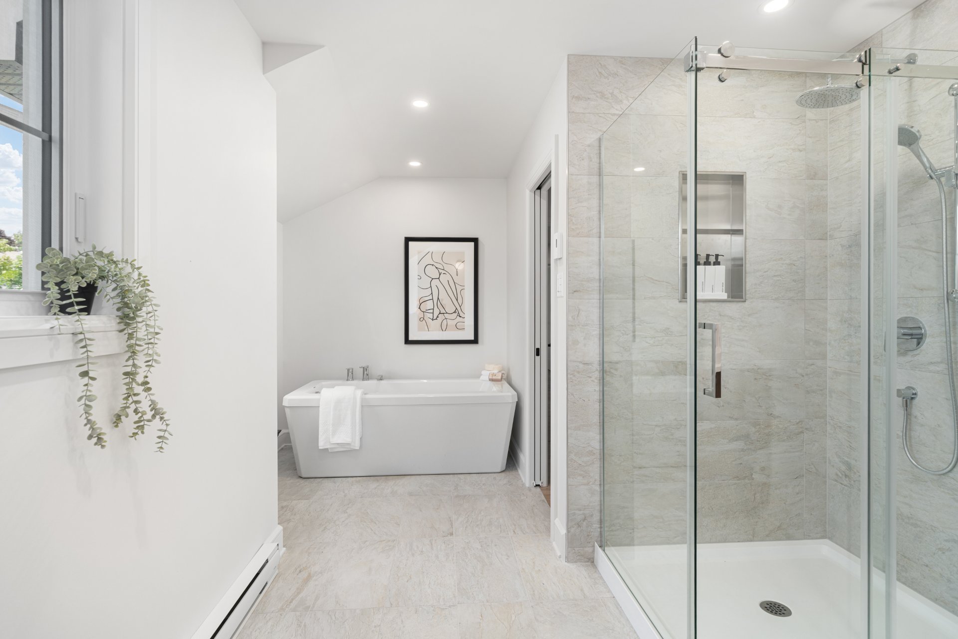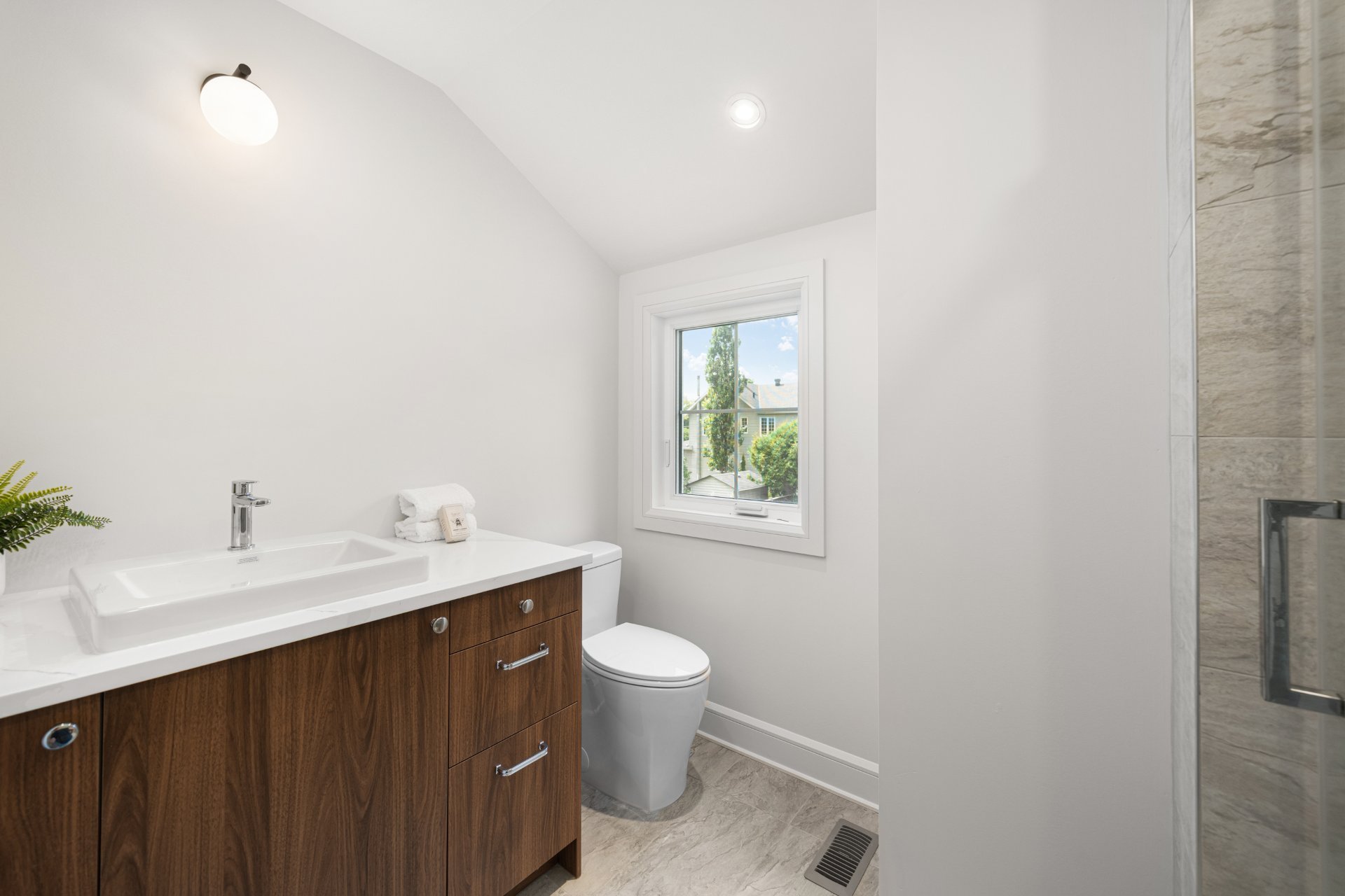 À l’étage, la suite principale constitue un véritable refuge avec salle de bain de style spa comprenant double lavabo, douche vitrée, bain autoportant, planchers chauffants et walk-in sur mesure. Deux chambres additionnelles et une salle de bain familiale élégante avec planchers chauffants complètent l’étage.
