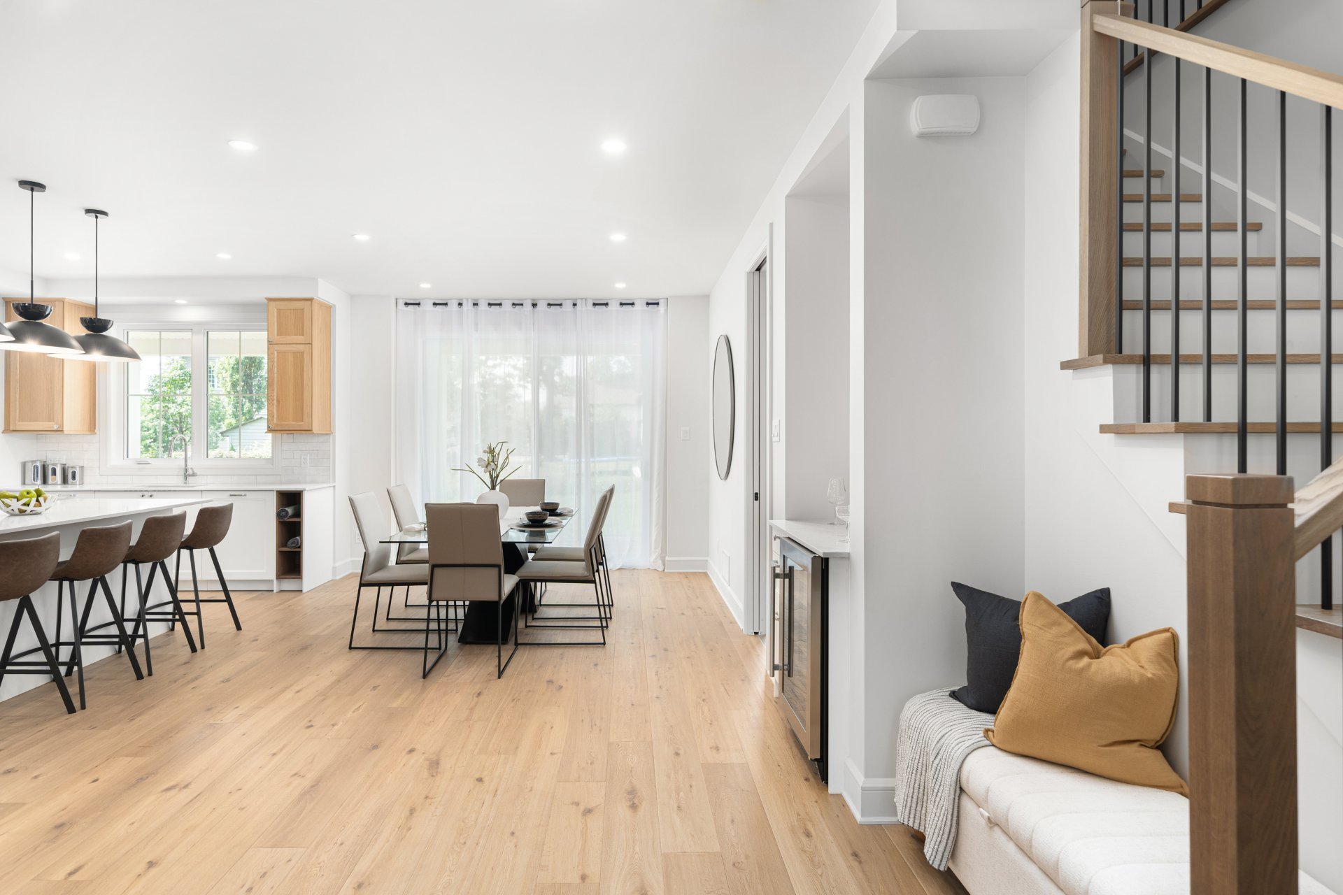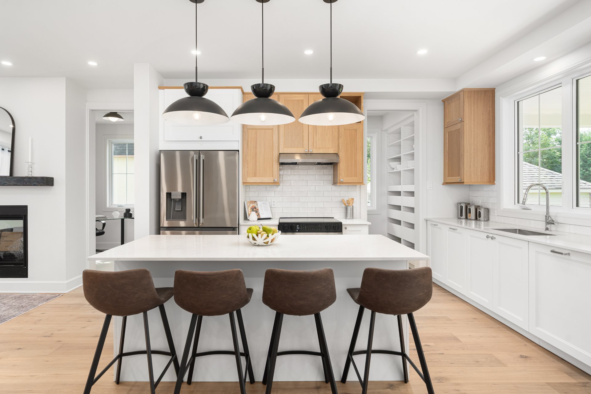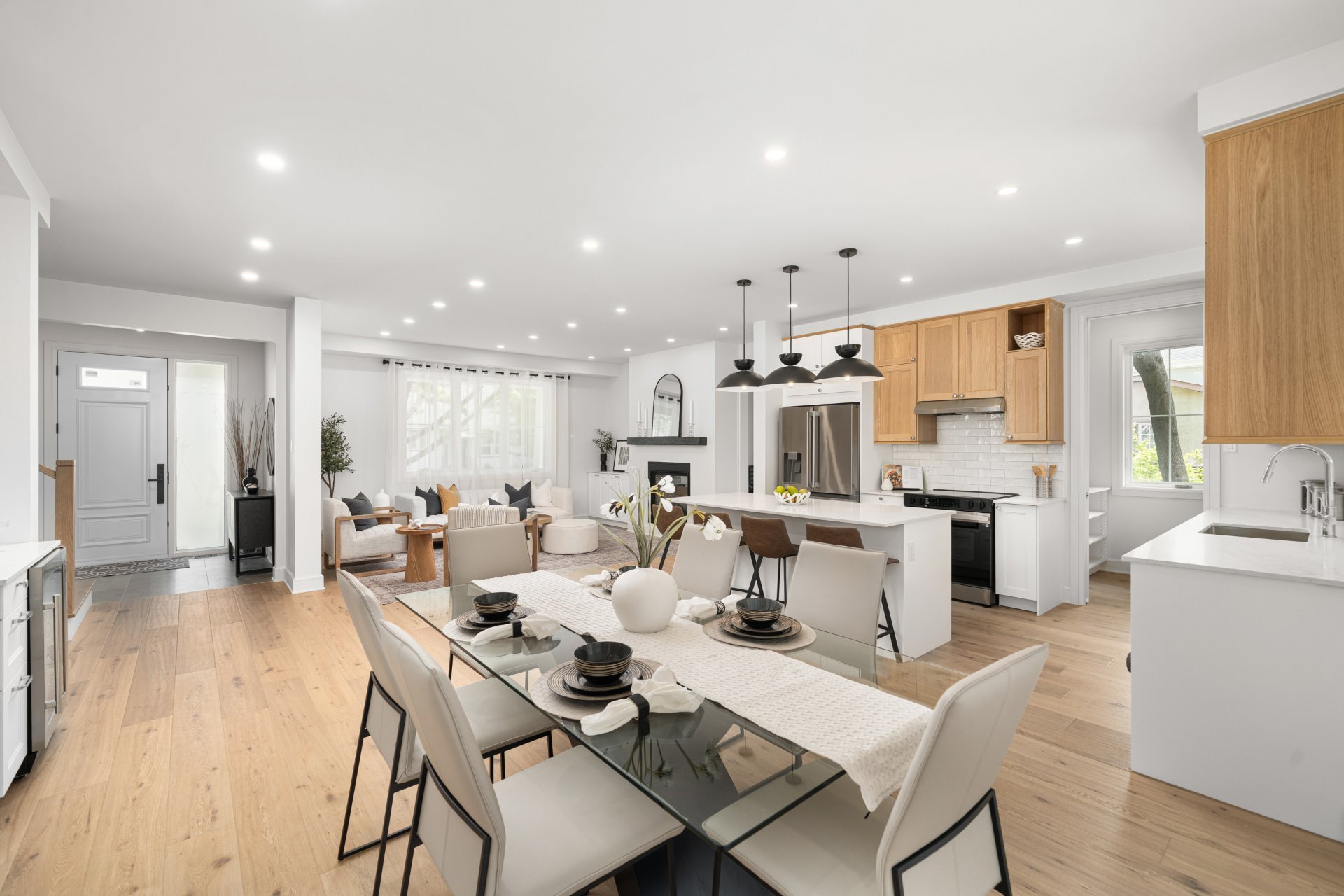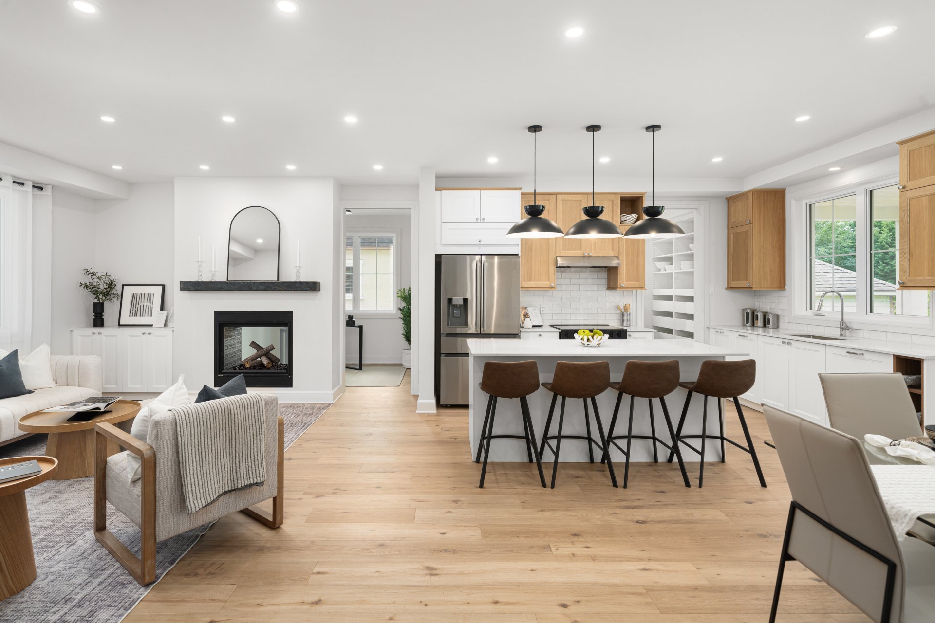 Le rez-de-chaussée propose un vaste espace à aire ouverte baigné de lumière, avec planchers de bois franc larges et finitions haut de gamme. La cuisine gourmet, équipée de comptoirs en quartz, d’un grand îlot, d’un cellier et d’un garde-manger avec rangements sur mesure, s’ouvre sur la salle à manger et sur une terrasse couverte en bois donnant sur la cour arrière. Le salon, doté d’un foyer au gaz double face partagé avec le bureau à domicile, crée une ambiance chaleureuse et raffinée. Un vestibule pratique avec accès à la cour et au garage double ajoute à la fonctionnalité.