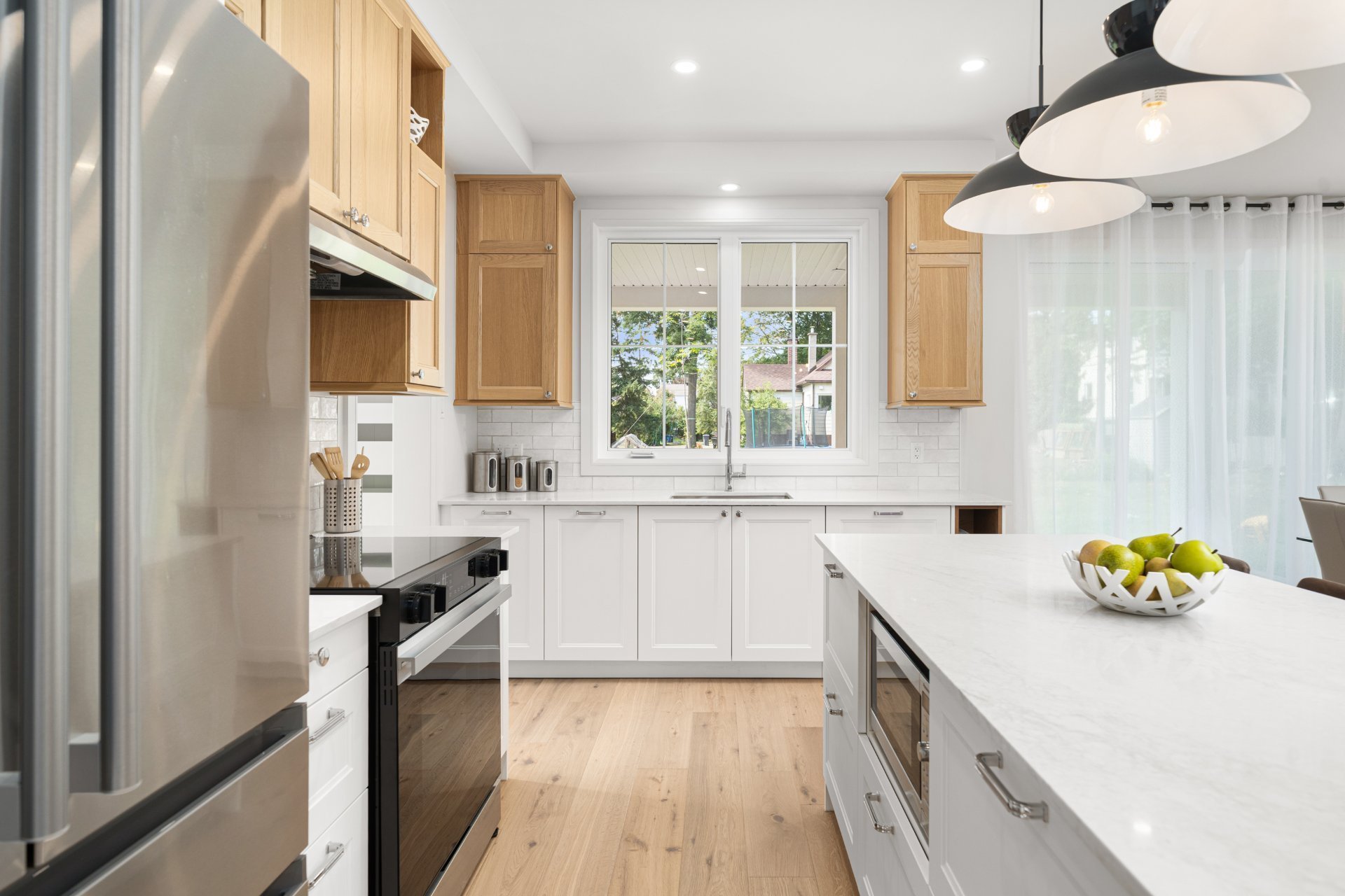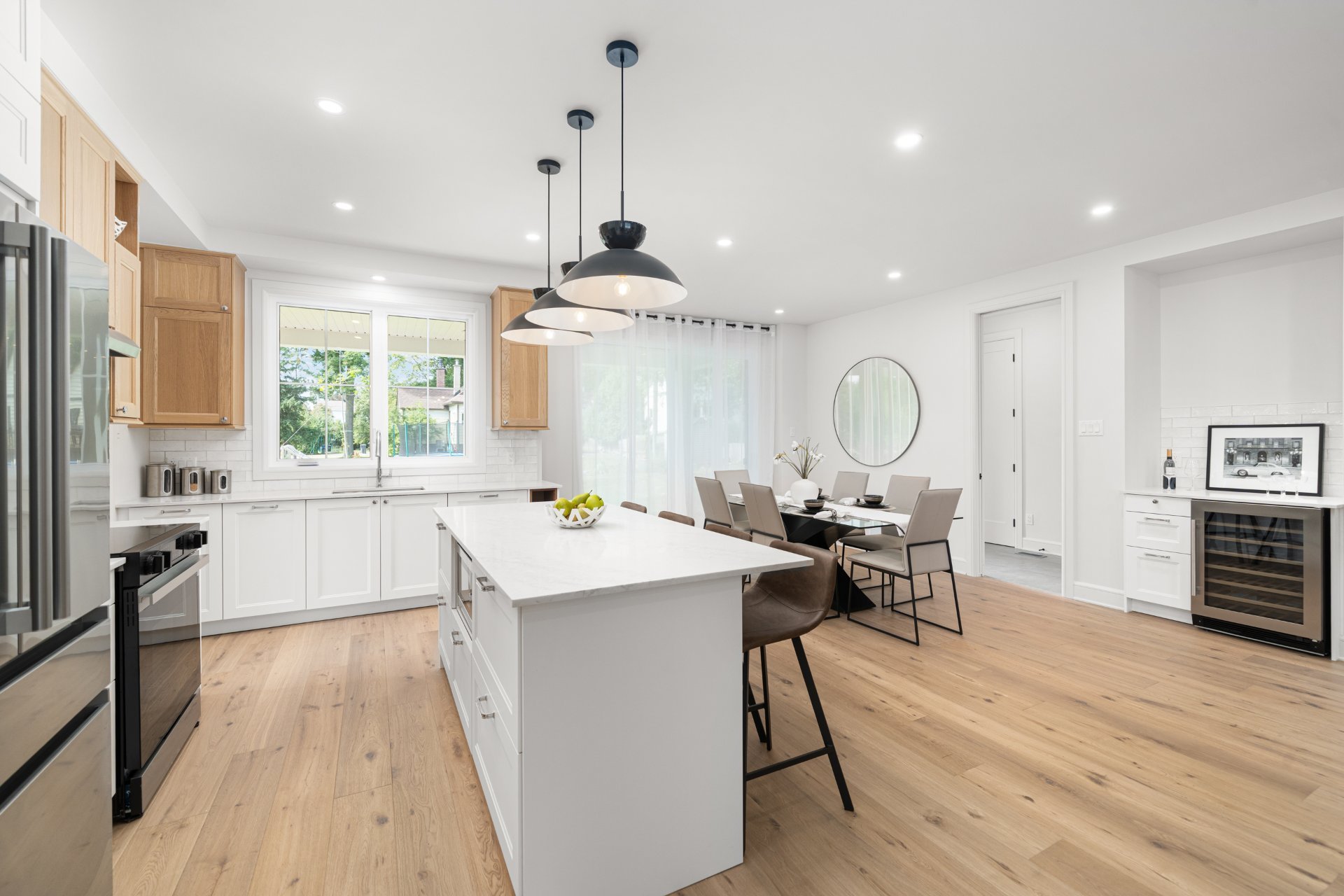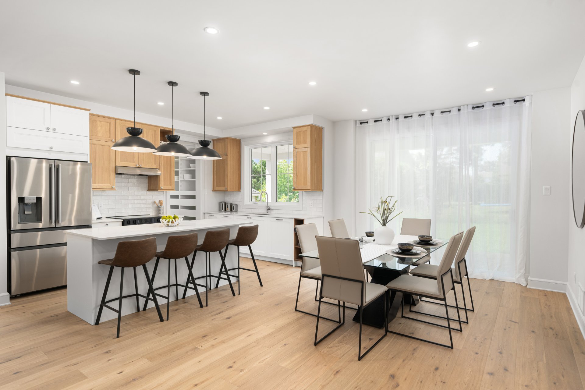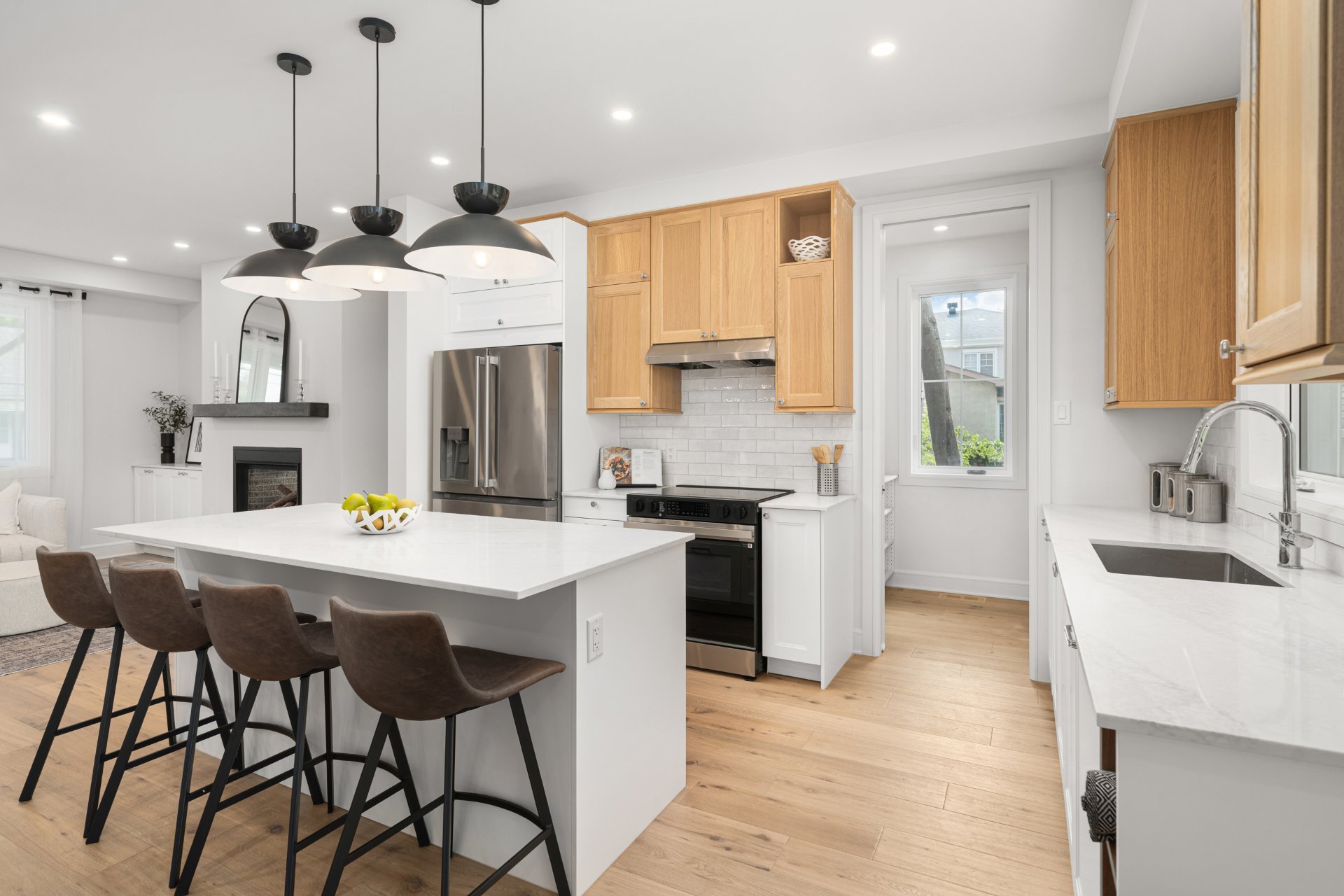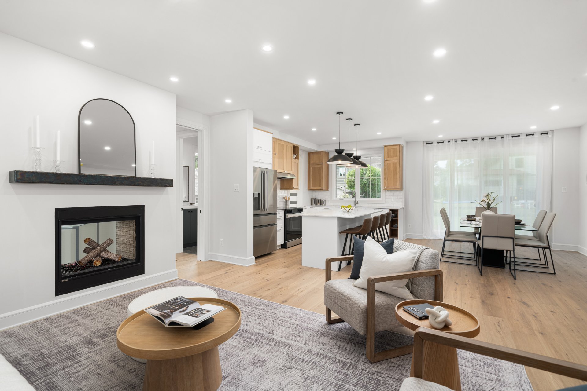 Le rez-de-chaussée propose un vaste espace à aire ouverte baigné de lumière, avec planchers de bois franc larges et finitions haut de gamme. La cuisine gourmet, équipée de comptoirs en quartz, d’un grand îlot, d’un cellier et d’un garde-manger avec rangements sur mesure, s’ouvre sur la salle à manger et sur une terrasse couverte en bois donnant sur la cour arrière. Le salon, doté d’un foyer au gaz double face partagé avec le bureau à domicile, crée une ambiance chaleureuse et raffinée. Un vestibule pratique avec accès à la cour et au garage double ajoute à la fonctionnalité.