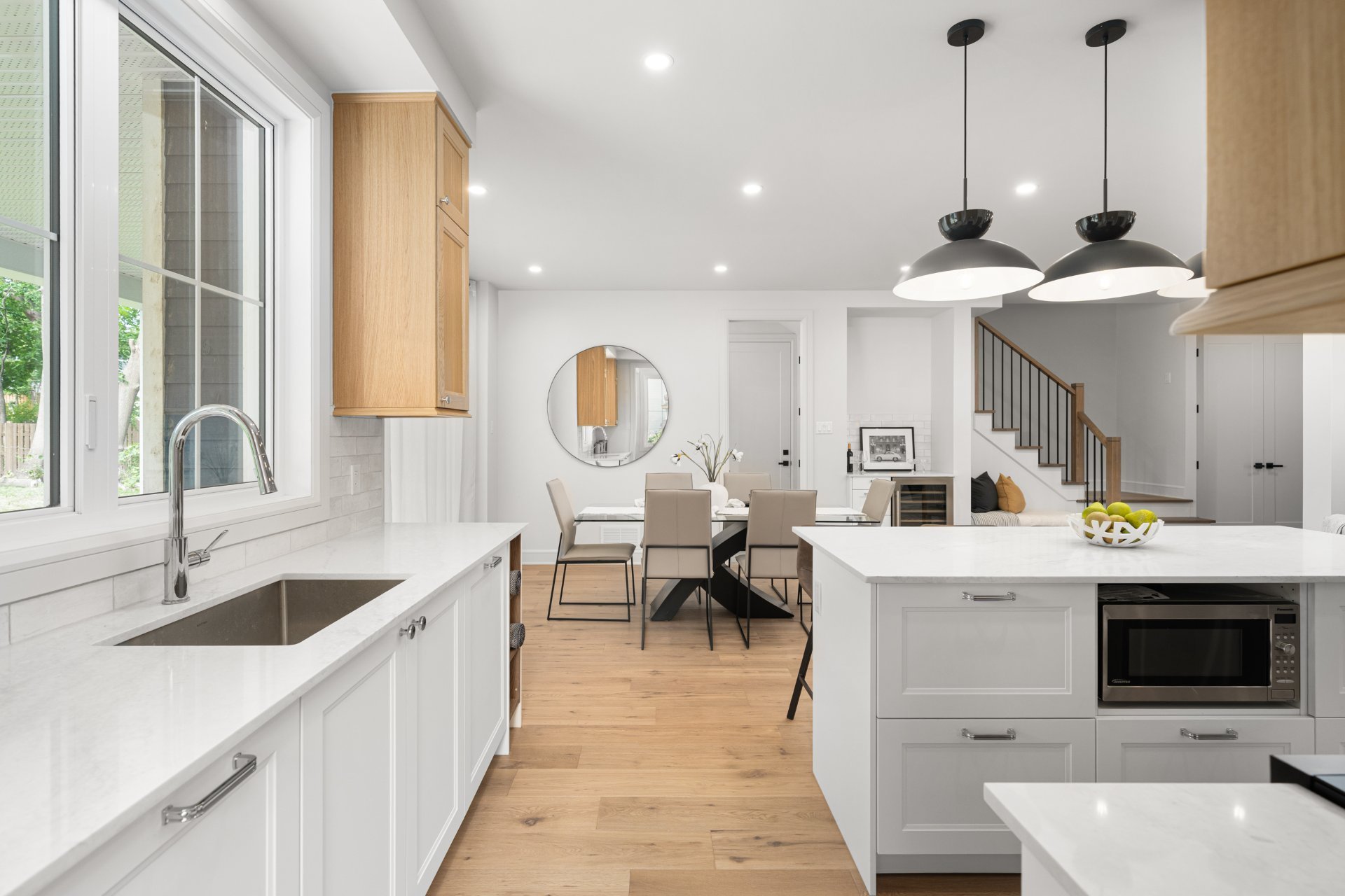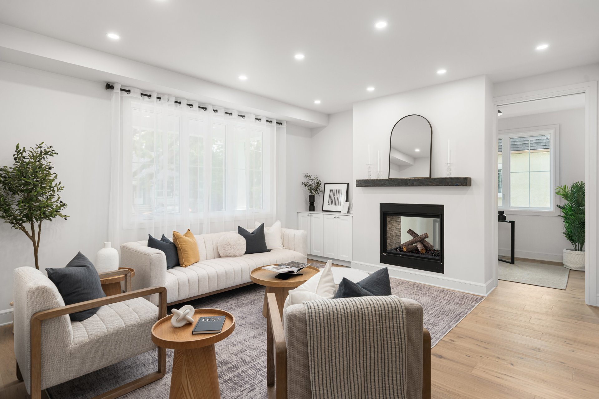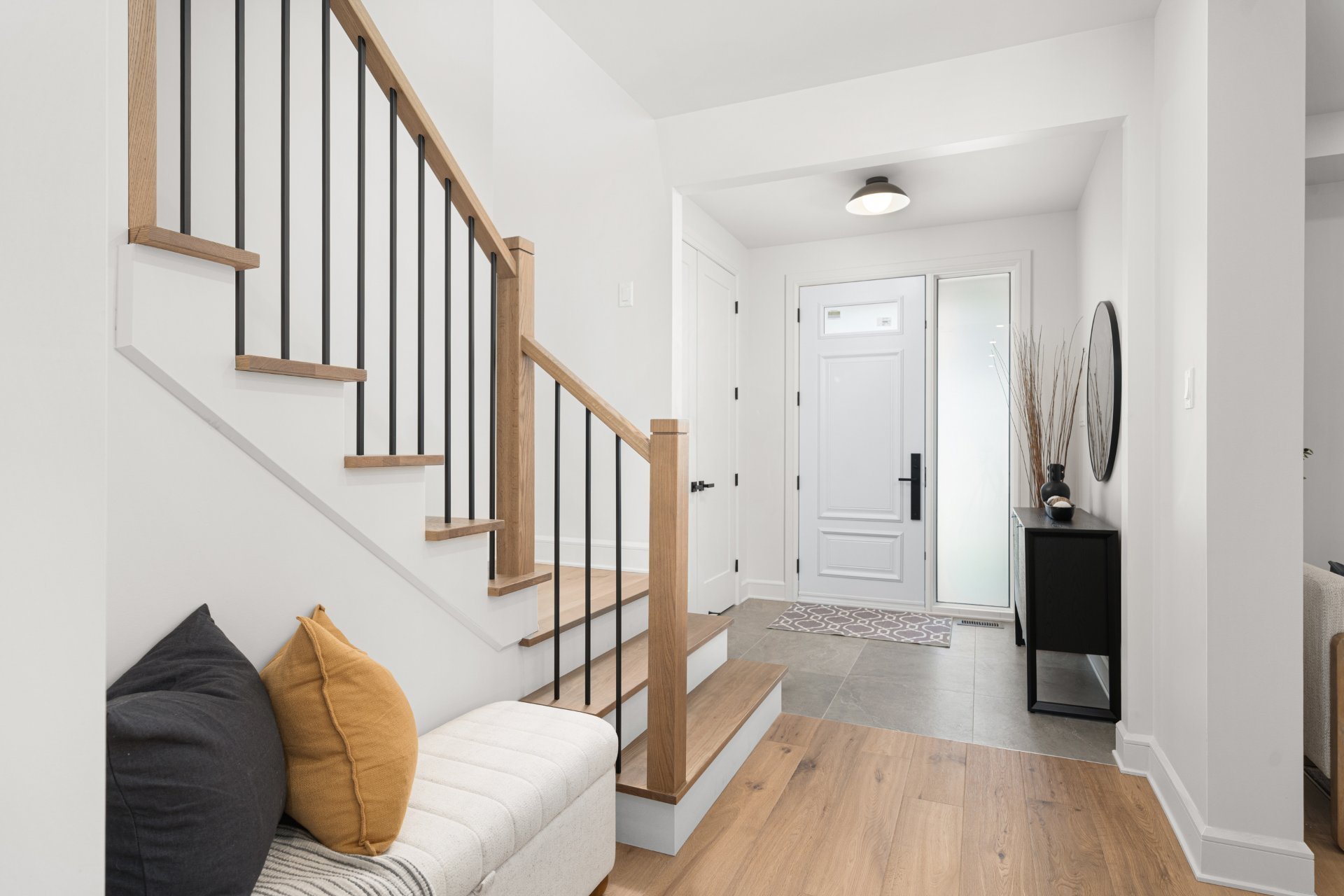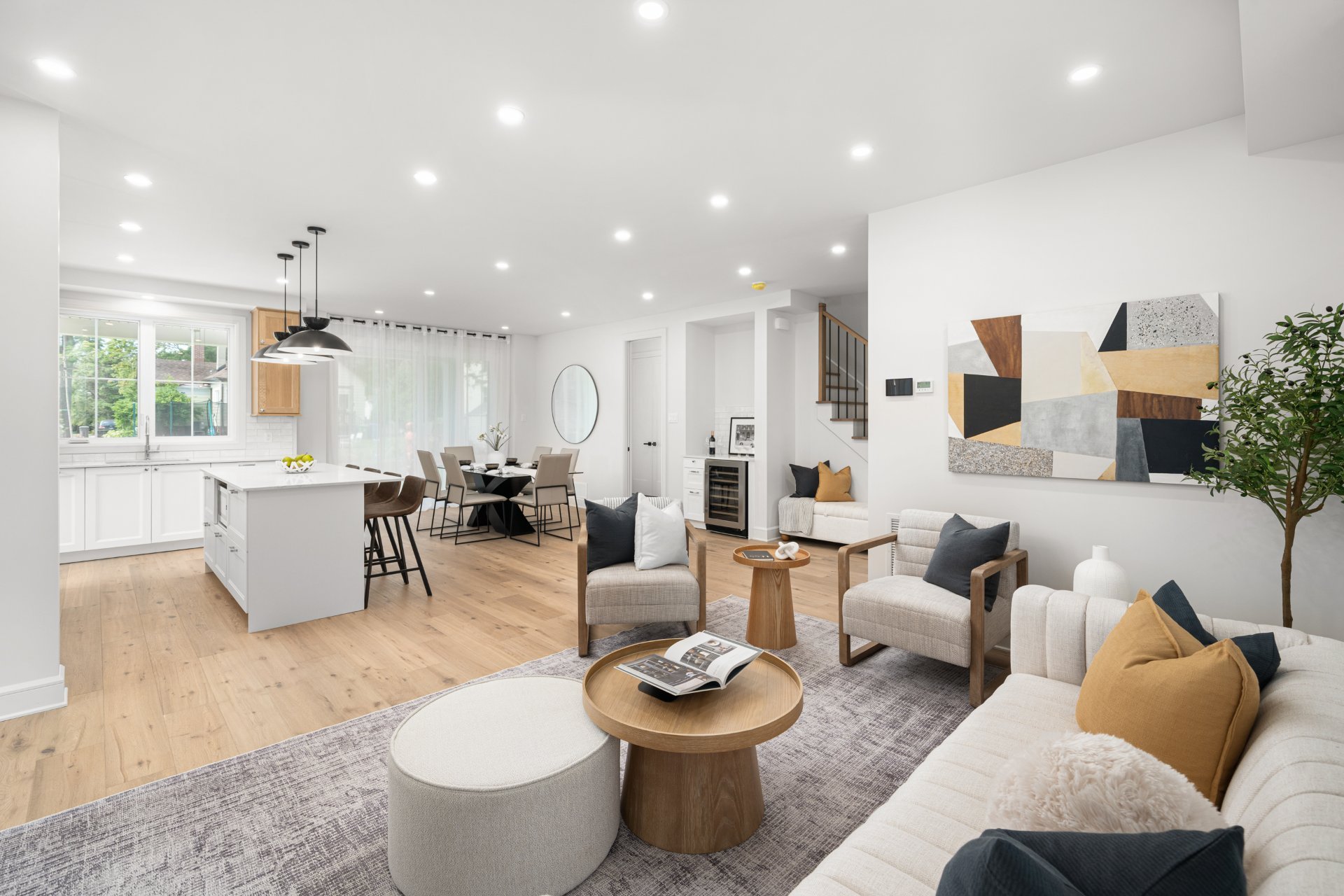 Le rez-de-chaussée propose un vaste espace à aire ouverte baigné de lumière, avec planchers de bois franc larges et finitions haut de gamme. La cuisine gourmet, équipée de comptoirs en quartz, d’un grand îlot, d’un cellier et d’un garde-manger avec rangements sur mesure, s’ouvre sur la salle à manger et sur une terrasse couverte en bois donnant sur la cour arrière. Le salon, doté d’un foyer au gaz double face partagé avec le bureau à domicile, crée une ambiance chaleureuse et raffinée. Un vestibule pratique avec accès à la cour et au garage double ajoute à la fonctionnalité.