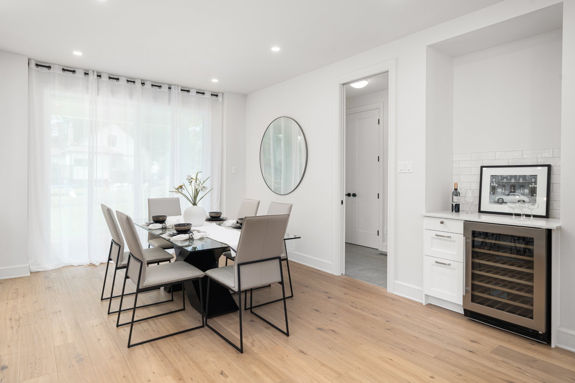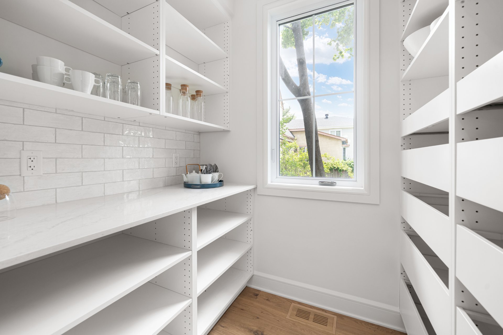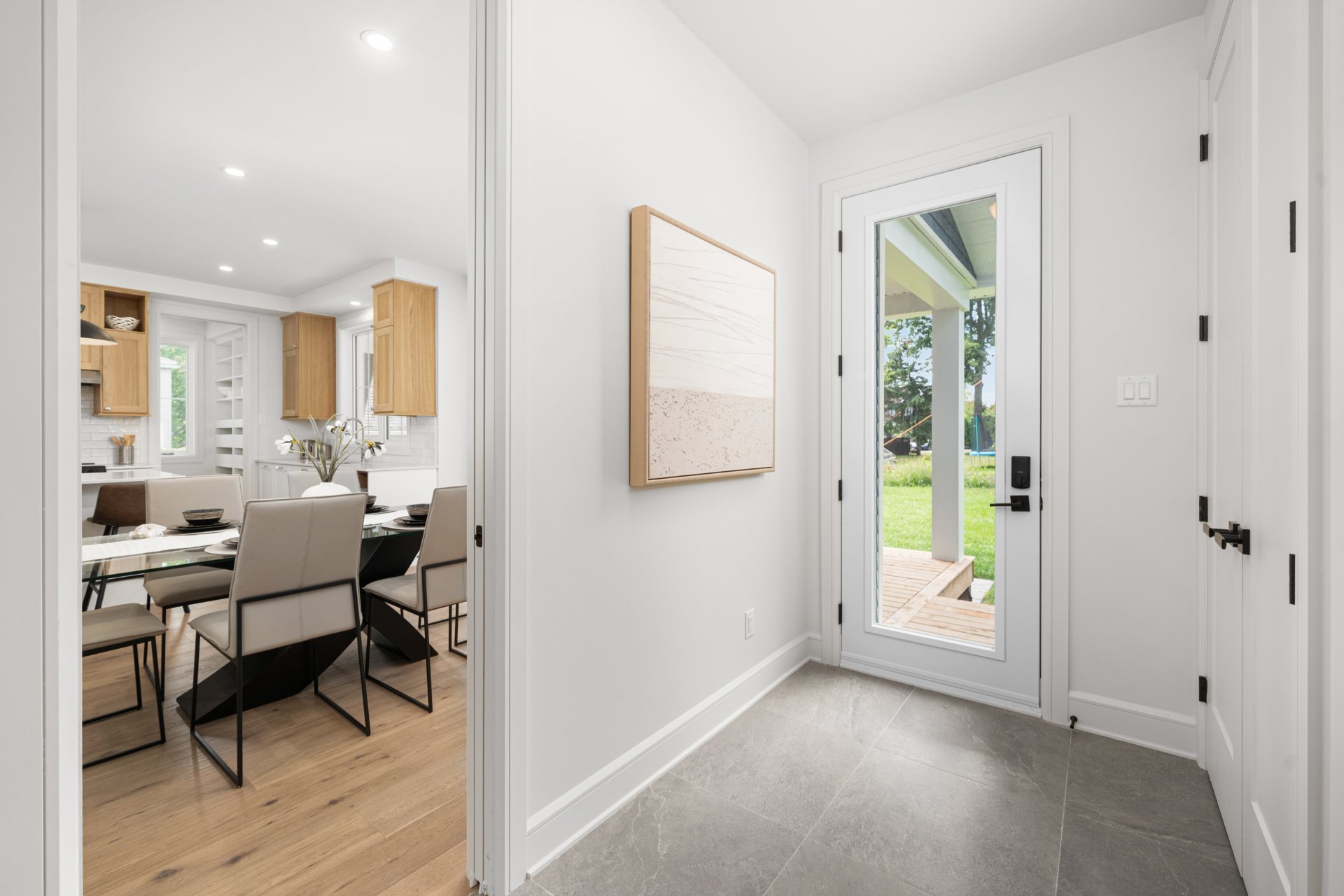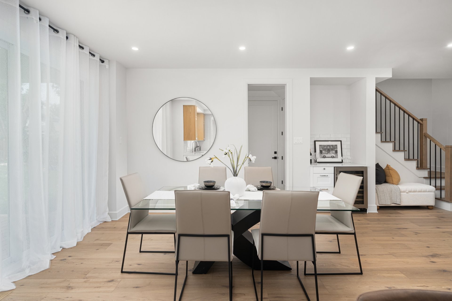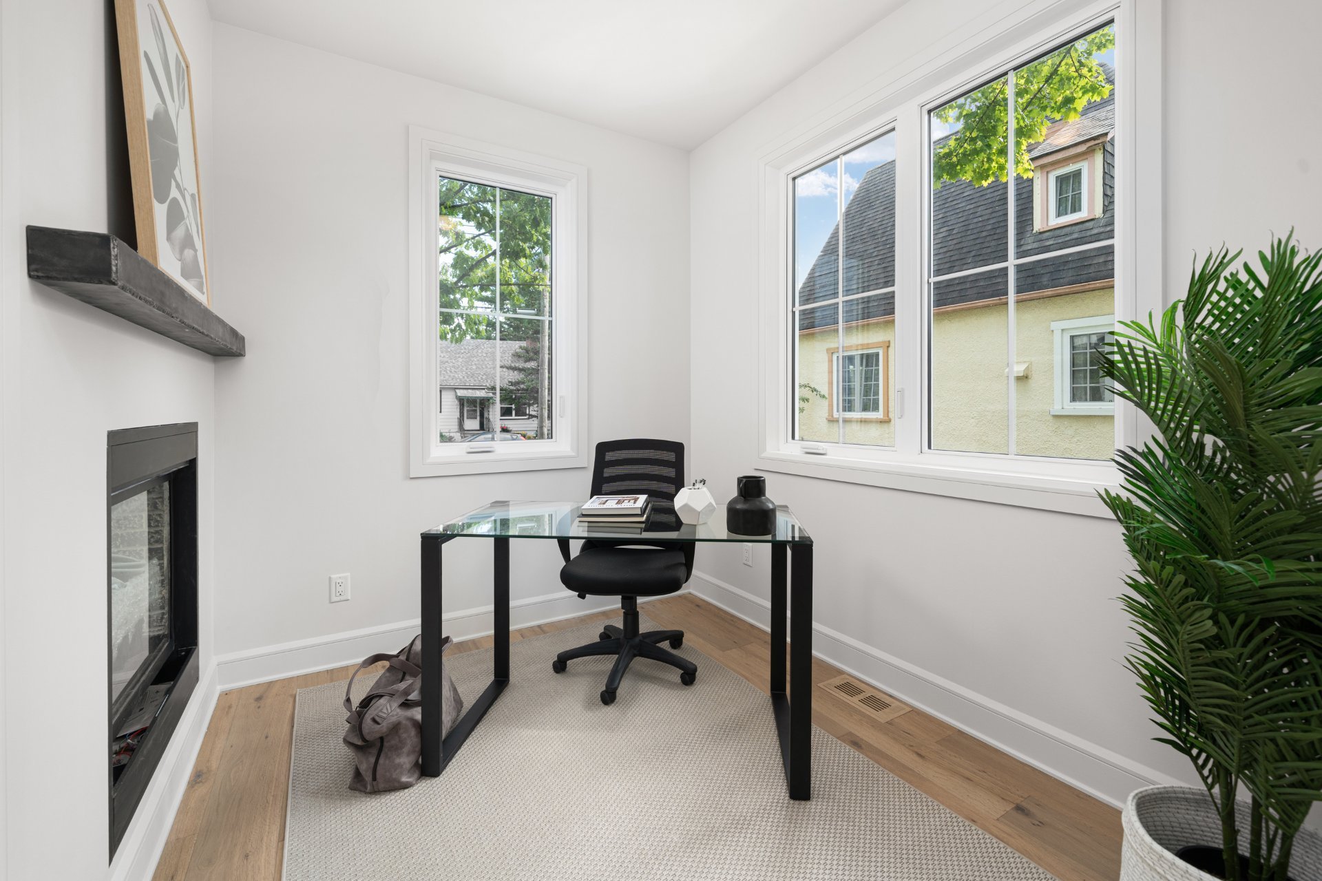 Le rez-de-chaussée propose un vaste espace à aire ouverte baigné de lumière, avec planchers de bois franc larges et finitions haut de gamme. La cuisine gourmet, équipée de comptoirs en quartz, d’un grand îlot, d’un cellier et d’un garde-manger avec rangements sur mesure, s’ouvre sur la salle à manger et sur une terrasse couverte en bois donnant sur la cour arrière. Le salon, doté d’un foyer au gaz double face partagé avec le bureau à domicile, crée une ambiance chaleureuse et raffinée. Un vestibule pratique avec accès à la cour et au garage double ajoute à la fonctionnalité.