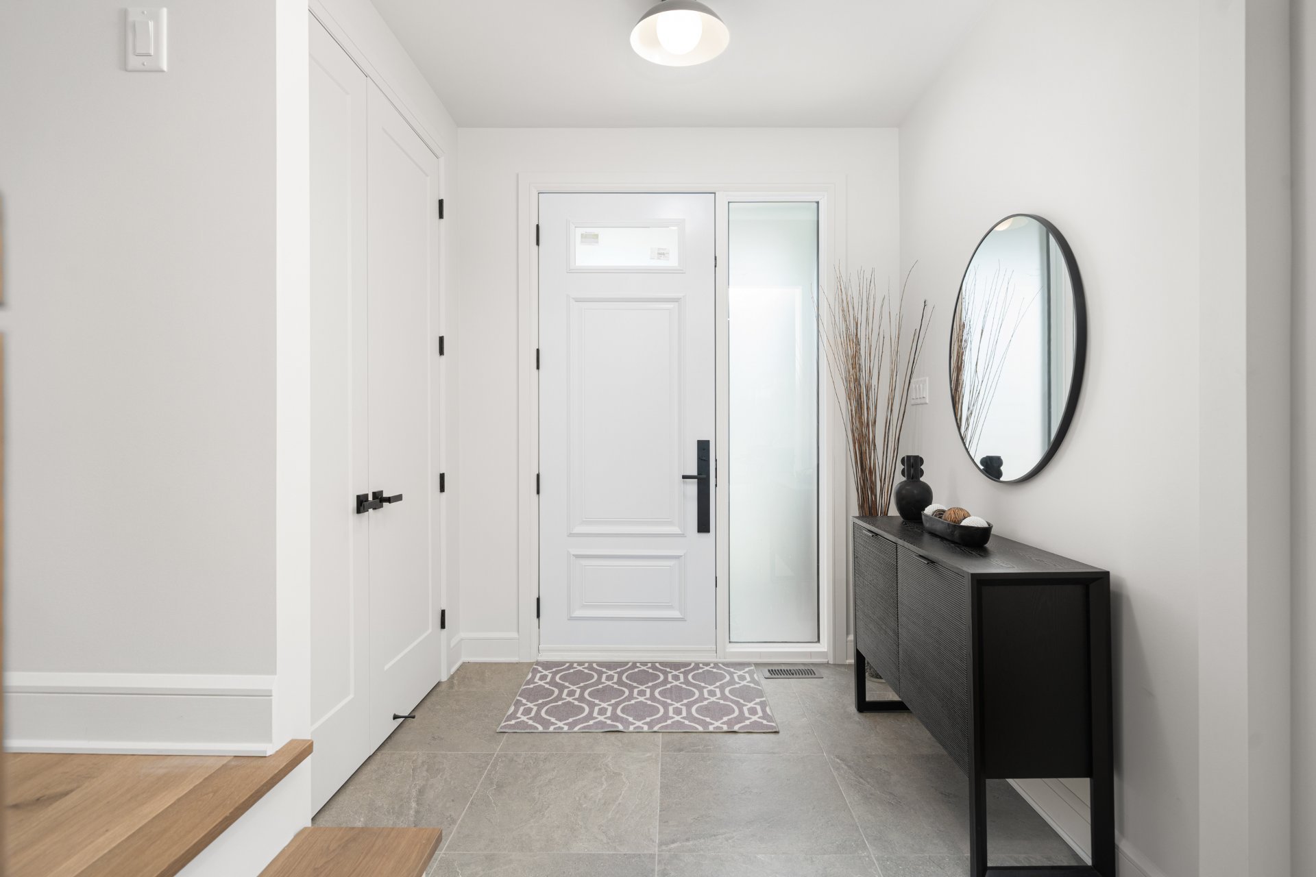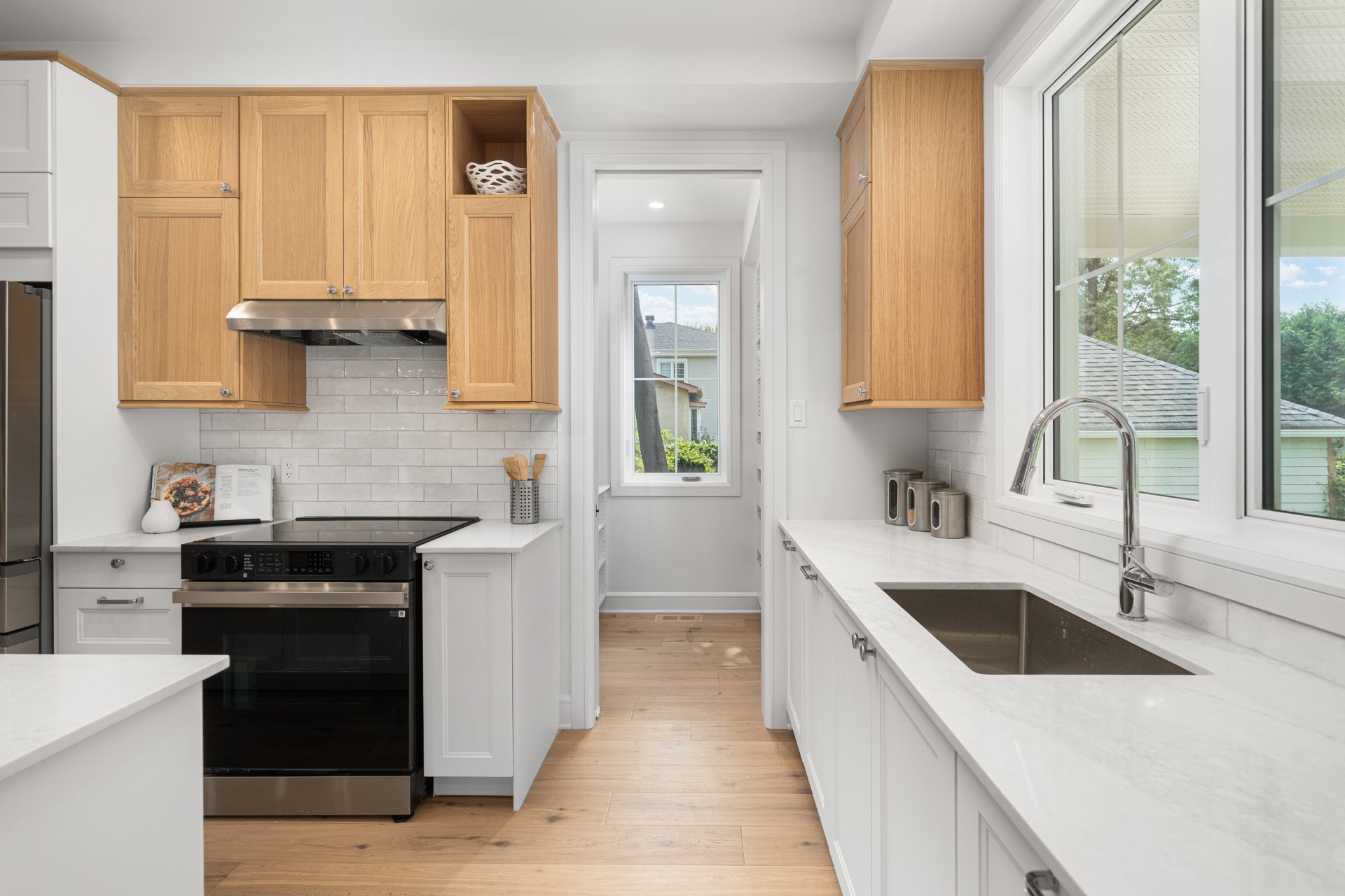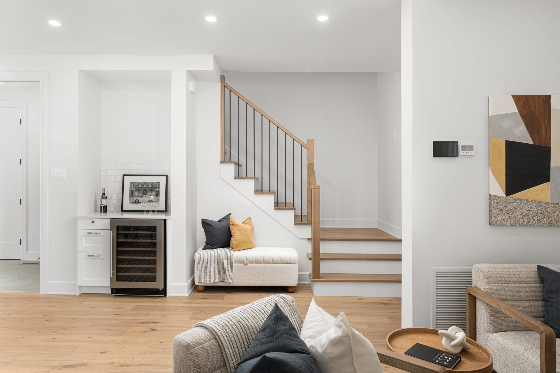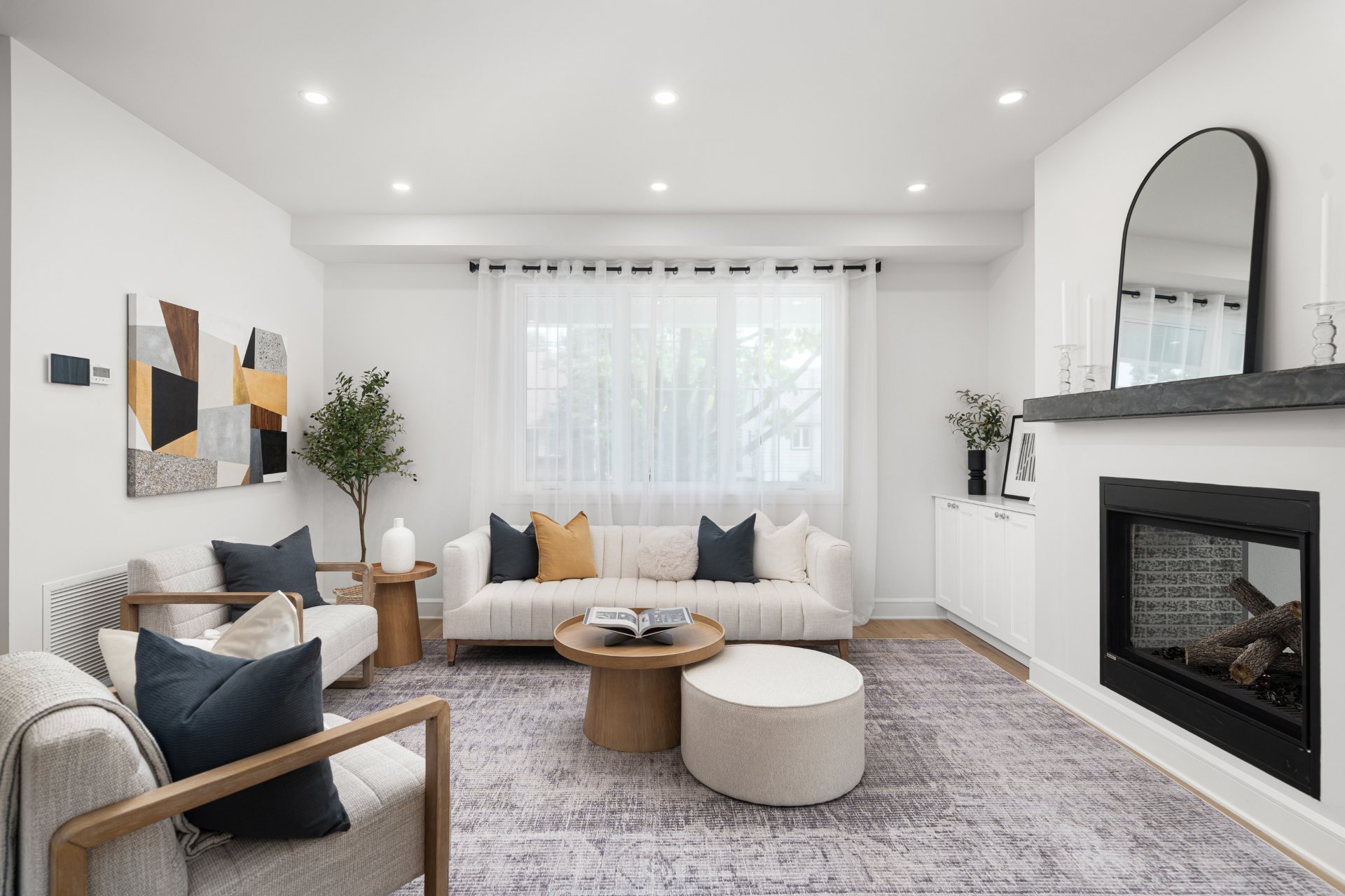 Le rez-de-chaussée propose un vaste espace à aire ouverte baigné de lumière, avec planchers de bois franc larges et finitions haut de gamme. La cuisine gourmet, équipée de comptoirs en quartz, d’un grand îlot, d’un cellier et d’un garde-manger avec rangements sur mesure, s’ouvre sur la salle à manger et sur une terrasse couverte en bois donnant sur la cour arrière. Le salon, doté d’un foyer au gaz double face partagé avec le bureau à domicile, crée une ambiance chaleureuse et raffinée. Un vestibule pratique avec accès à la cour et au garage double ajoute à la fonctionnalité.