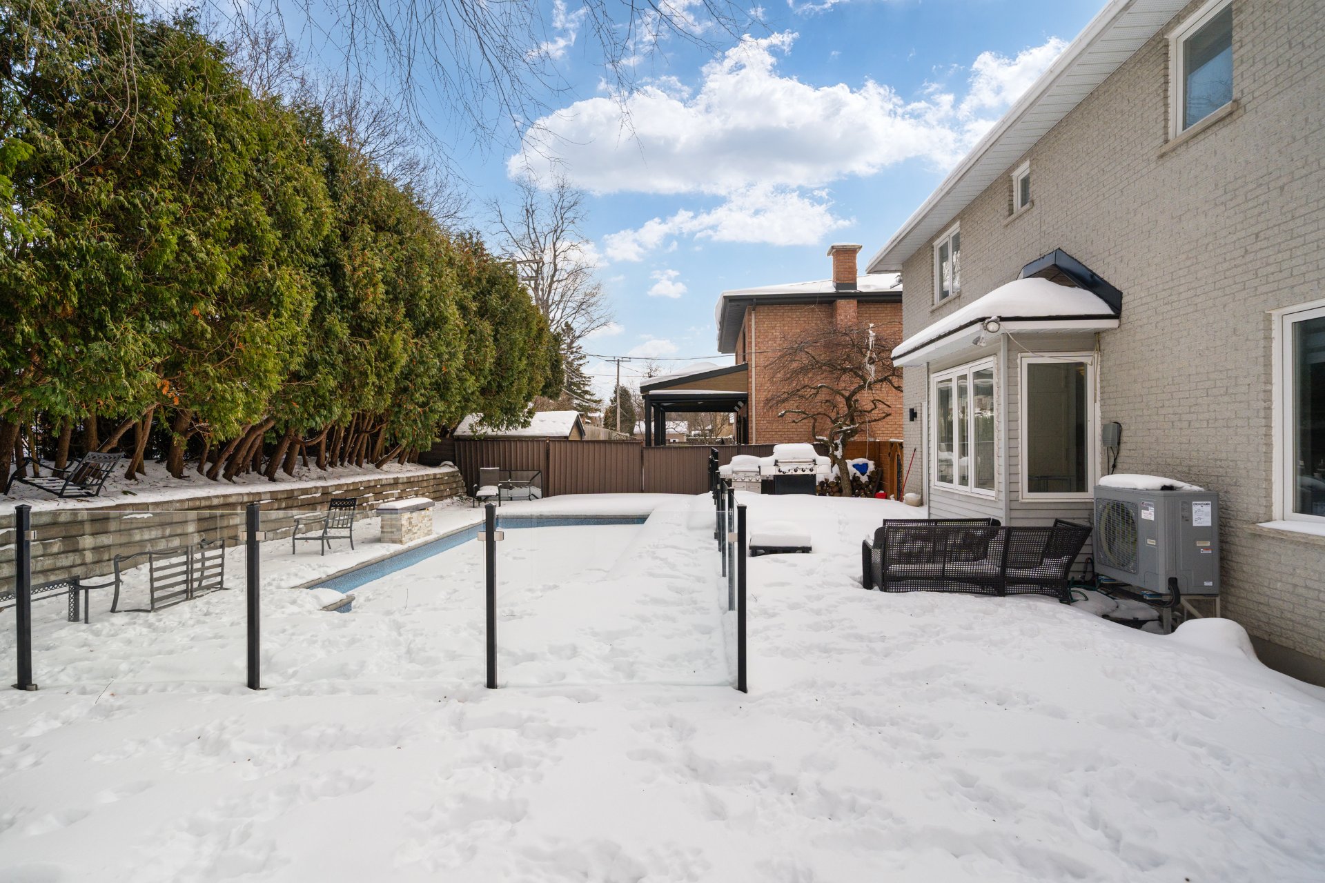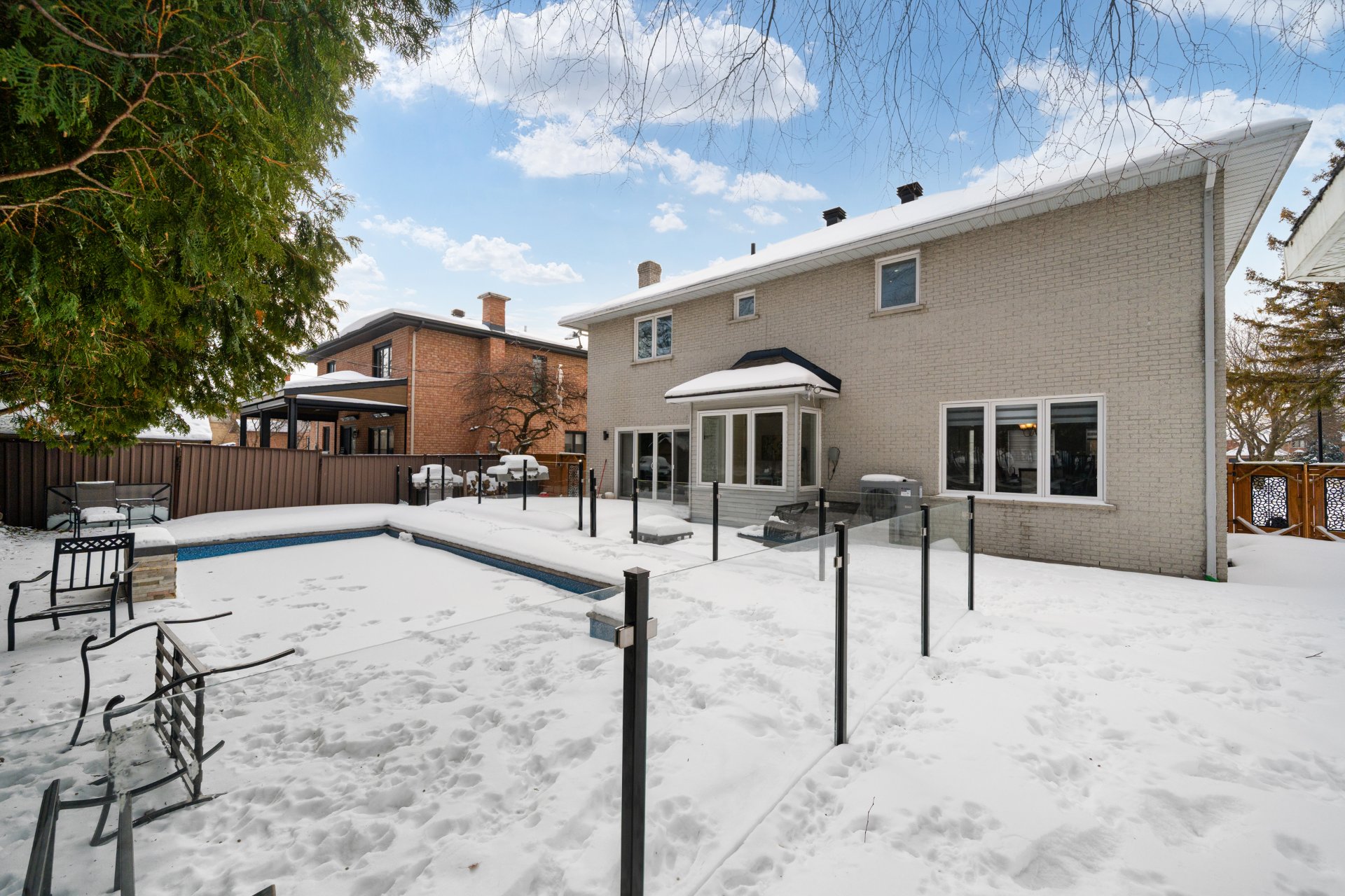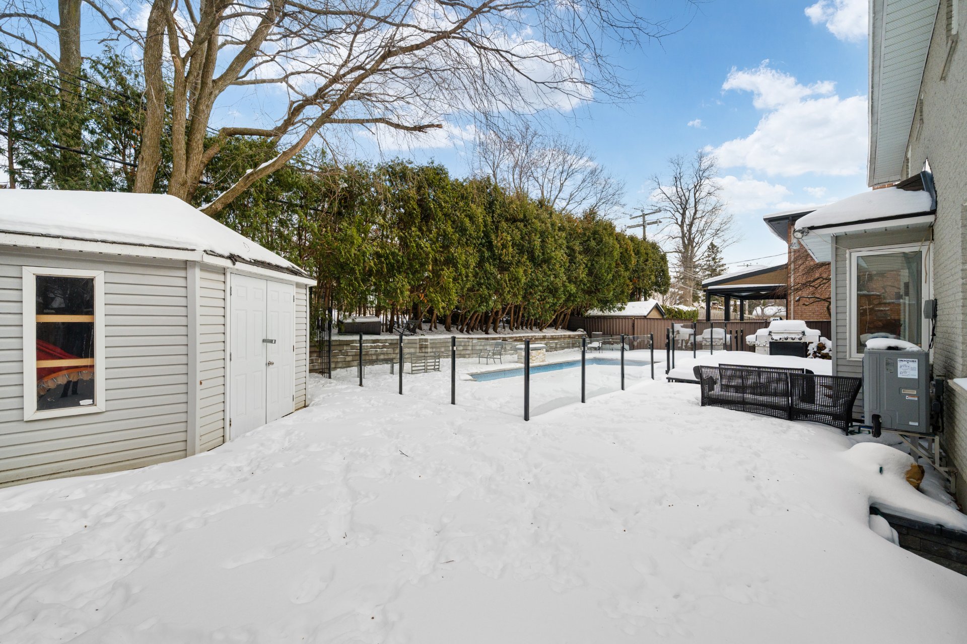 À l’extérieur, la cour arrière intime se transforme en véritable havre estival, idéal pour les barbecues, les réceptions ou la détente au bord de la piscine (sys. sel). Les arbres matures assurent intimité et tranquillité, tandis qu’une clôture récemment installée encadre la propriété. L’entrée de garage et le garage offrent amplement d’espace pour le stationnement et le rangement.