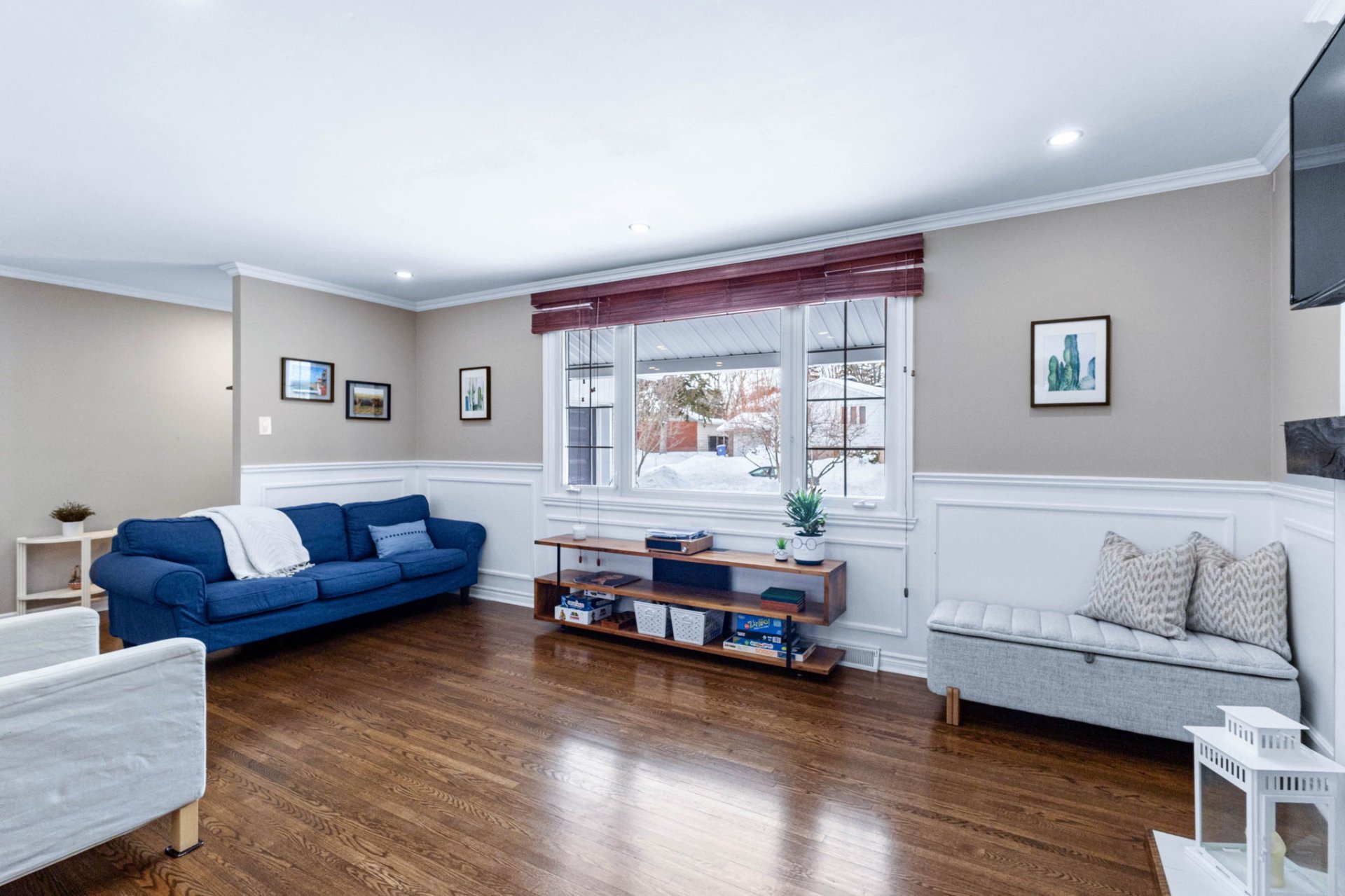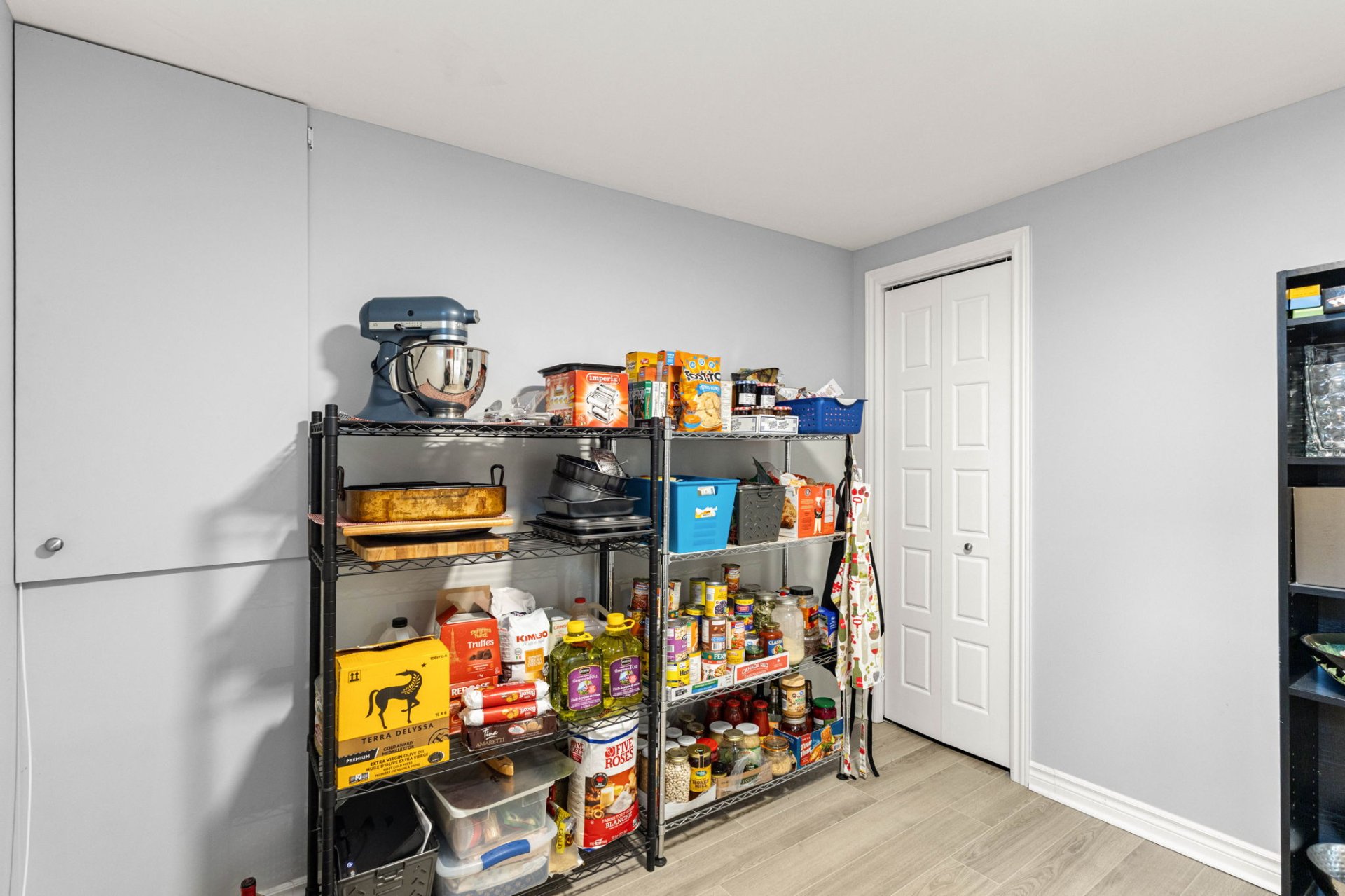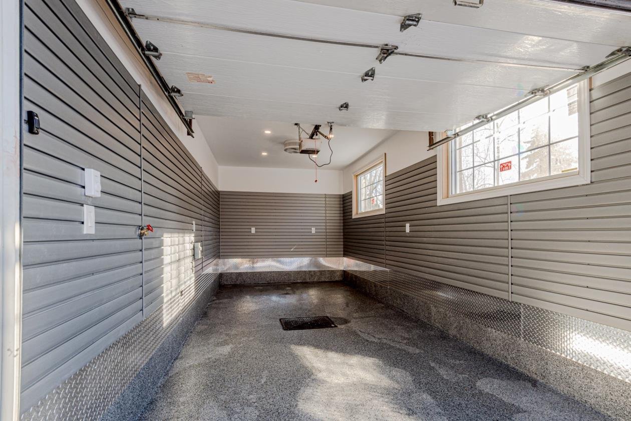 La propriété comprend également un garage rénové avec un plancher en époxy durable et un système de rangement mural de type slatwall, offrant un espace propre, organisé et hautement fonctionnel.