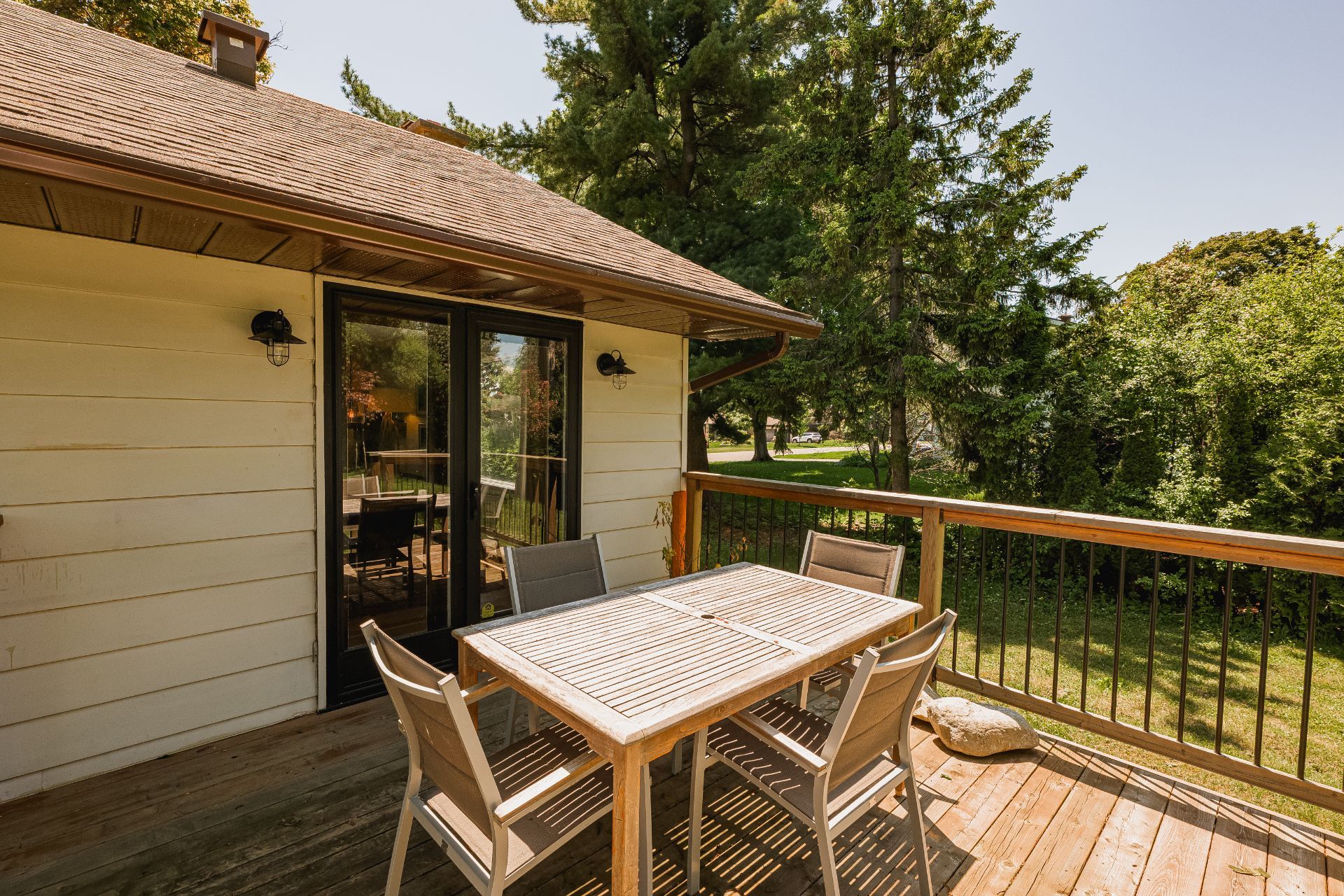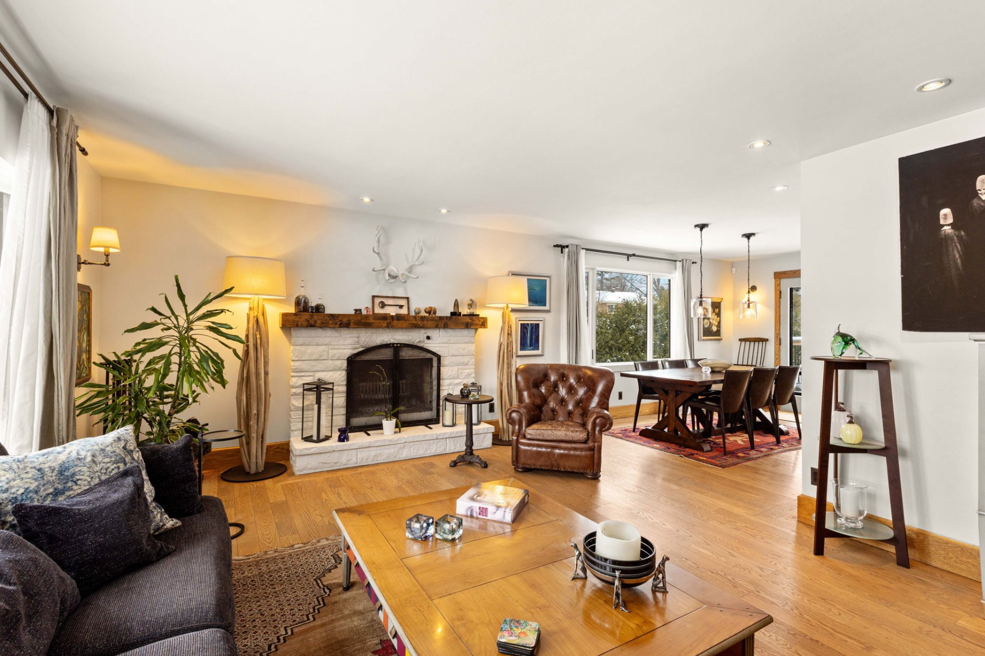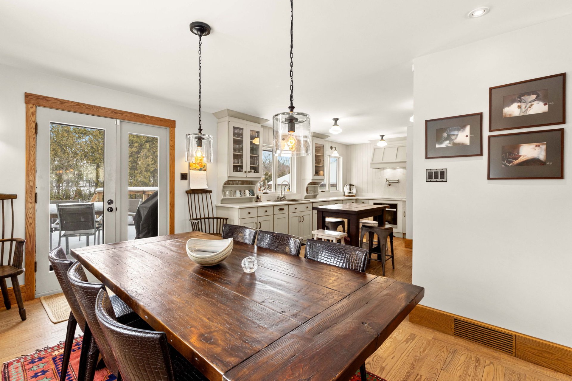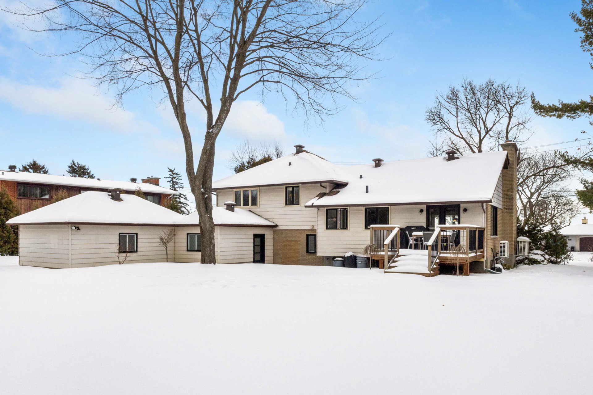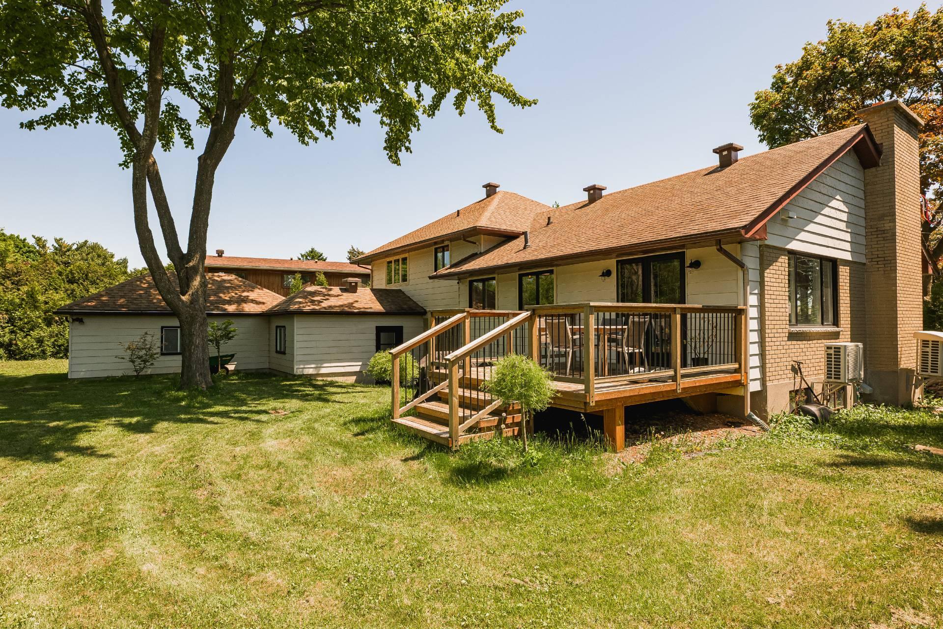 Dès l’entrée, un hall ouvert et accueillant vous mène à un salon baigné de lumière, agrémenté d’un charmant foyer en pierre au bois avec manteau en bois antique. La grande salle à manger s’ouvre, par des portes françaises, sur une vaste terrasse en bois – idéale pour recevoir à l’extérieur et profiter de la cour arrière privée et spacieuse.