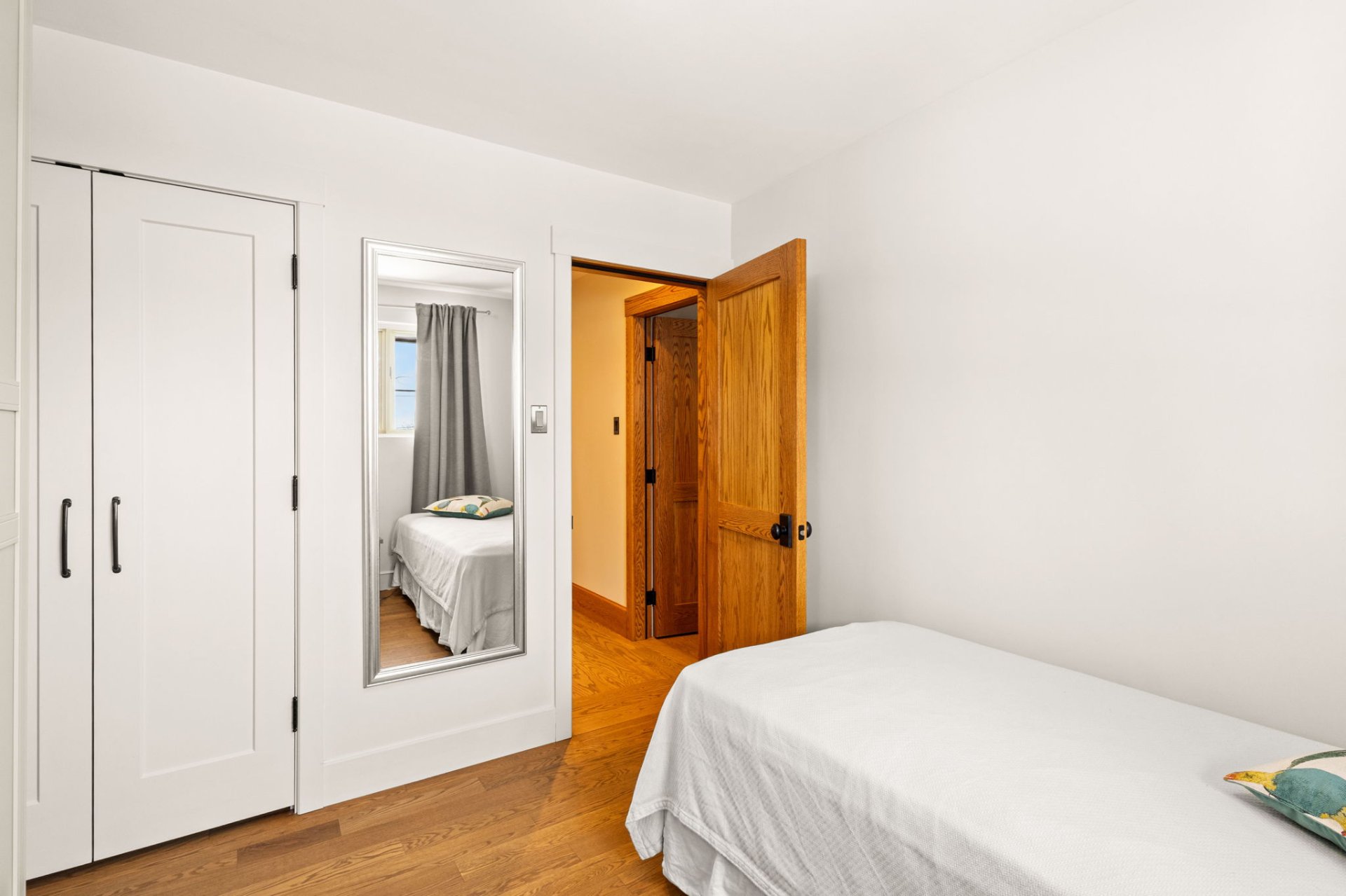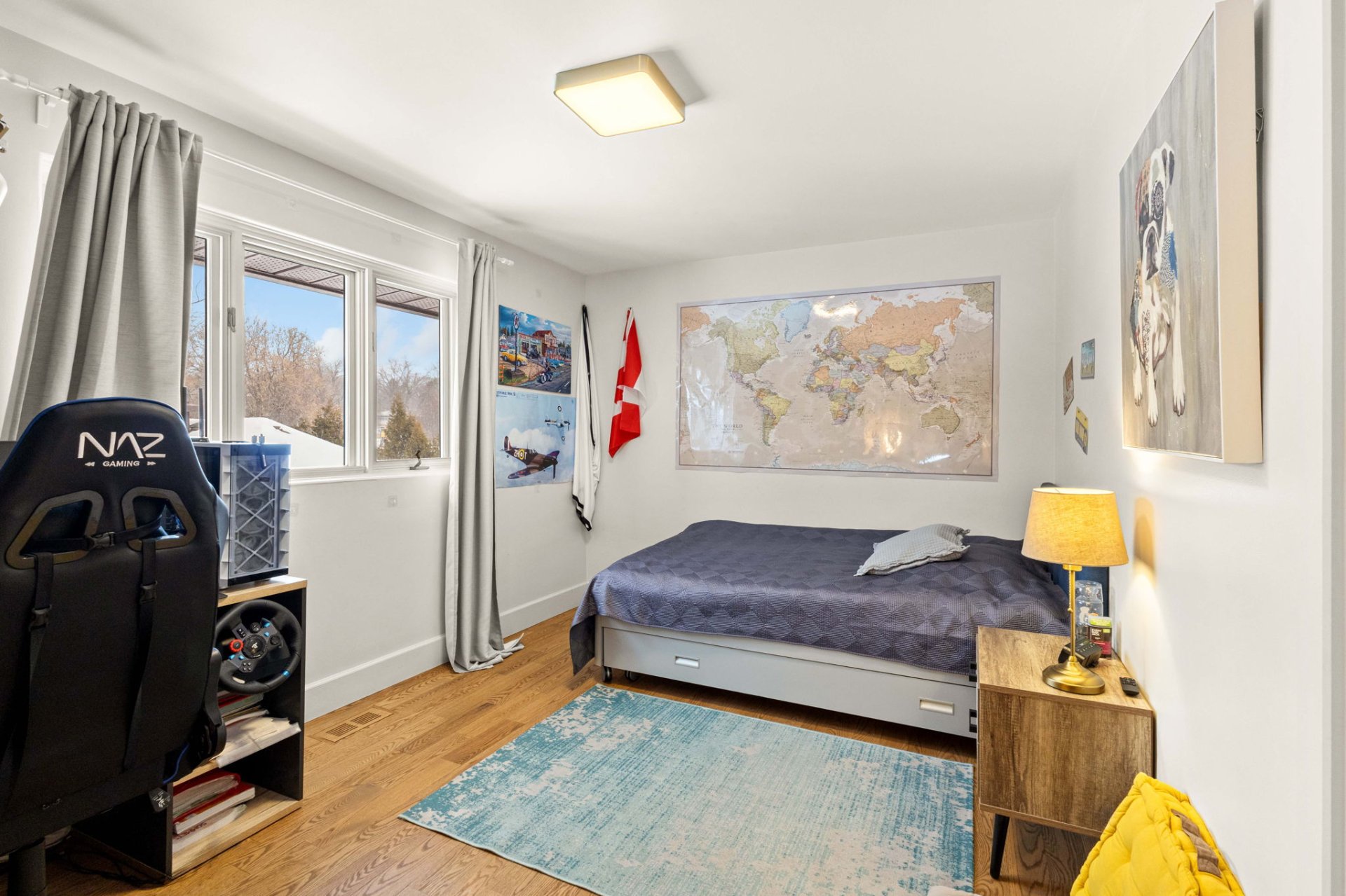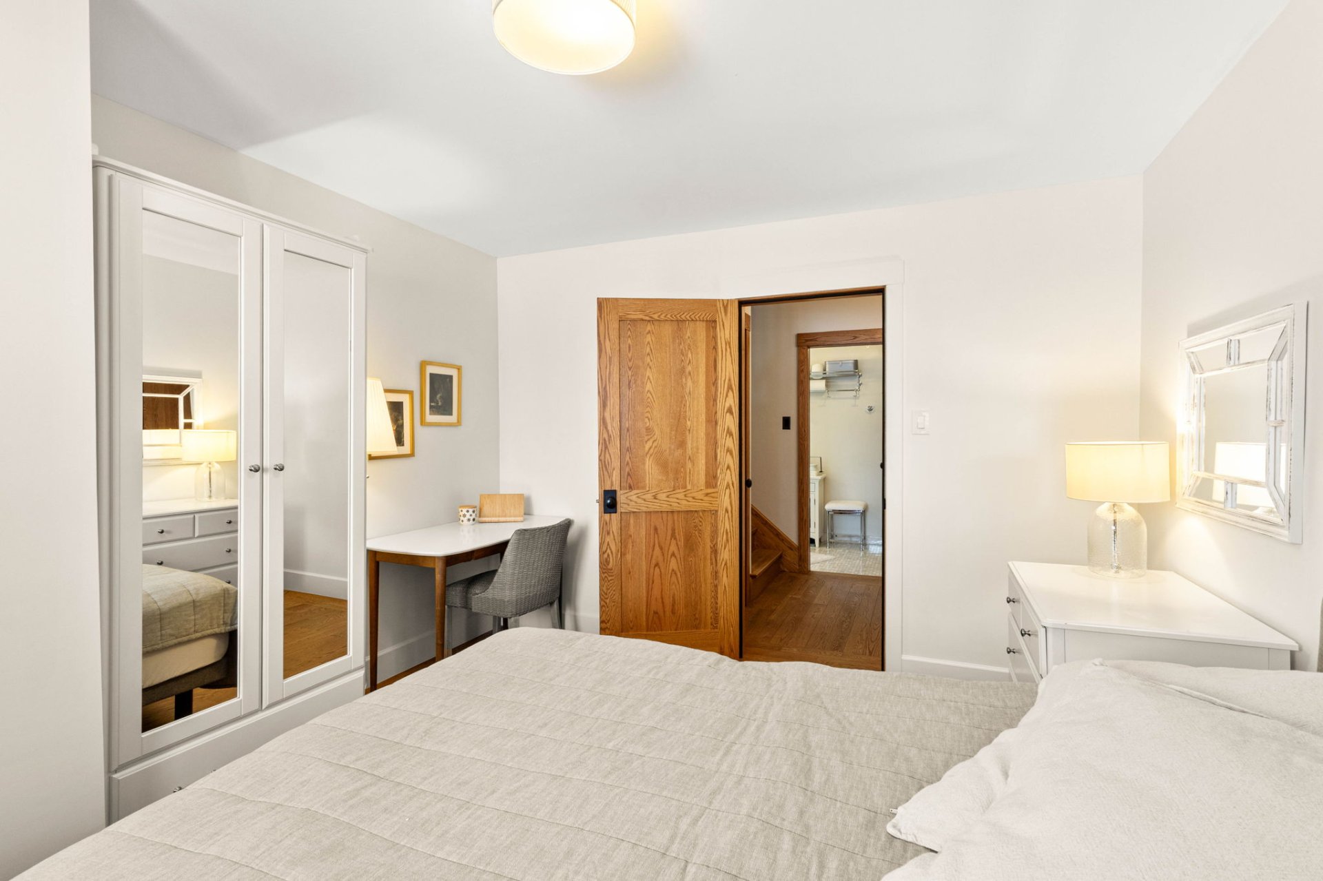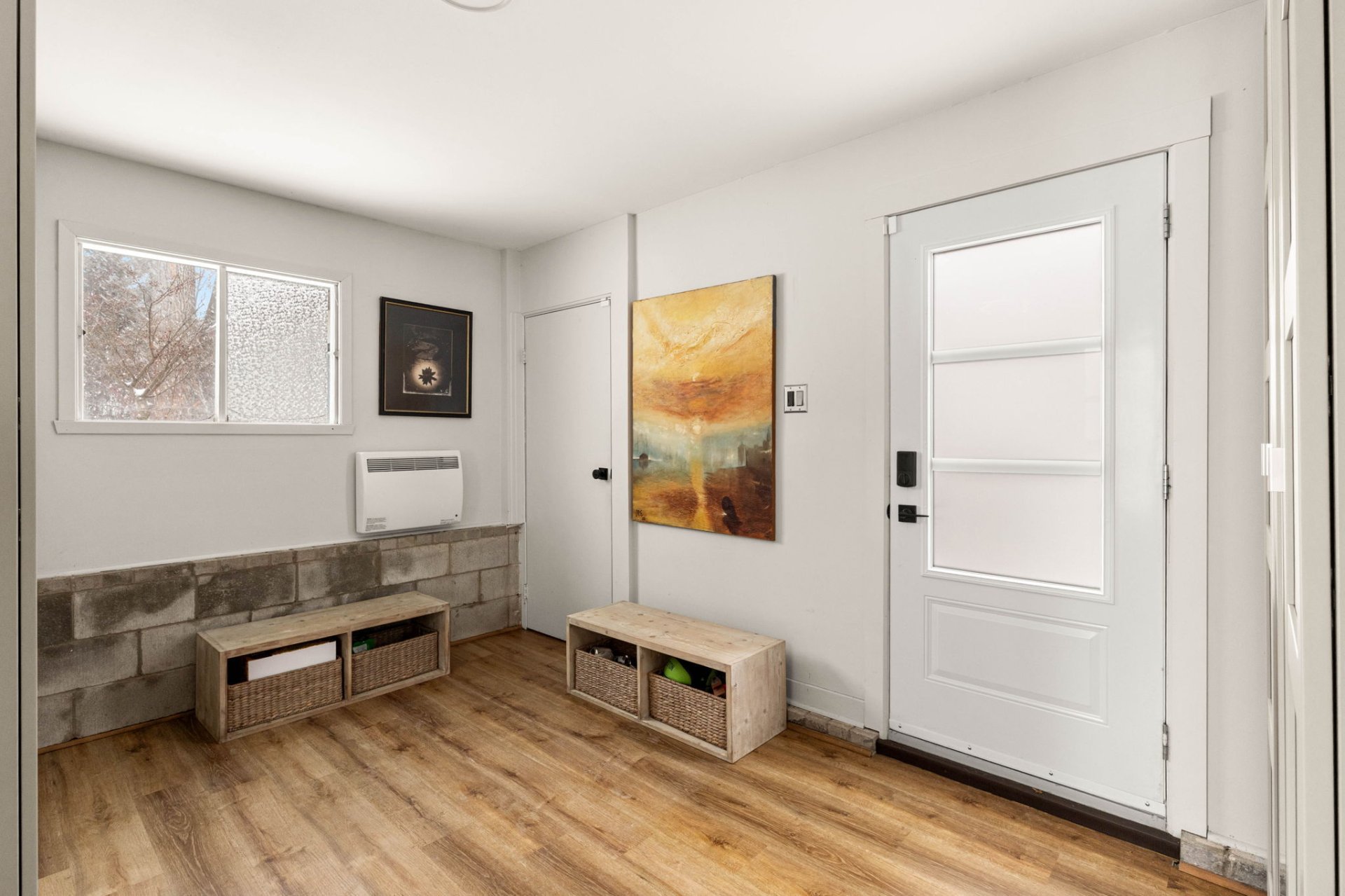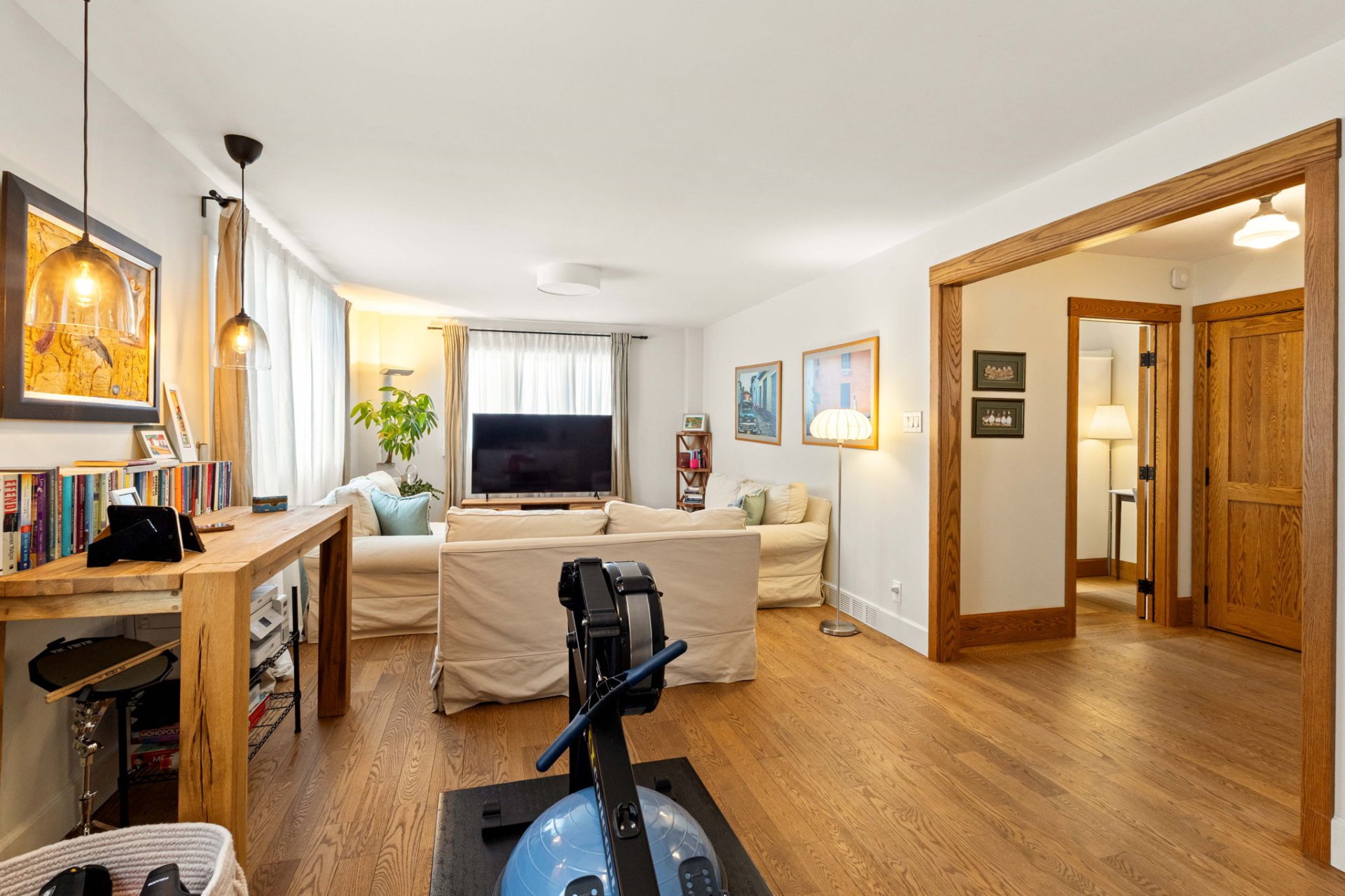 Le rez-de-jardin lumineux et aéré comprend une salle familiale confortable avec de grandes fenêtres, une quatrième chambre et une deuxième salle de bain complète. Ce niveau donne également accès à un pratique vestibule de service (mudroom), relié à la fois à la cour arrière et au garage attenant.