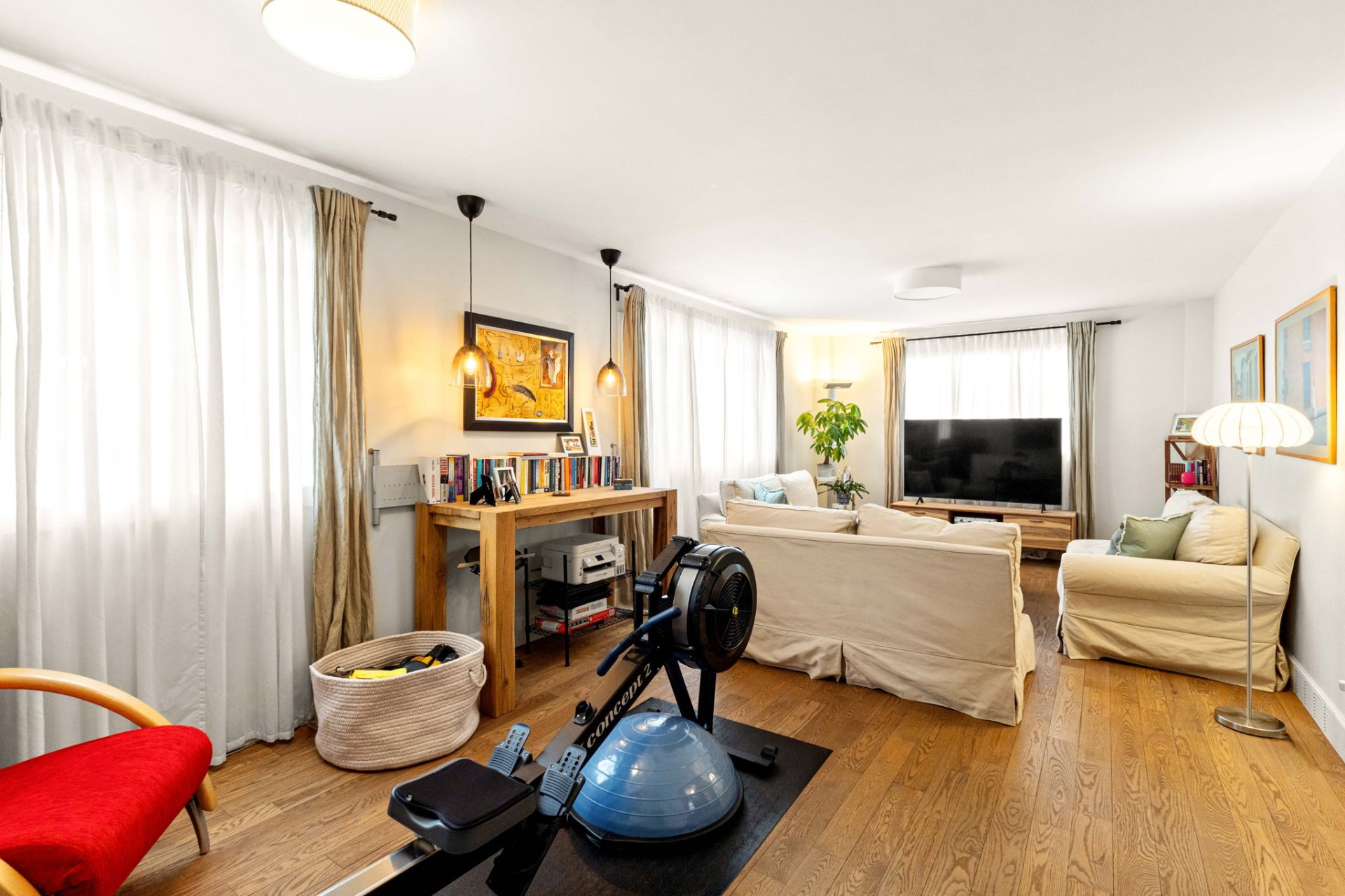 Le sous-sol entièrement aménagé propose une grande salle de jeux ainsi que de nombreux espaces de rangement, offrant une polyvalence idéale pour toute la famille.