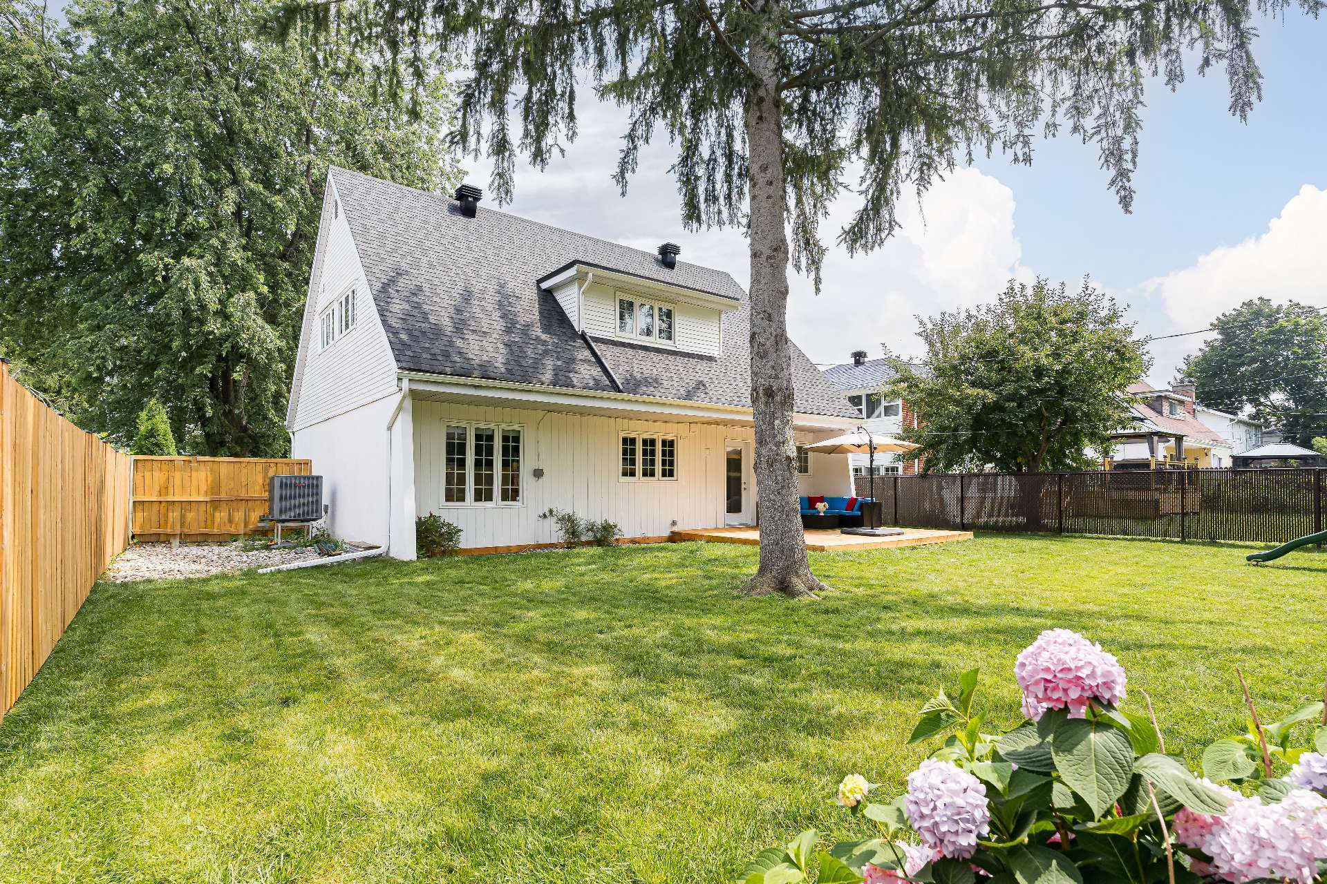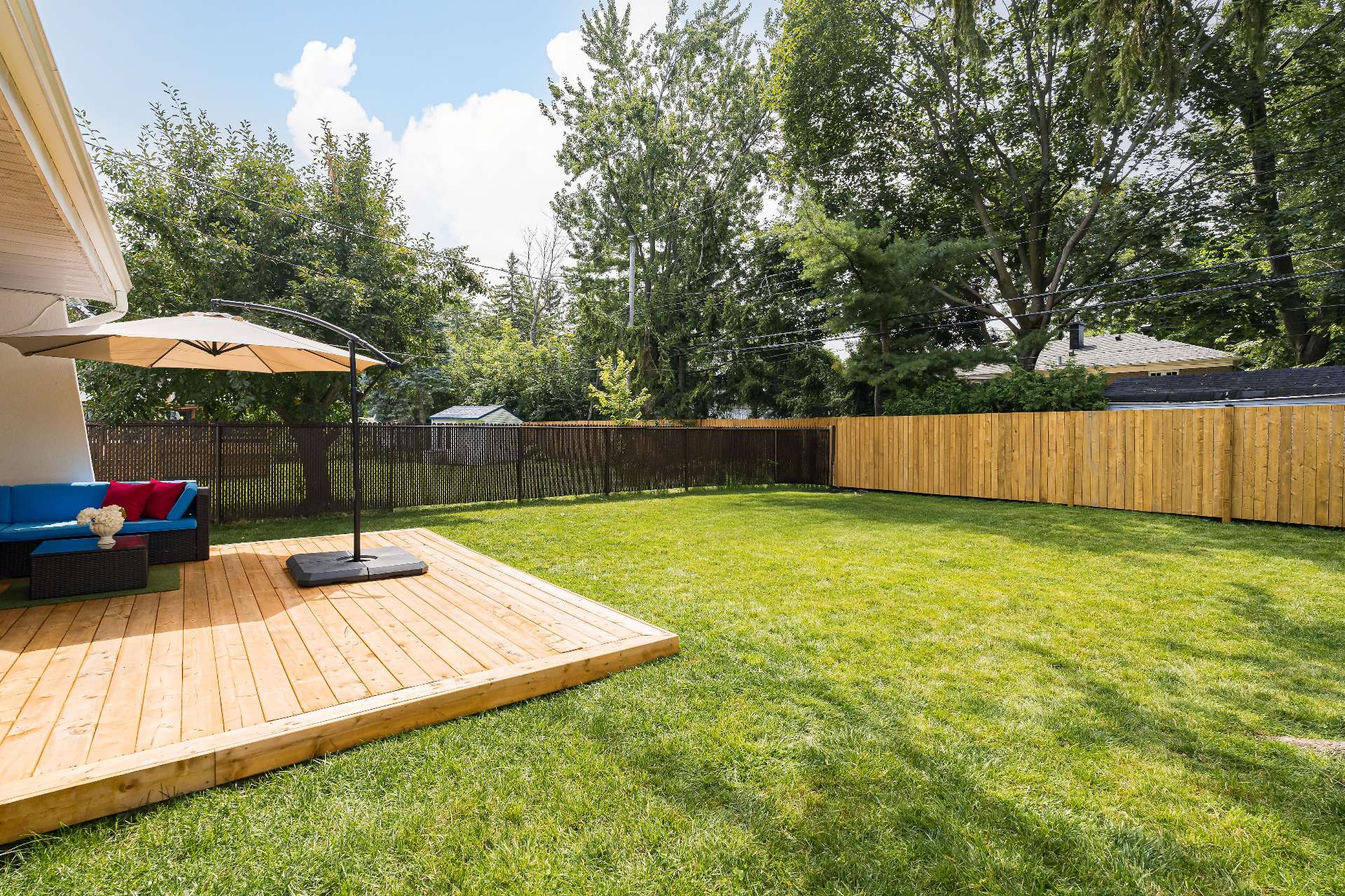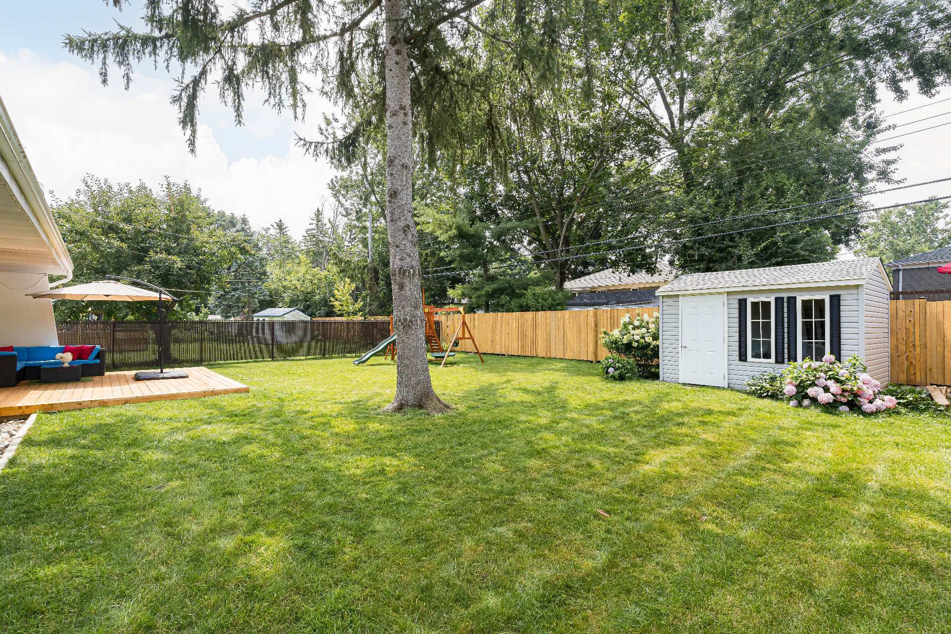 À l’extérieur, la cour arrière orientée à l’ouest est entièrement clôturée et soigneusement aménagée, comprenant un cabanon et une terrasse en bois. Entourée d’arbres matures et de verdure, elle constitue un véritable havre de paix pour profiter des beaux jours.