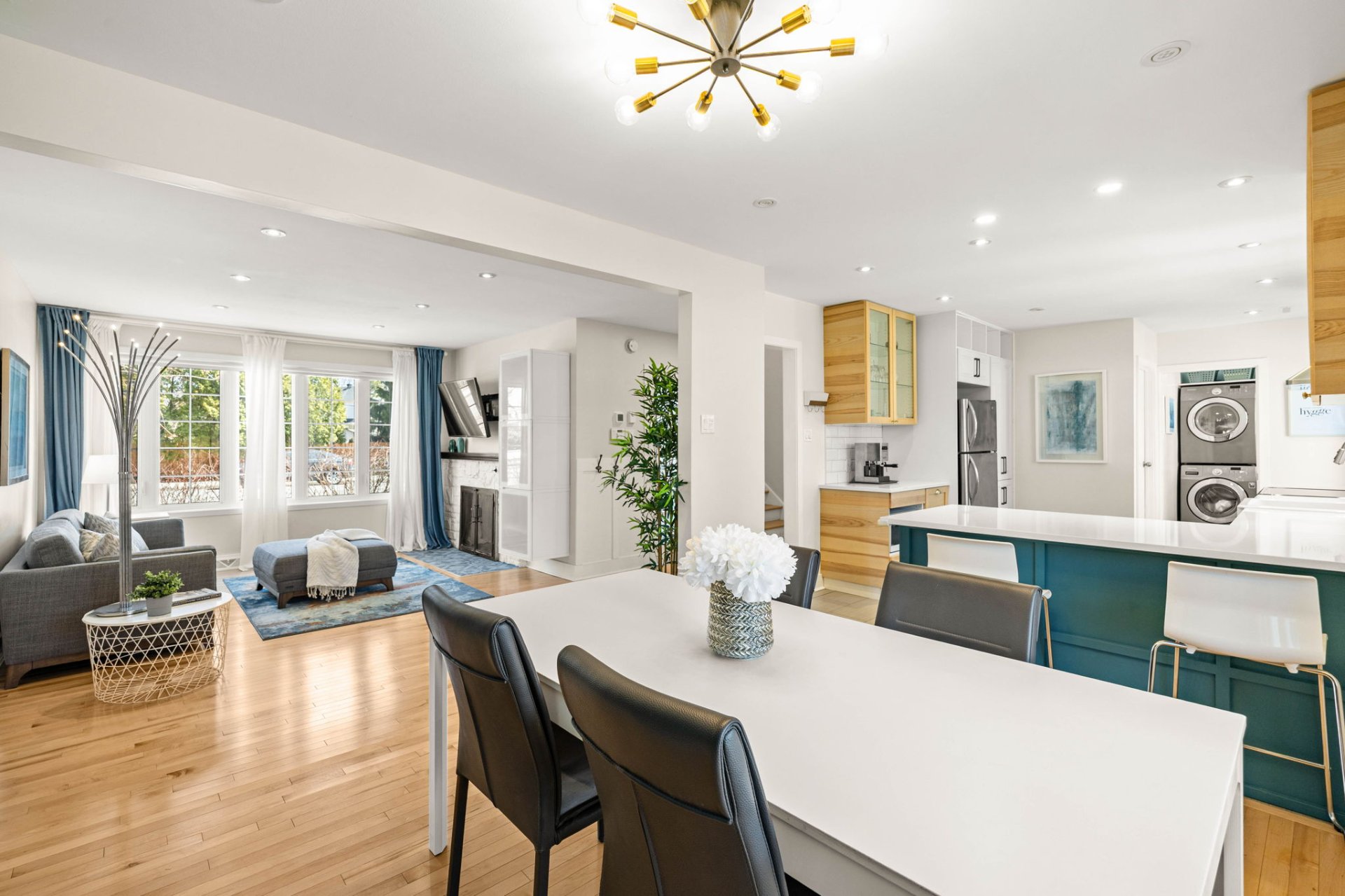 Le rez-de-chaussée vous accueille avec un salon lumineux et spacieux doté de grandes fenêtres et d’un chaleureux foyer au bois. La cuisine contemporaine s’ouvre harmonieusement sur la salle à manger, offrant un espace à aire ouverte élégant, idéal pour recevoir. À proximité de la cuisine, vous trouverez une salle d’eau pratique combinée à un espace buanderie, ainsi qu’un accès direct au garage et à la cour arrière.