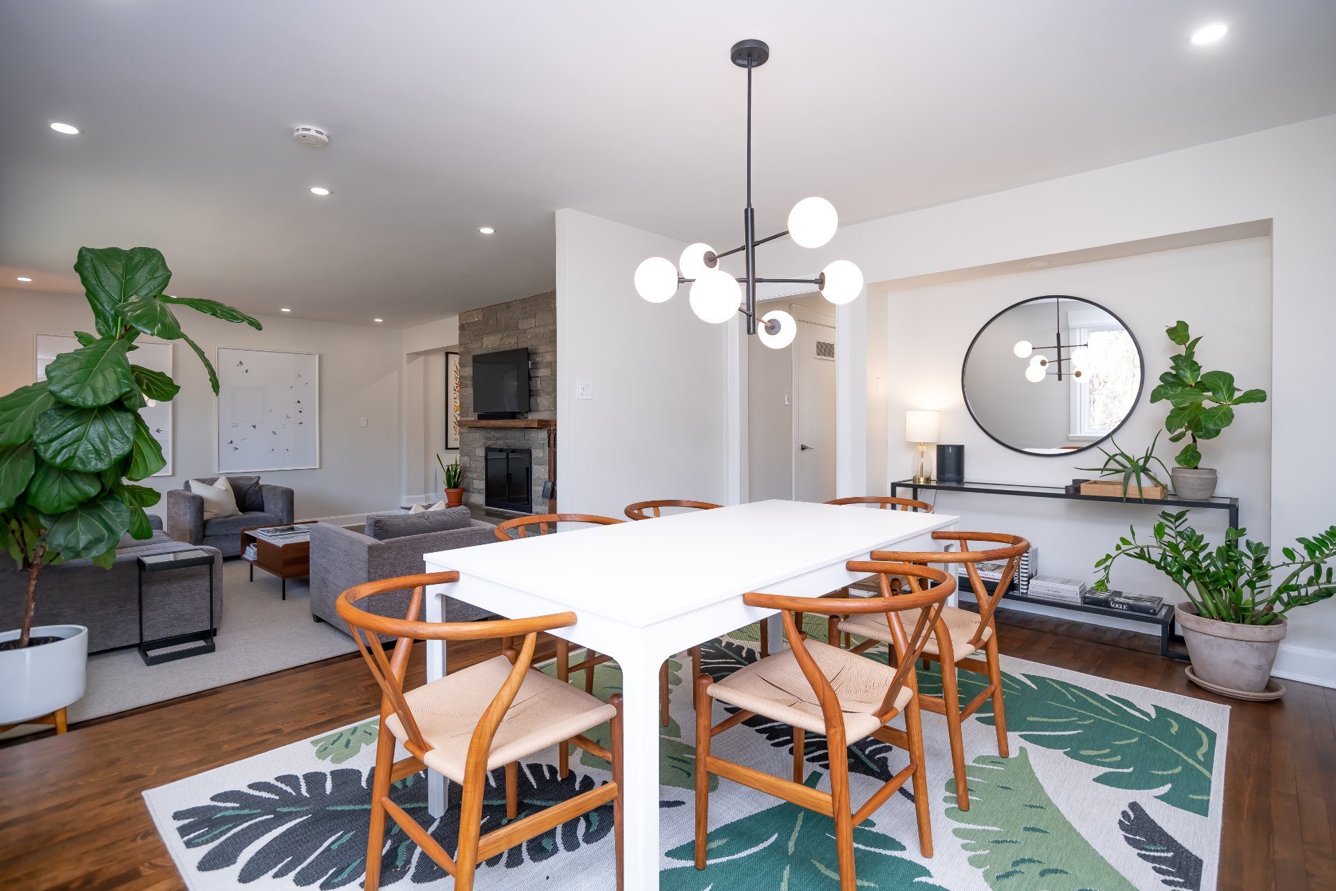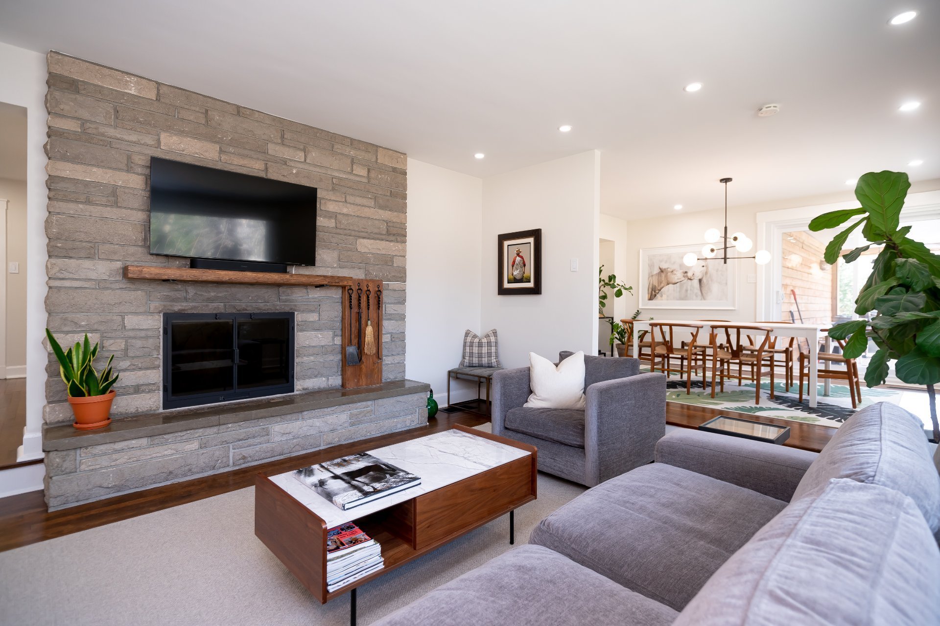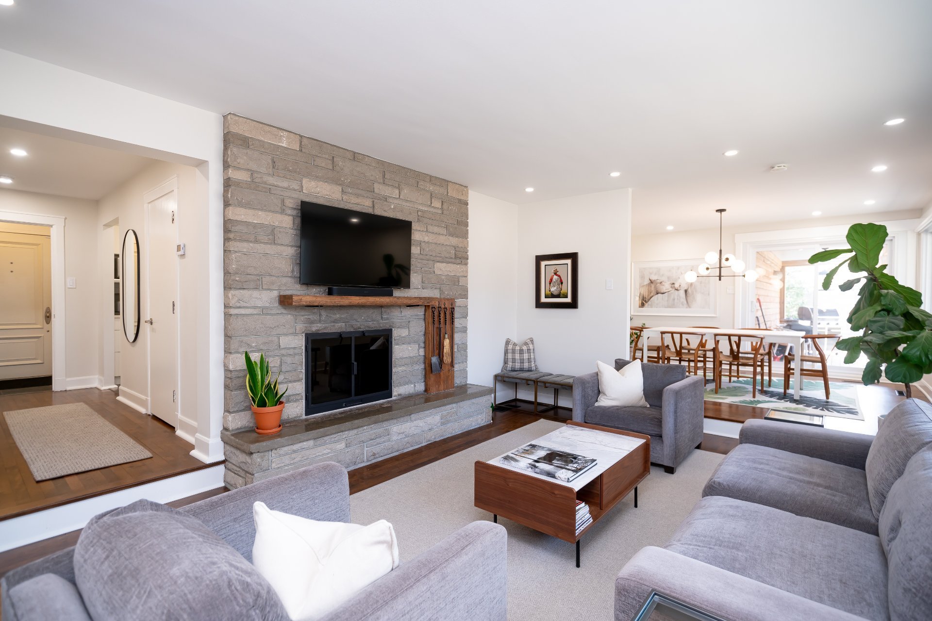 Le salon en contrebas, bordé de grandes fenêtres et doté d’un impressionnant foyer en pierre, crée une atmosphère chaleureuse et invitante, parfait pour relaxer ou partager de beaux moments en famille. La salle à manger adjacente offre un accès direct à la terrasse, facilitant les repas et réceptions à l’extérieur.