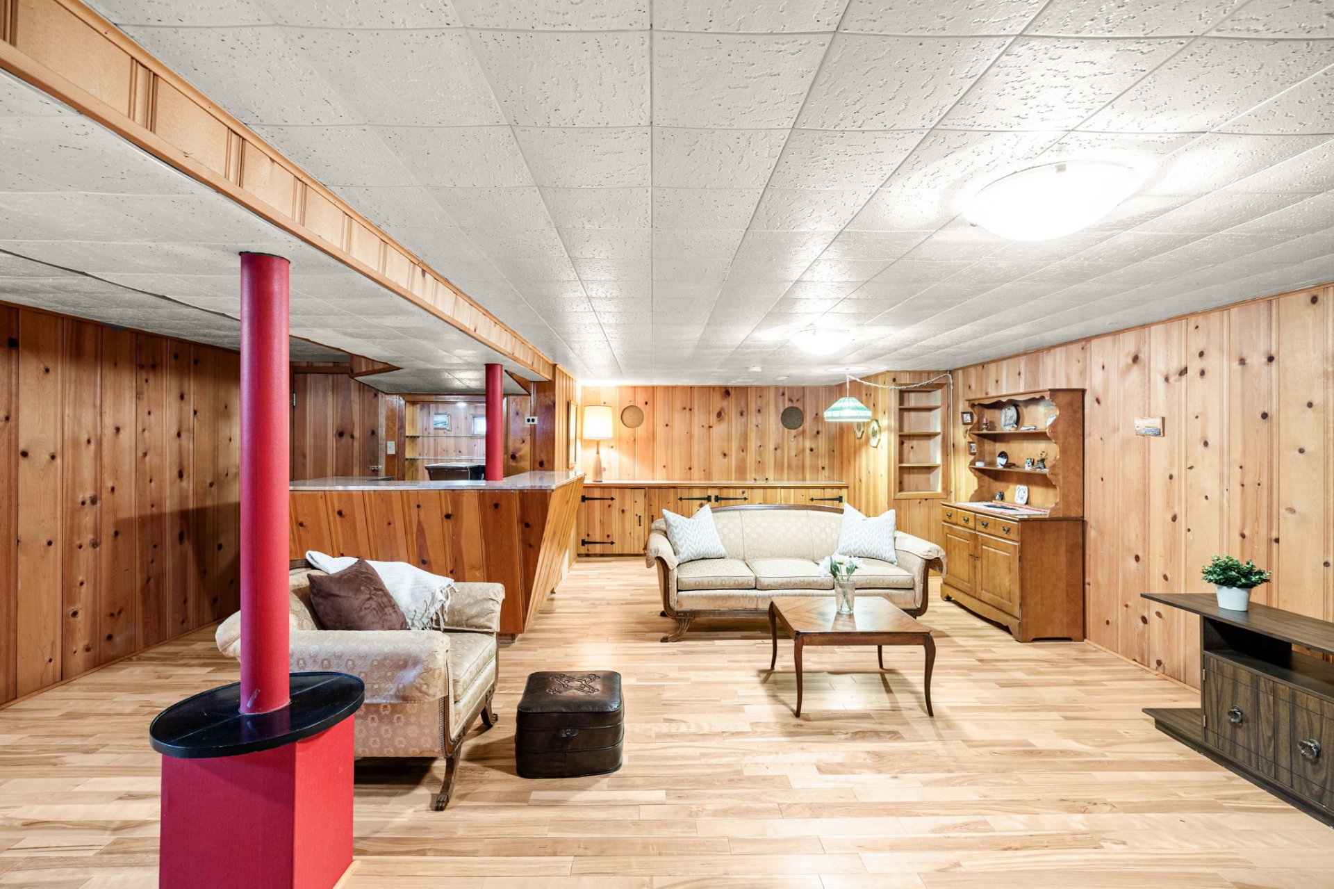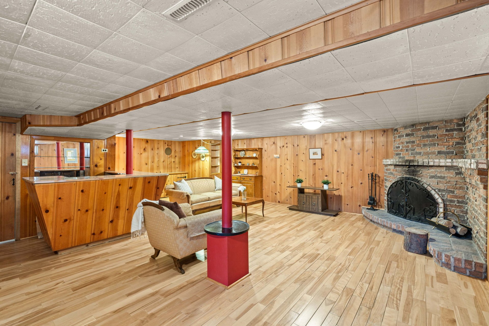 The finished basement offers a generous family room with a cozy wood-burning fireplace, an additional powder room, a dedicated laundry area, and ample storage space.