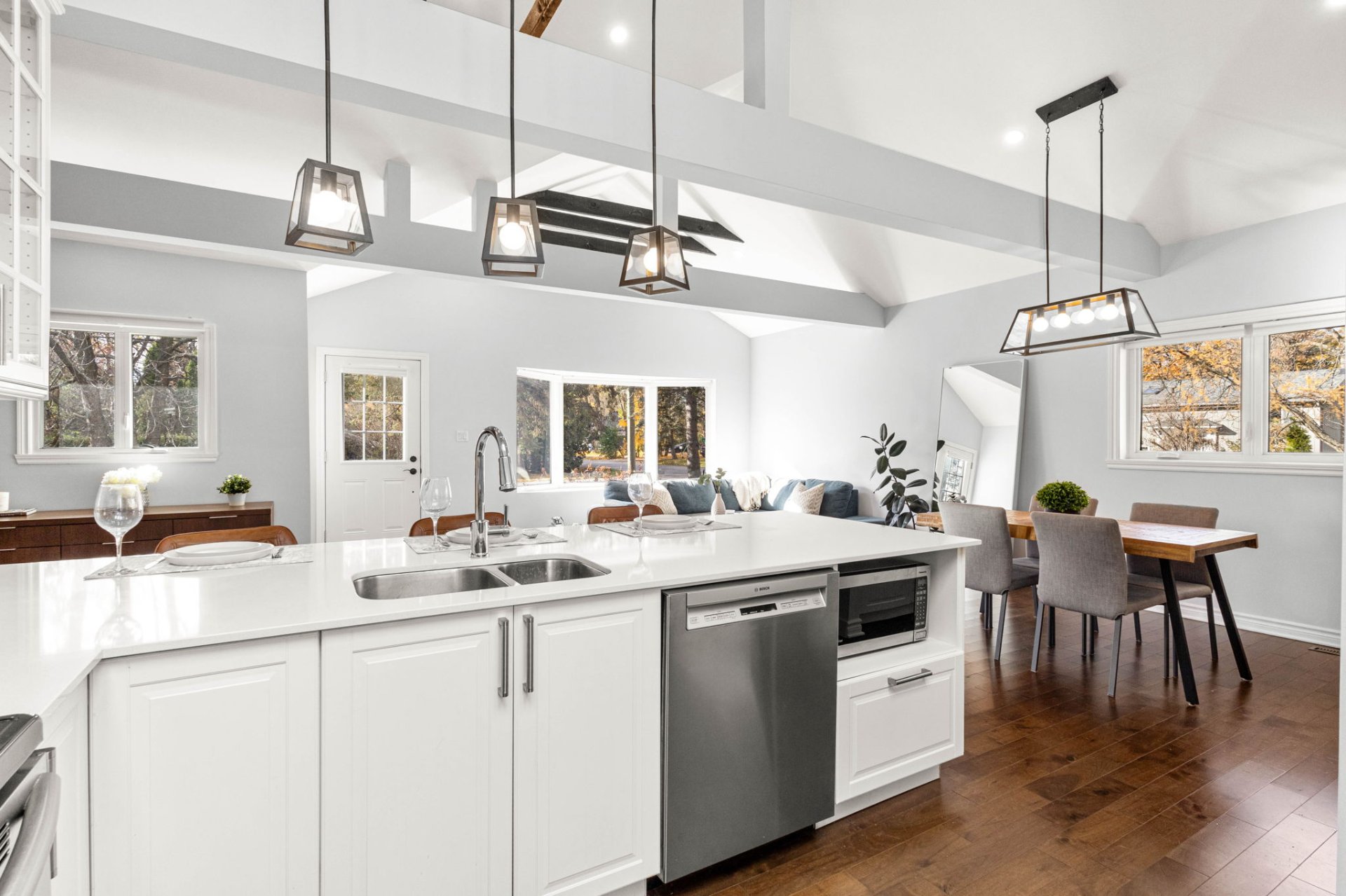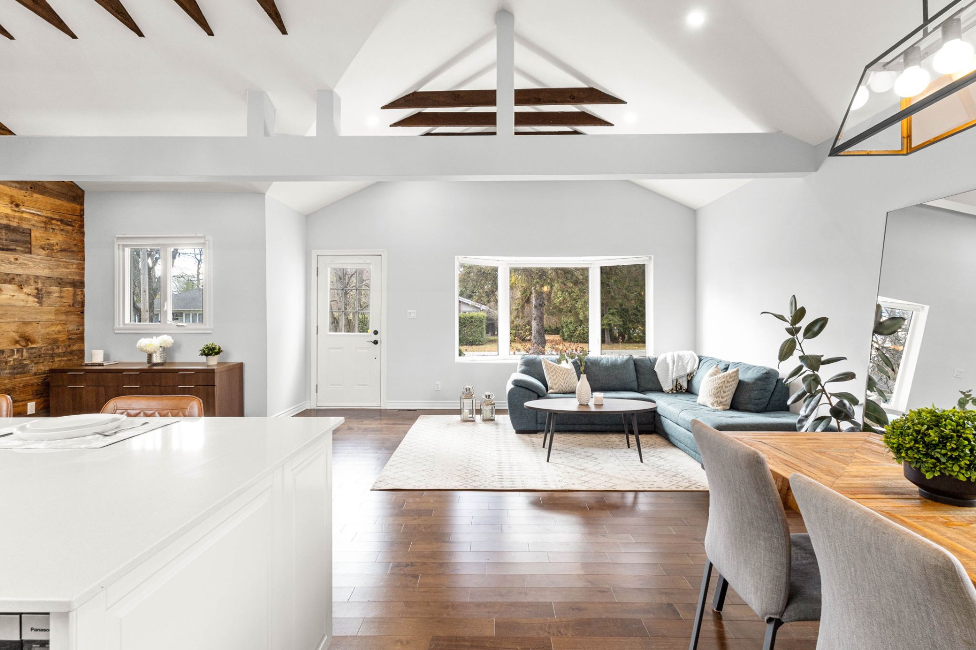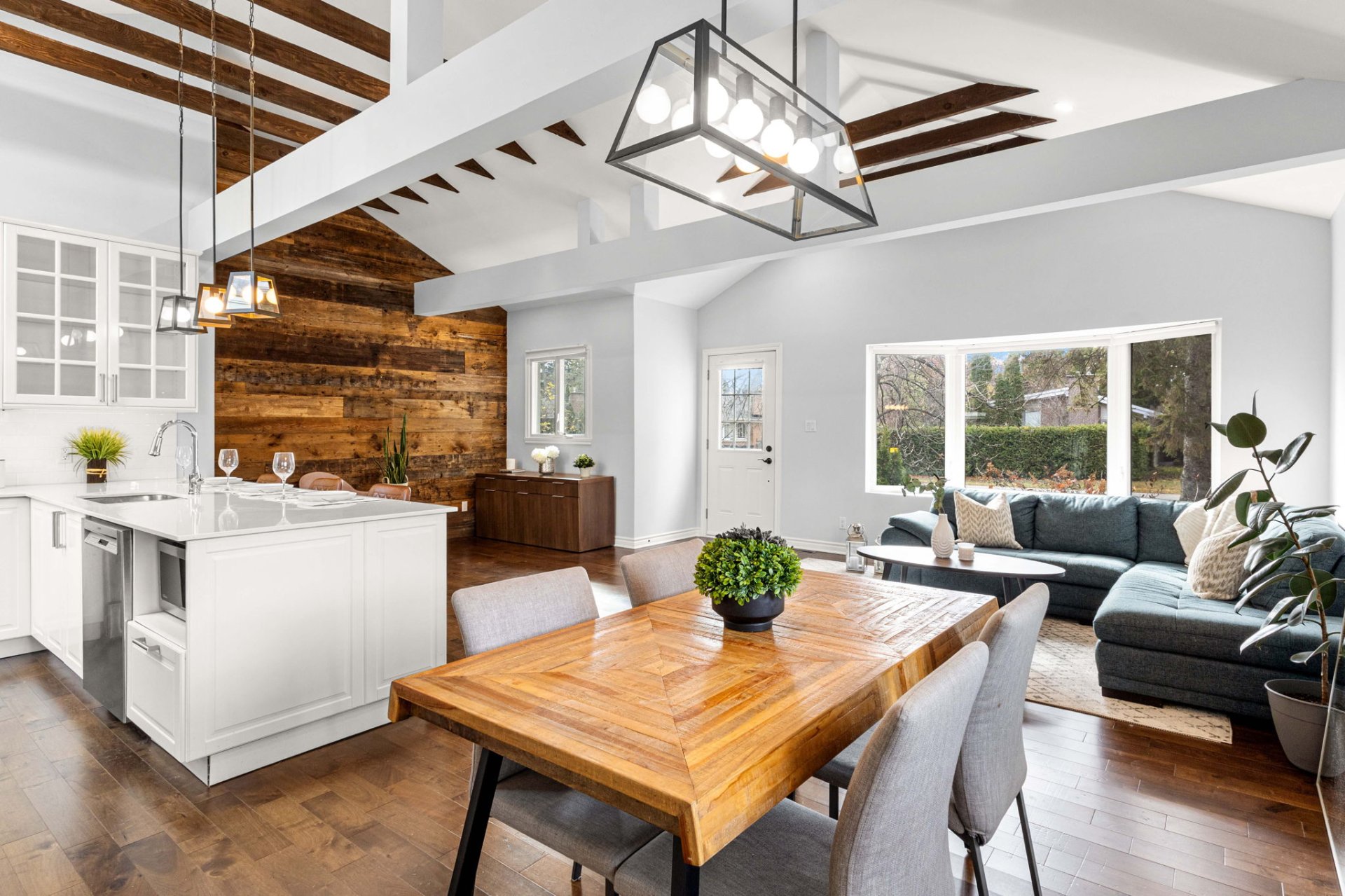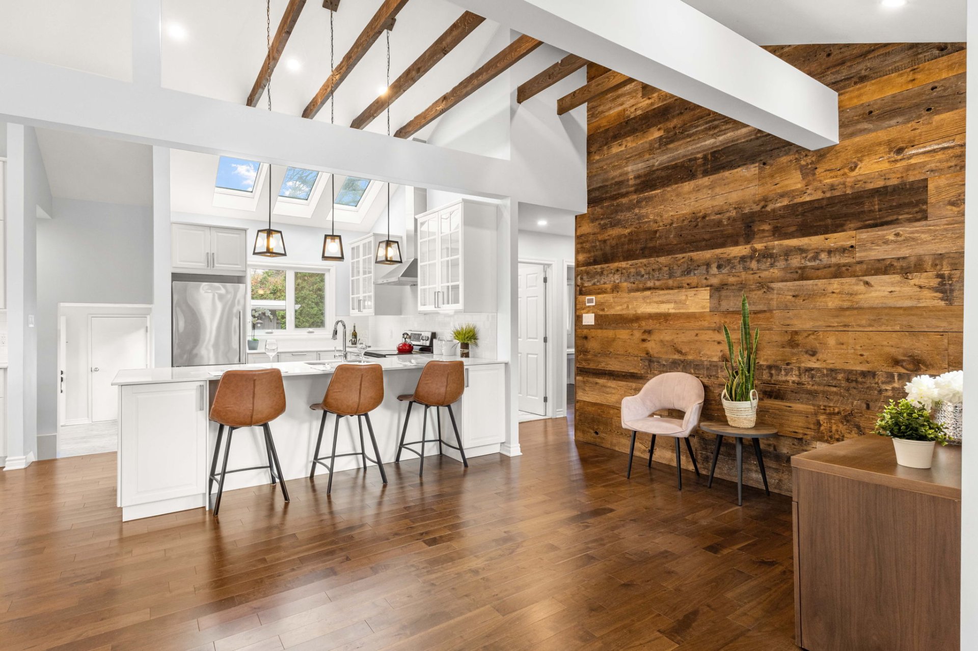 Ideally located within walking distance to parks, schools, and the Beaconsfield train station, and just minutes from shops, restaurants, grocery stores, and highways 20 and 40 - everything you need is right at your doorstep. Step inside to a bright, open-concept living area with soaring 14-foot vaulted ceilings, a large bay window, and three skylights that flood the space with natural light. The walnut floors and barnwood accent wall add warmth and character. The modern kitchen is a chef’s delight, featuring a 10-foot quartz peninsula, double sink, ample storage including a pantry, and seamless flow into the spacious dining area with custom built-ins - perfect for entertaining. The primary bedroom suite offers generous built-in closets and an ensuite with quartz countertops, a vessel sink, and an oversized rainfall shower. A second bedroom, an additional full bathroom, and a large mudroom with access to the garage, driveway, and backyard complete the main level - providing both functionality and style. The fully finished basement expands the living space with a large family room, two additional well-sized bedrooms, a full bathroom, dedicated laundry area, and plenty of storage - ideal for a growing family or hosting guests. Step outside to enjoy a fully fenced, south-facing backyard that is beautifully landscaped with a unistone patio and wood deck - perfect for relaxing or entertaining through the warmer months. Don’t miss this opportunity to own this charming, move-in-ready home in the heart of Beaconsfield!