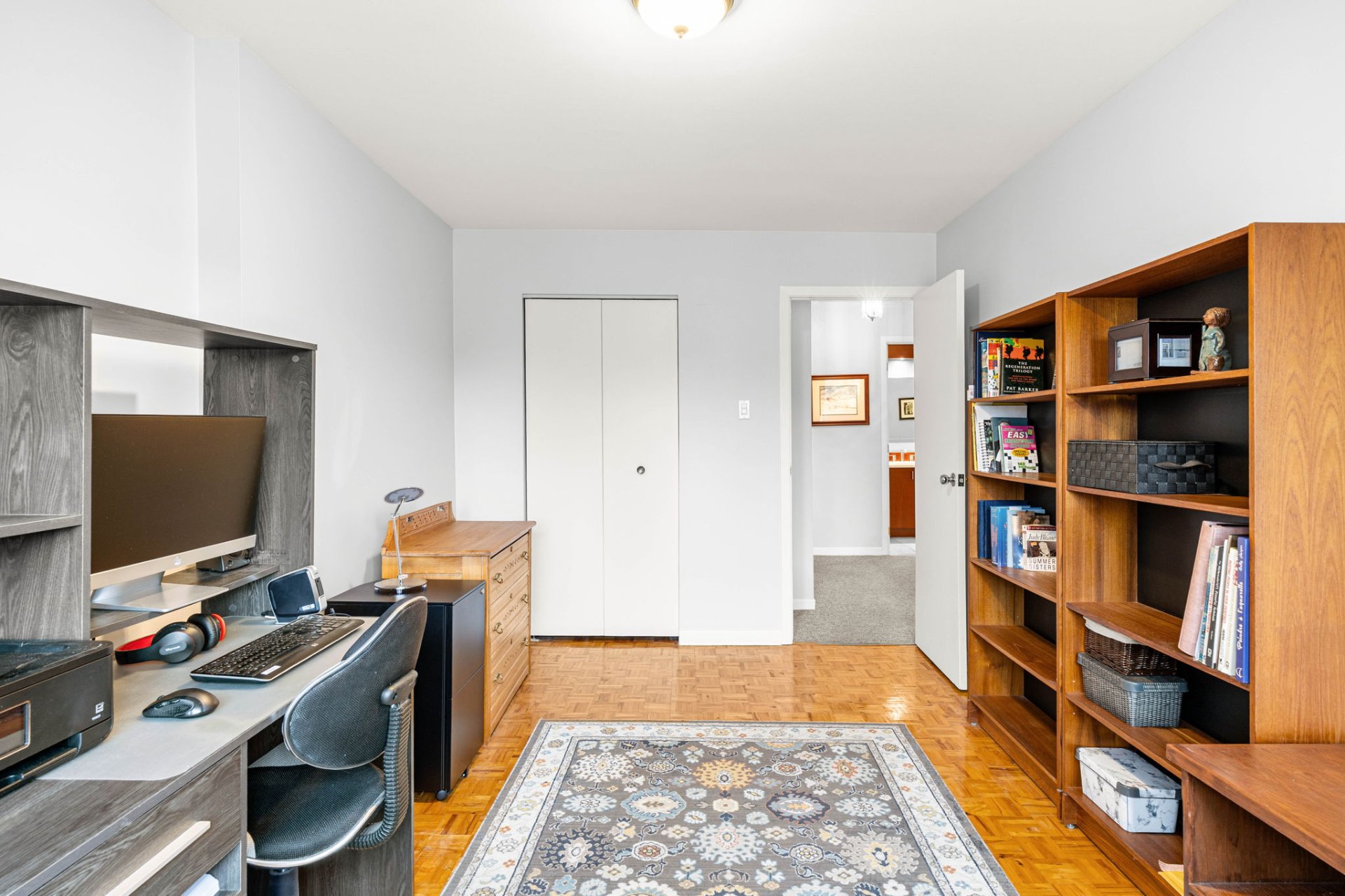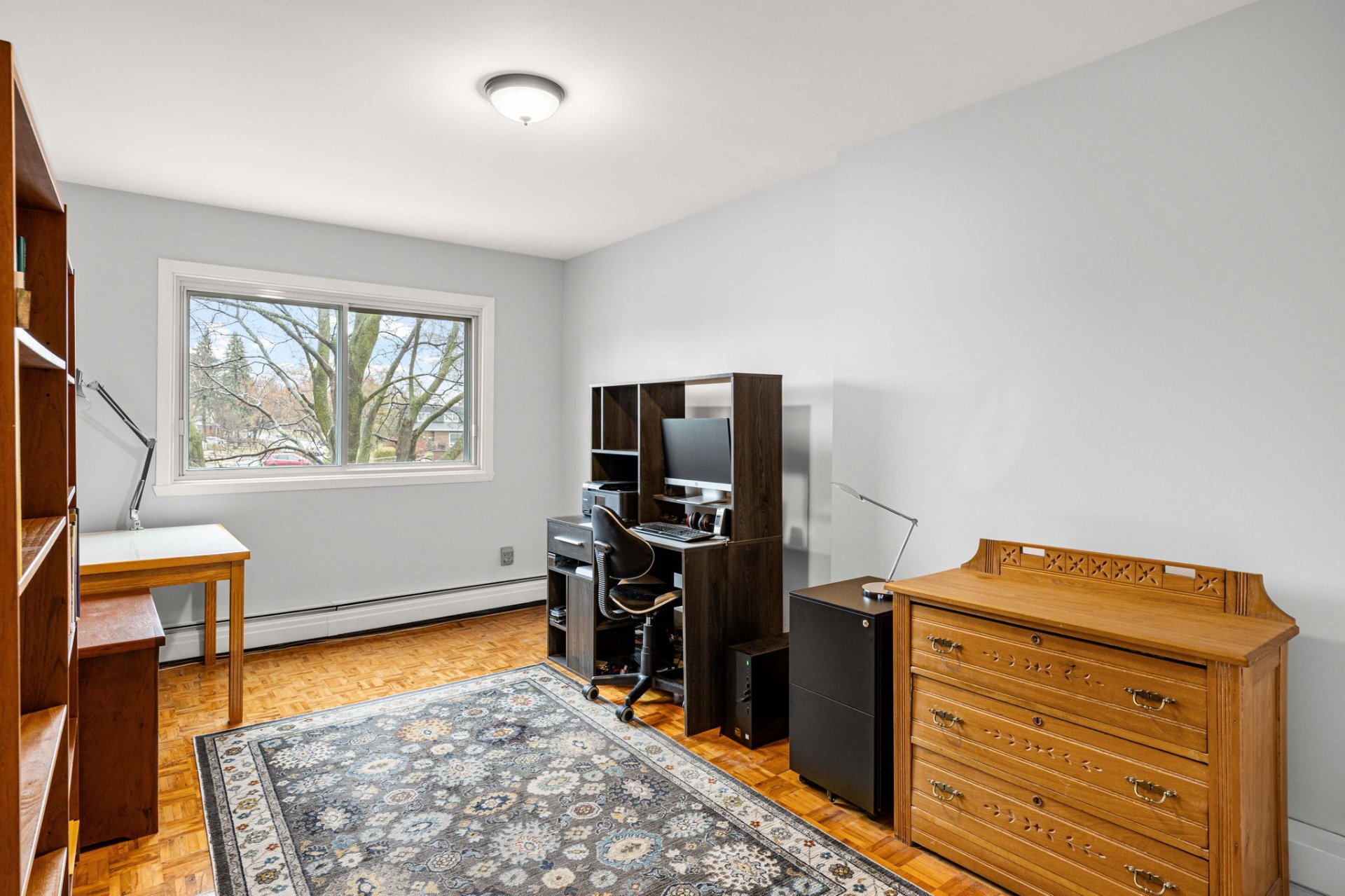 The finished basement includes a versatile bedroom that can also serve as a family room or an office, along with a workshop area, laundry area, and ample storage space.