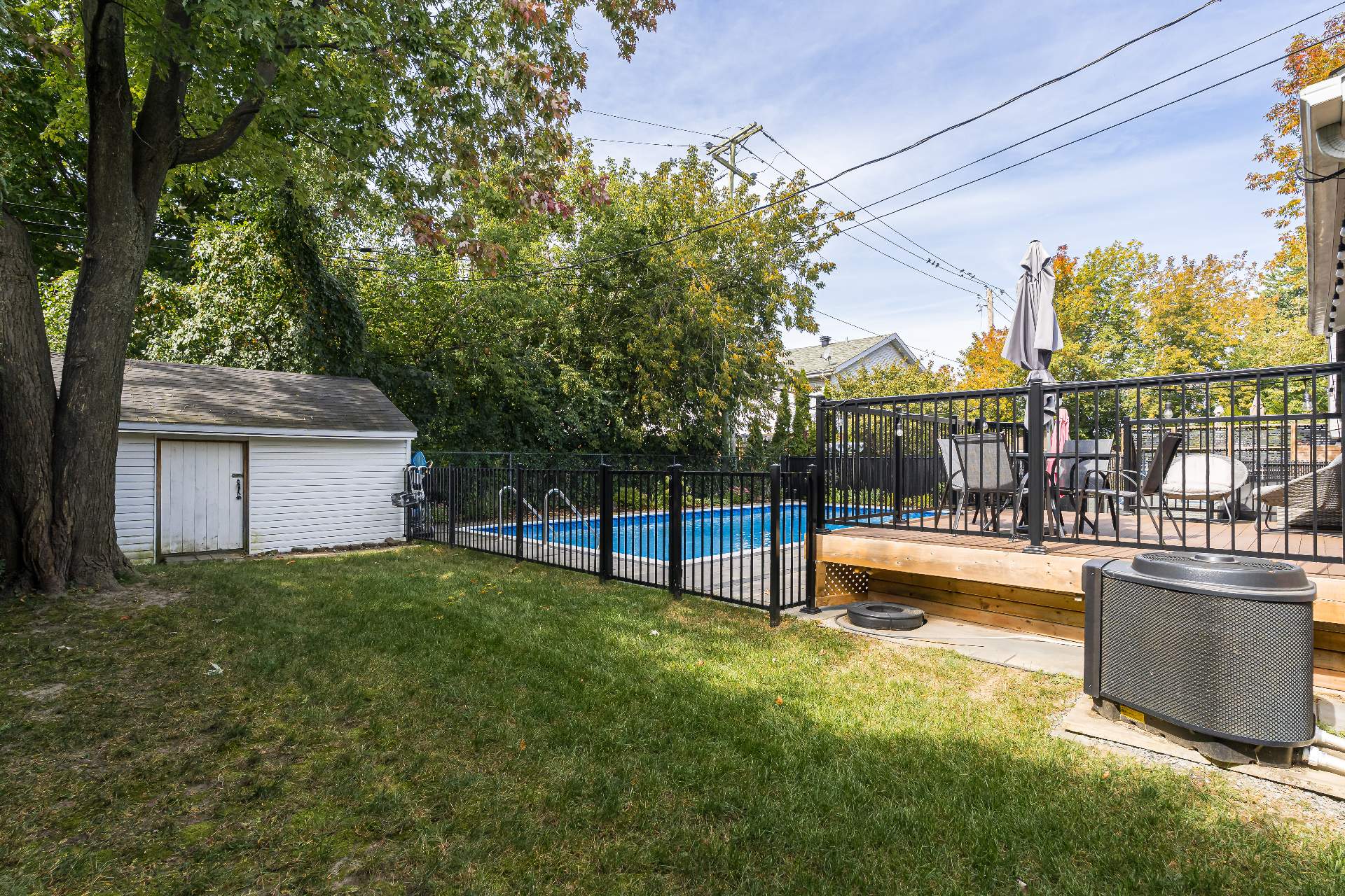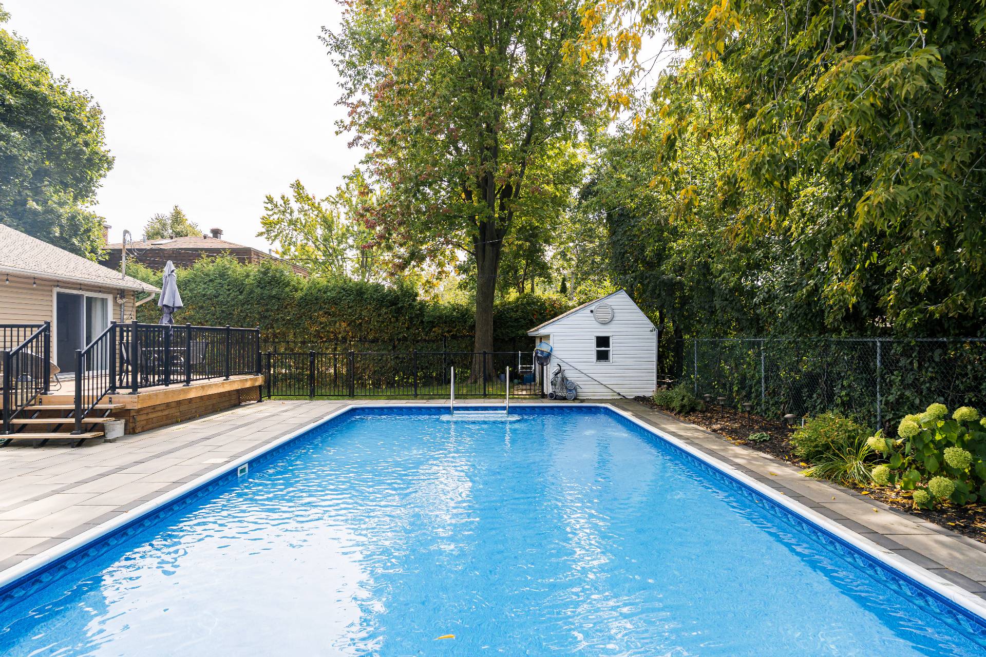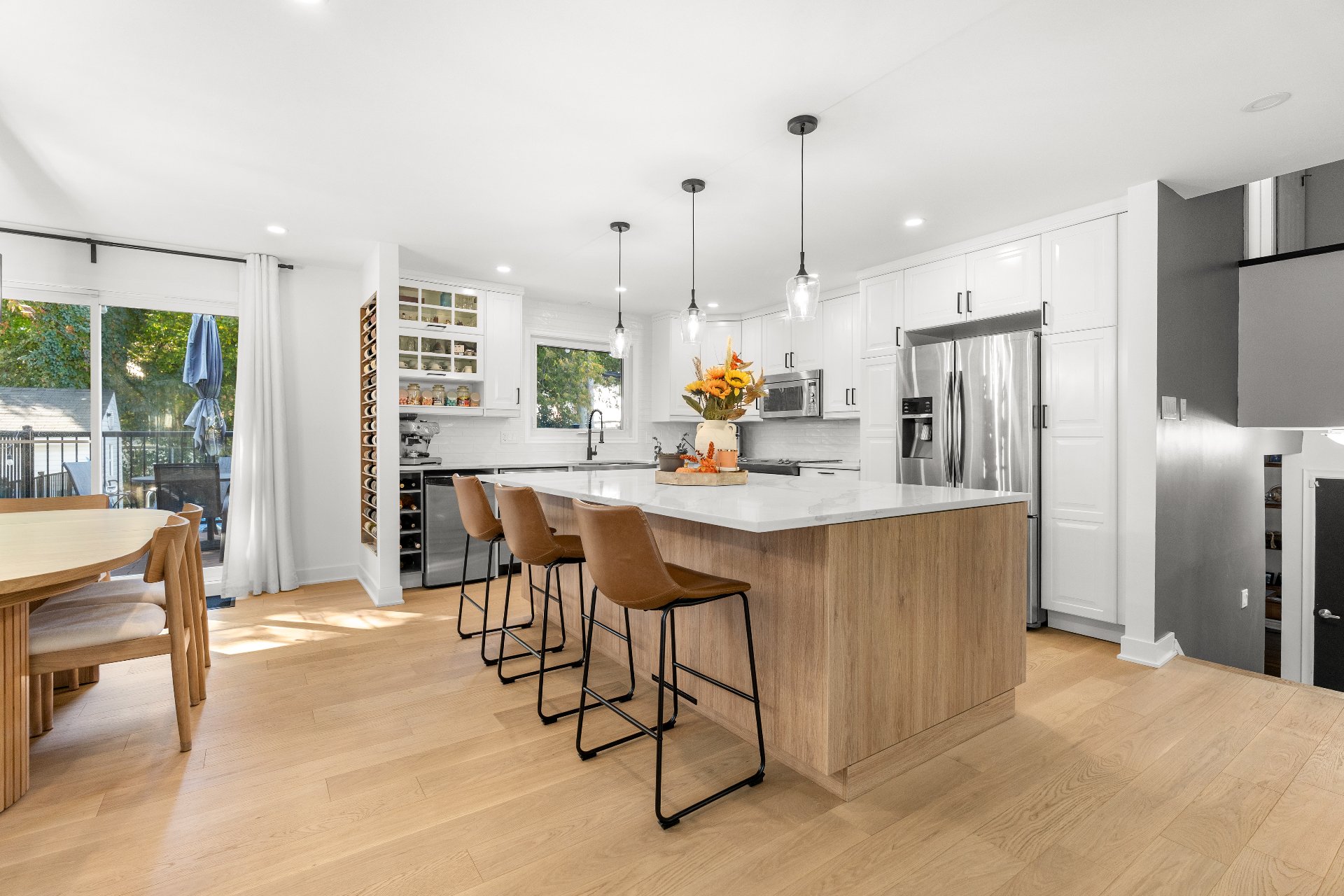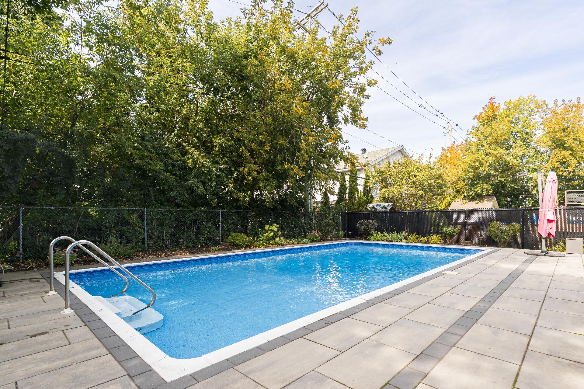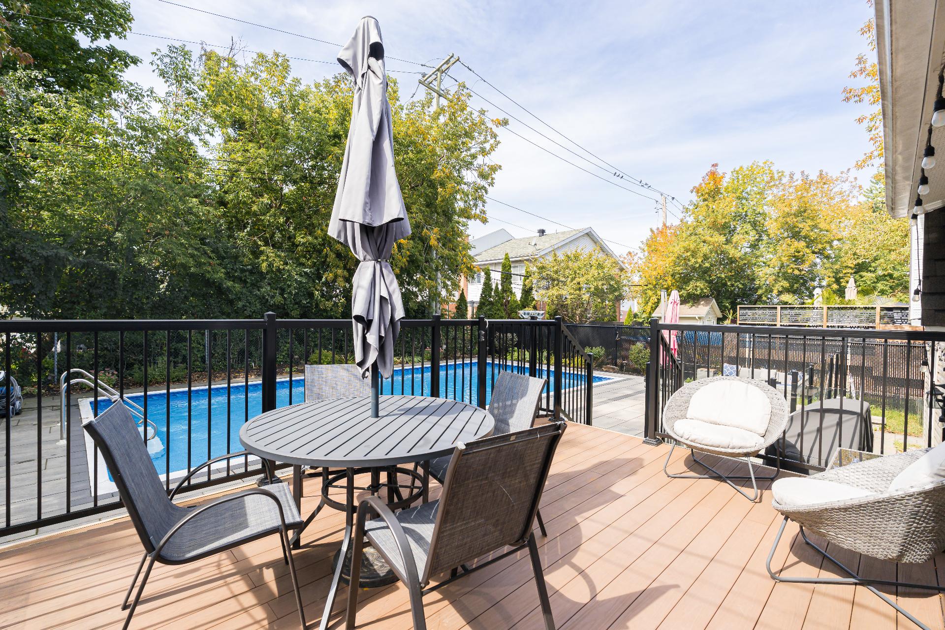 The renovated main floor features a bright and open-concept layout, highlighted by a spacious kitchen with a large central island, sleek quartz countertops, and elegant white oak flooring throughout. The sun-filled living and dining areas open directly to a beautifully landscaped backyard - an entertainer’s dream - complete with a composite deck, inground saltwater pool, and a cabana for extra storage. Enjoy endless summer gatherings in this resort-like outdoor space.