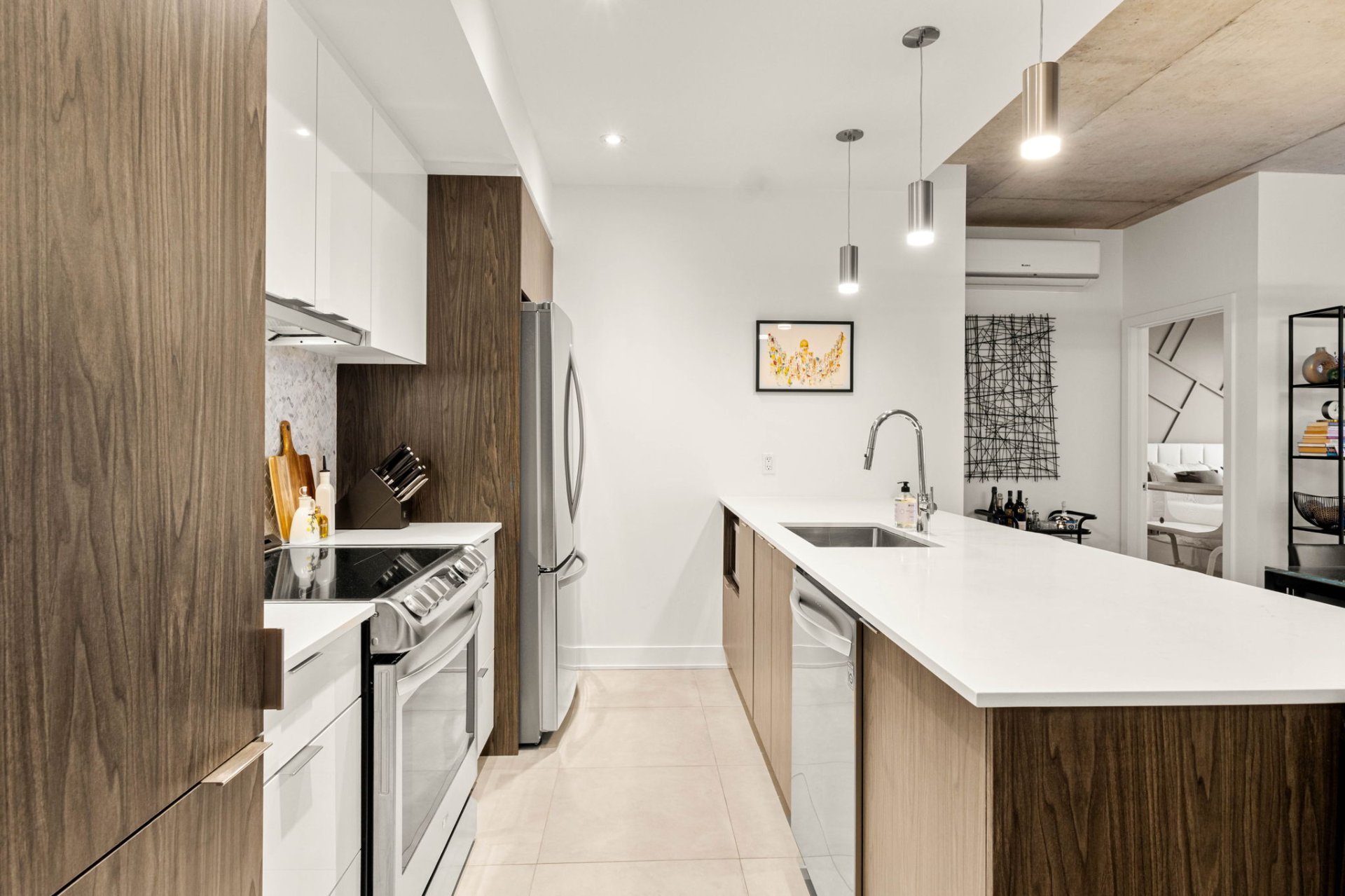 Enjoy an abundance of natural light from floor-to-ceiling windows in this stunning living space. Features include 2 spacious bedrooms, the primary bedroom offering a large walk-in-closet and ensuite bathroom, a spacious kitchen with quartz countertops and spacious island, 9' ceilings, open-concept living area, a spacious balcony, indoor heated parking for 2 cars, a large storage locker, and more. Enjoy various upgrades including ceramic tiles in the entrance and kitchen, a drop ceiling with additional recessed lighting in the kitchen, marble backsplash in the kitchen and a wood accent wall in the primary bedroom. Property amenities include a state-of-the-art fitness room, an urban chalet and rooftop terrace complete with a heated saltwater pool with views of Lac Saint-Louis.