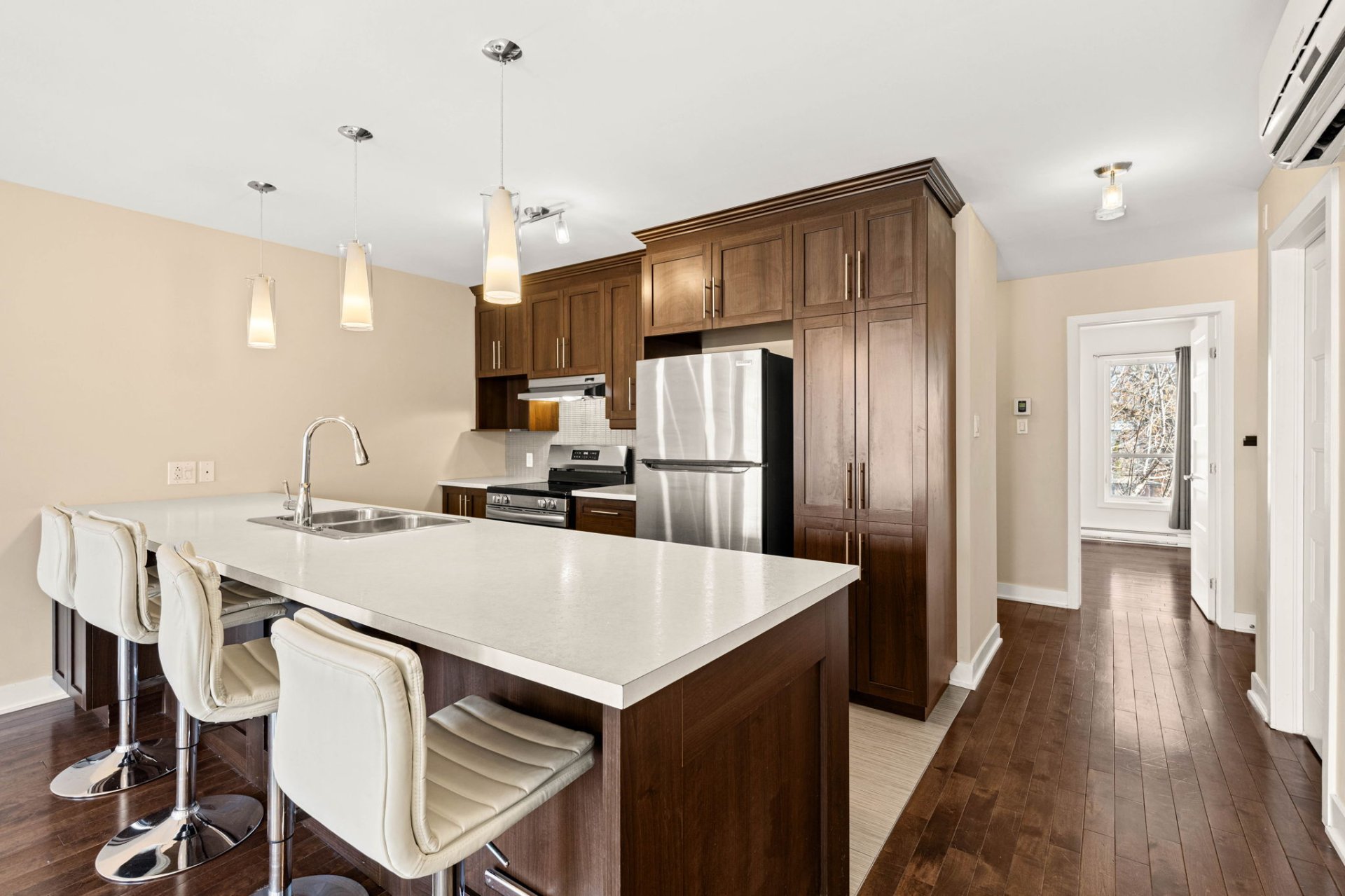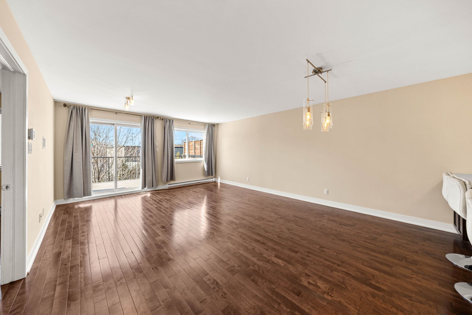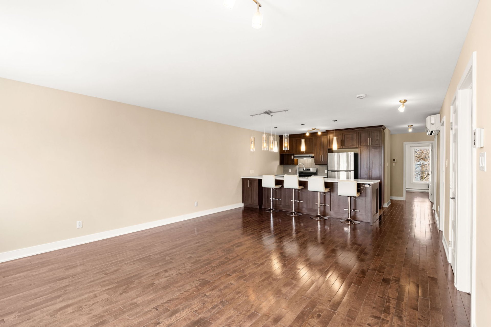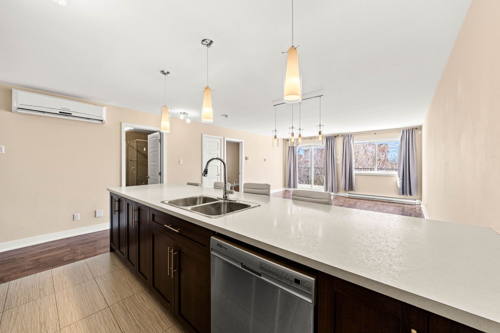 This beautifully maintained 2-bedroom, 1-bathroom modern condo is nestled in a quiet Lachine neighborhood, ideally located just minutes from downtown Montreal, with quick access to major highways, public transit, parks, schools, and everyday amenities. Situated in a well-kept three-story building with just three units, it offers both tranquility and convenience.
