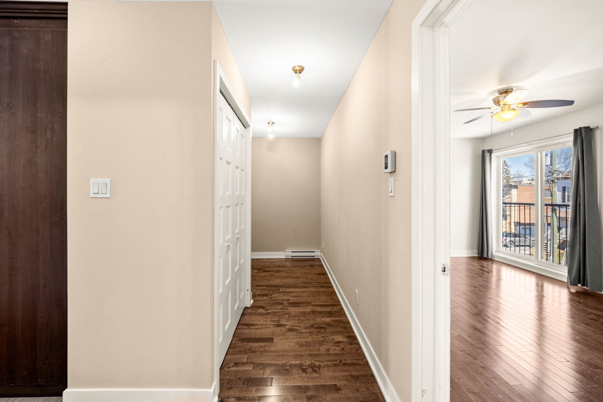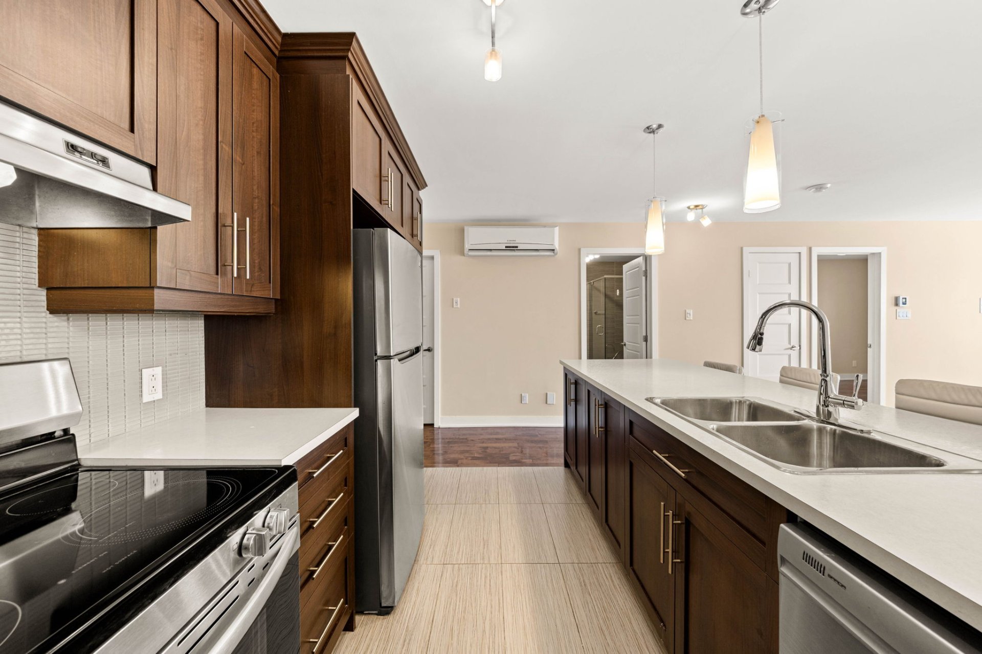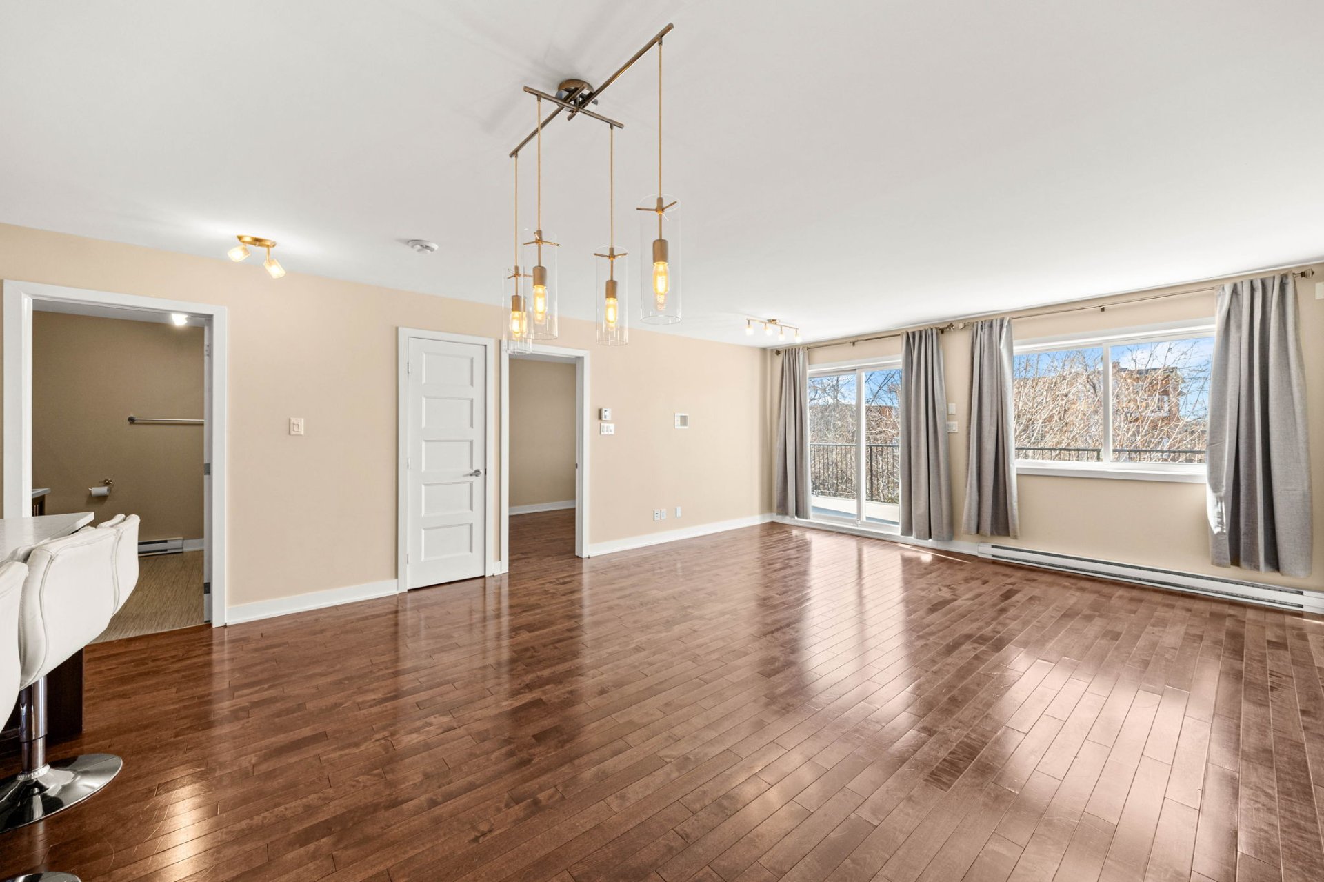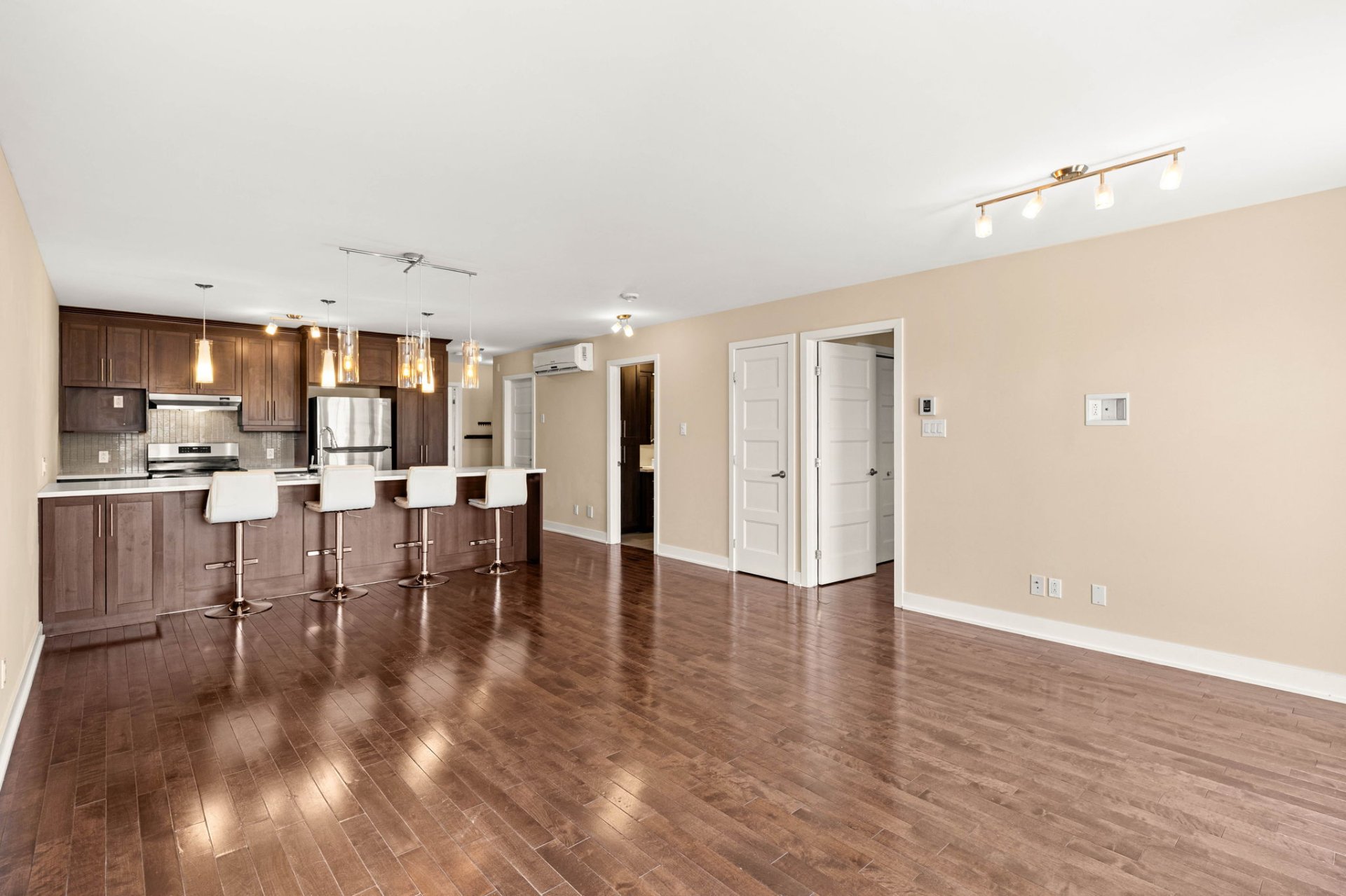 This beautifully maintained 2-bedroom, 1-bathroom modern condo is nestled in a quiet Lachine neighborhood, ideally located just minutes from downtown Montreal, with quick access to major highways, public transit, parks, schools, and everyday amenities. Situated in a well-kept three-story building with just three units, it offers both tranquility and convenience.