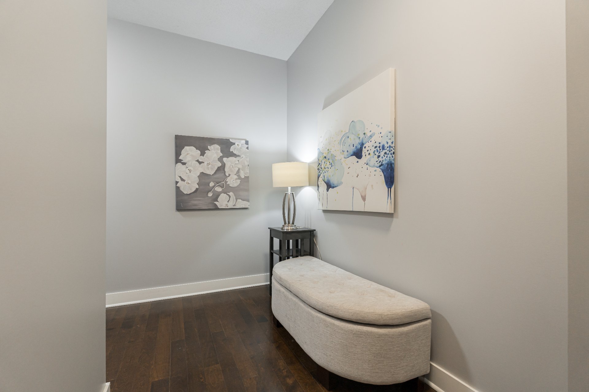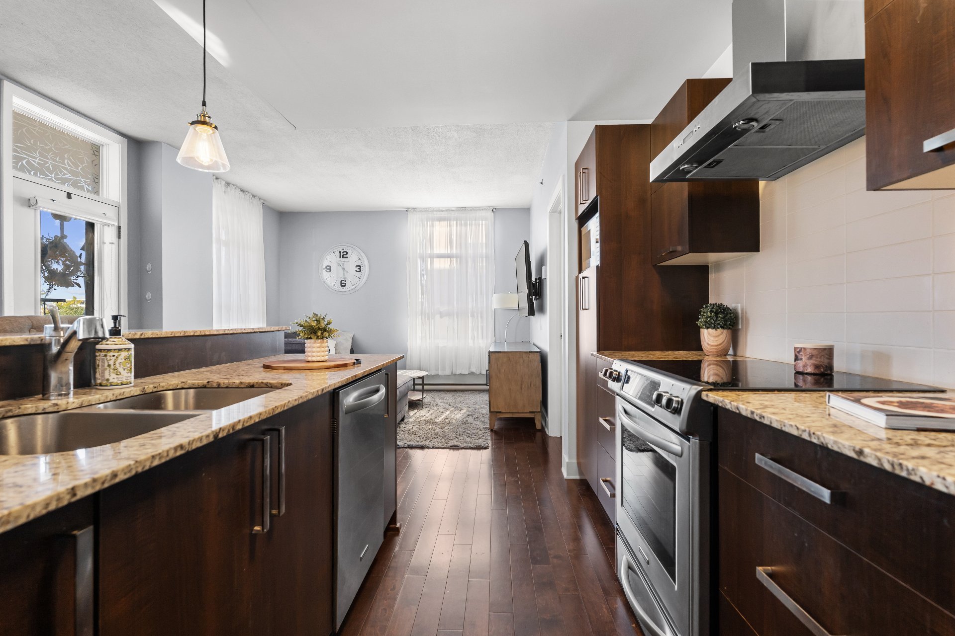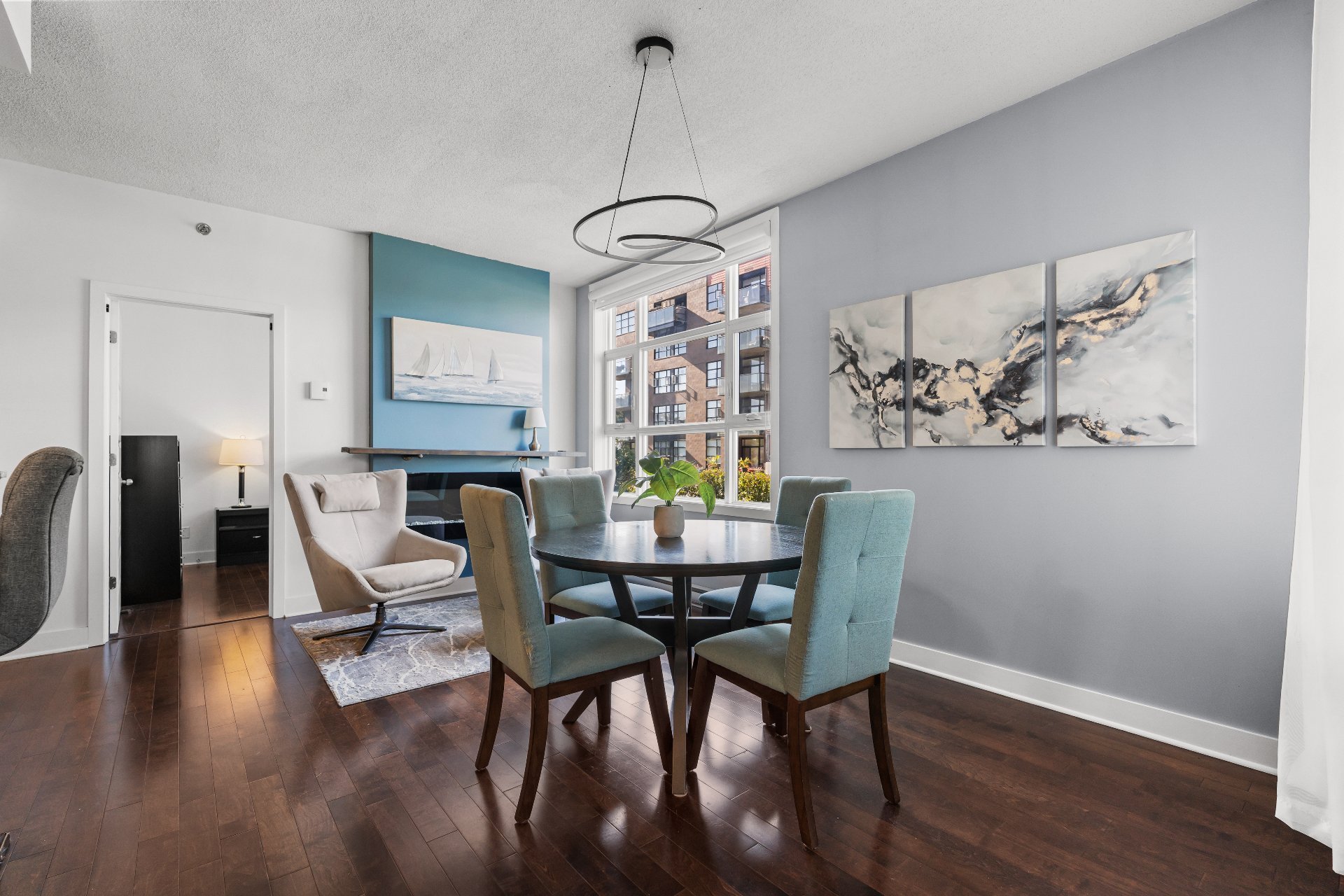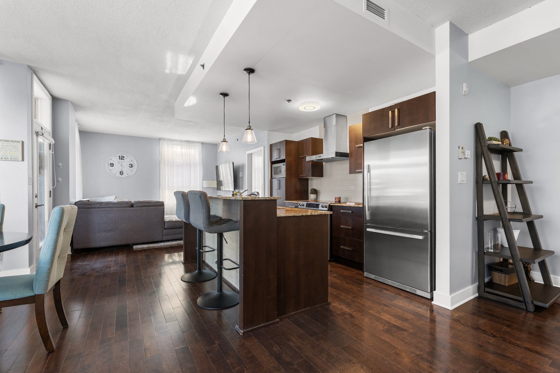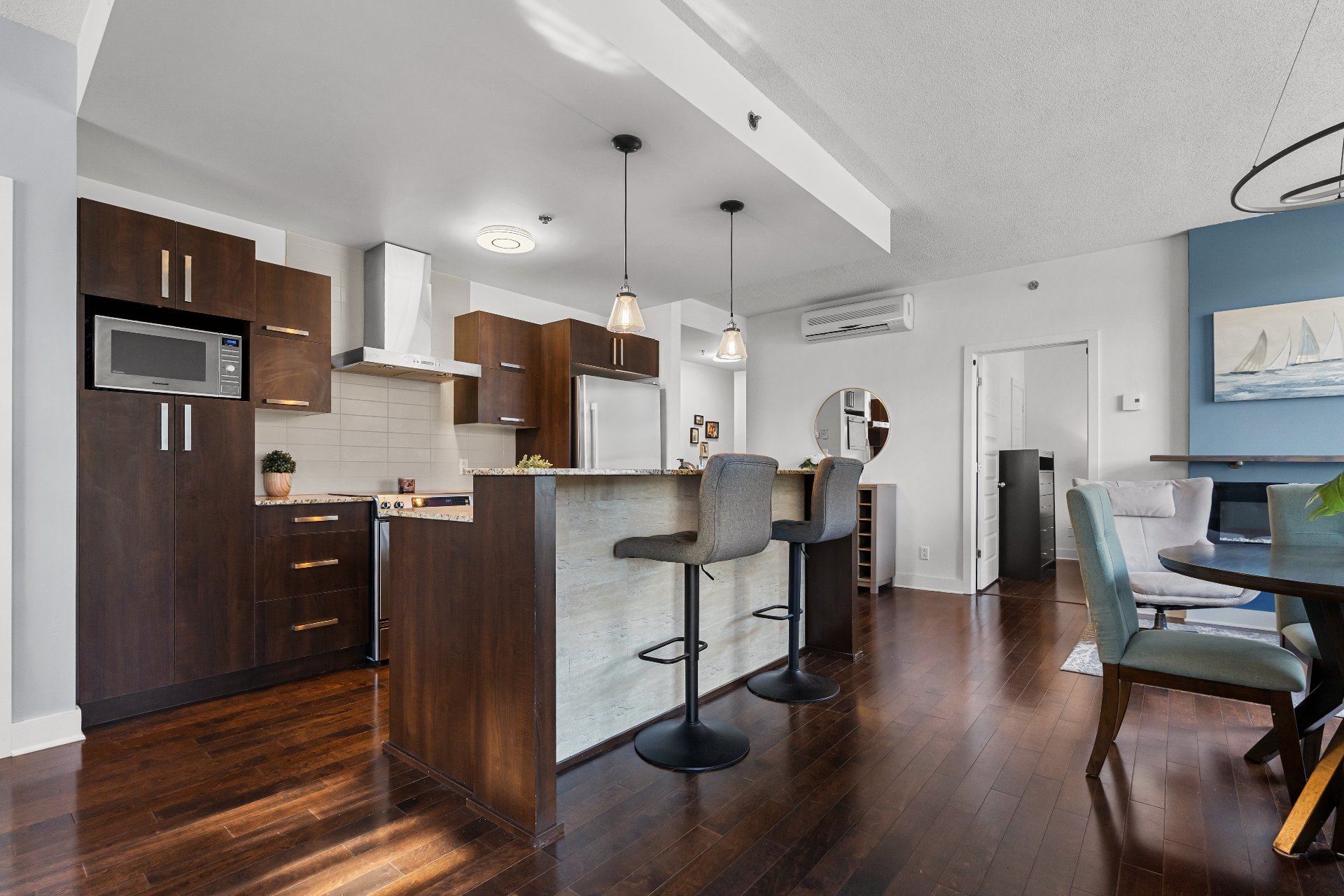 Step inside to discover a bright, open-concept living area featuring 9-foot ceilings and an abundance of natural light. Rich hardwood floors run throughout, adding warmth and sophistication to the space.