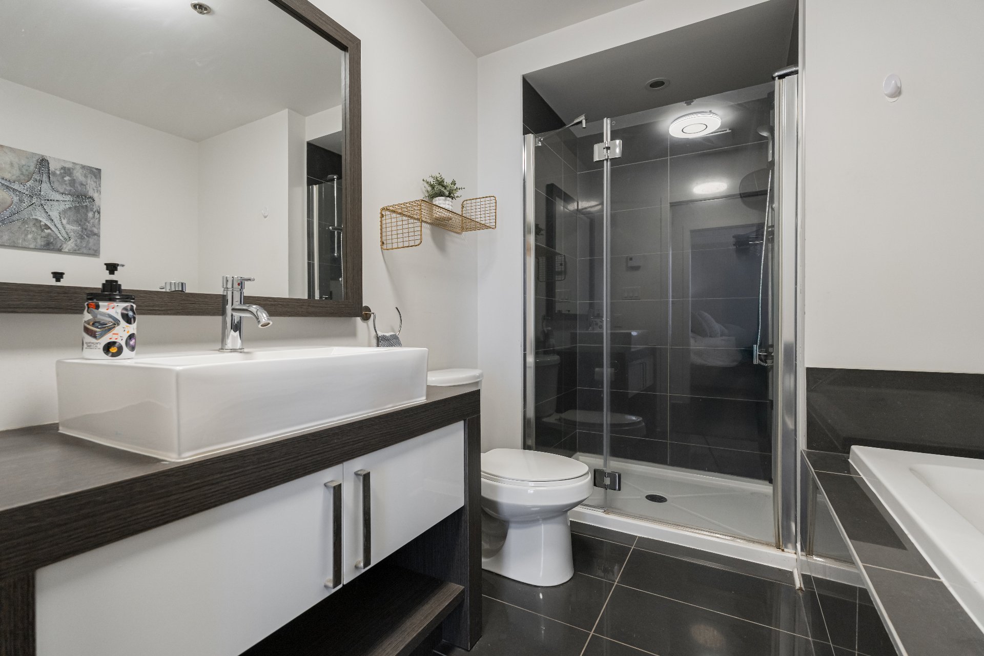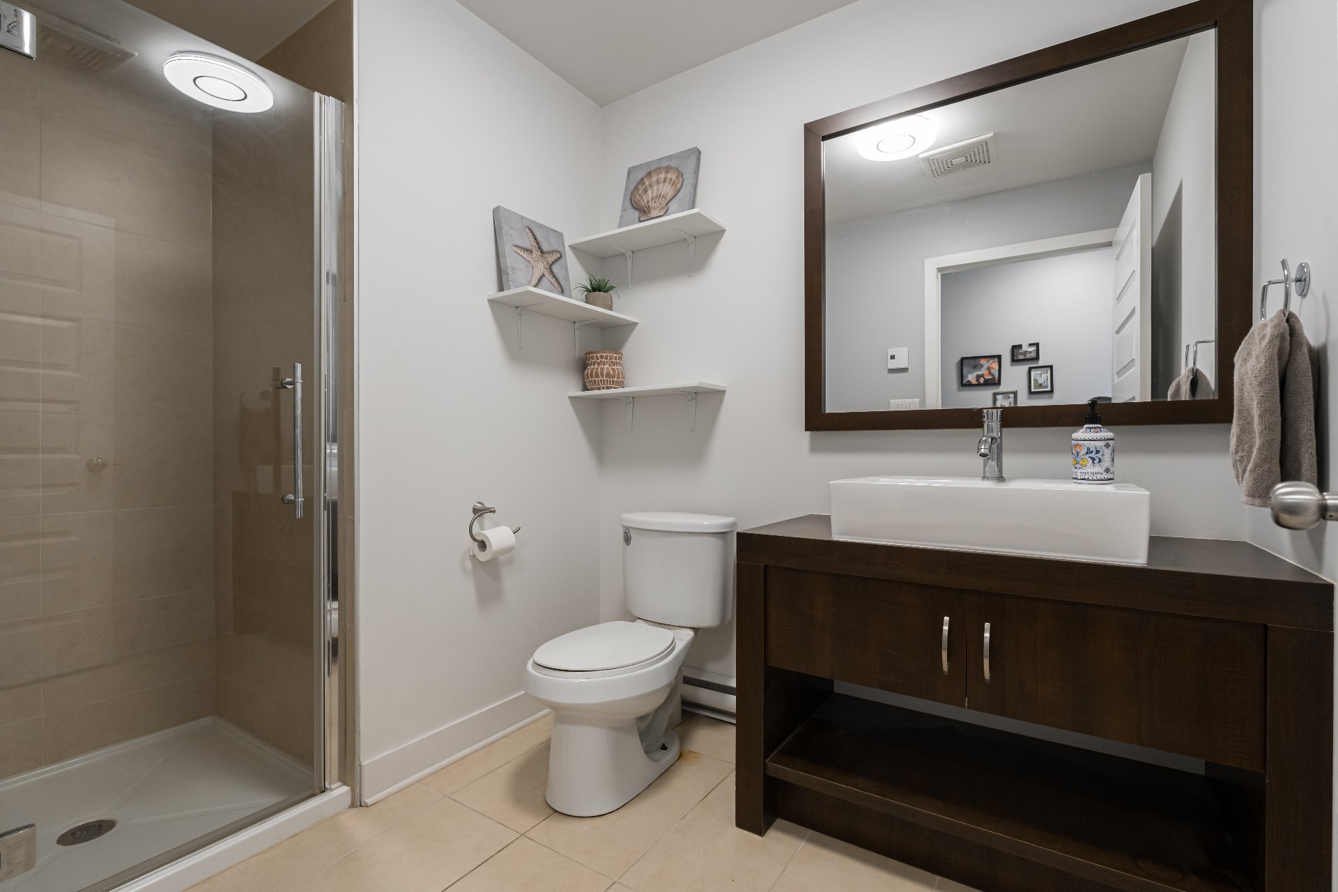 The modern kitchen features a large center island, ample cabinetry, and granite countertops - an ideal setup for cooking and entertaining. The spacious primary bedroom boasts a walk-in closet and an ensuite, complete with a glass shower and separate soaker tub. A generous second bedroom and a second full bathroom with glass shower offer comfort and privacy for guests or family members. A separate laundry room adds everyday practicality. You will also benefit from an indoor parking space in the heated garage.