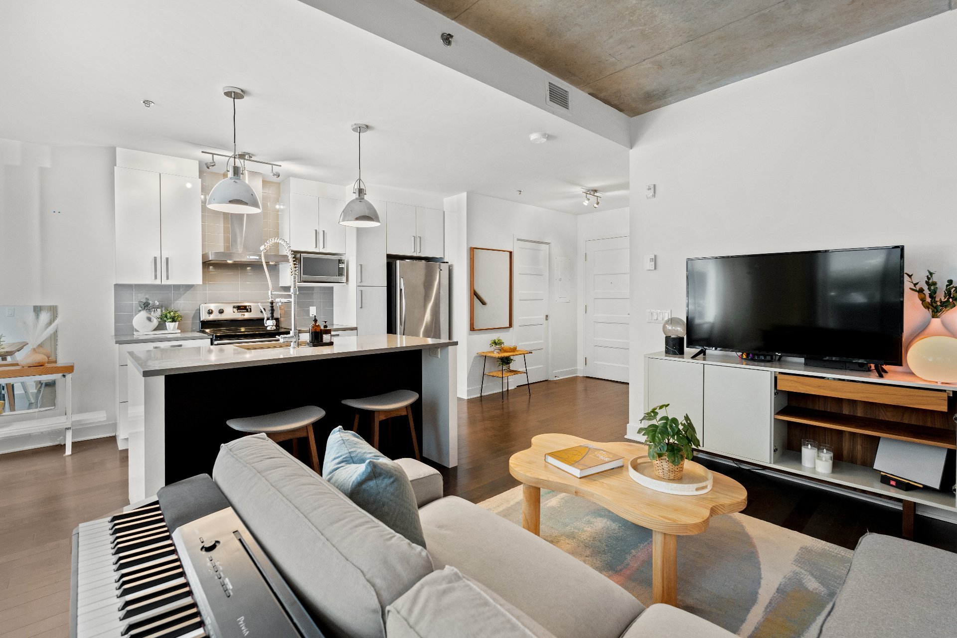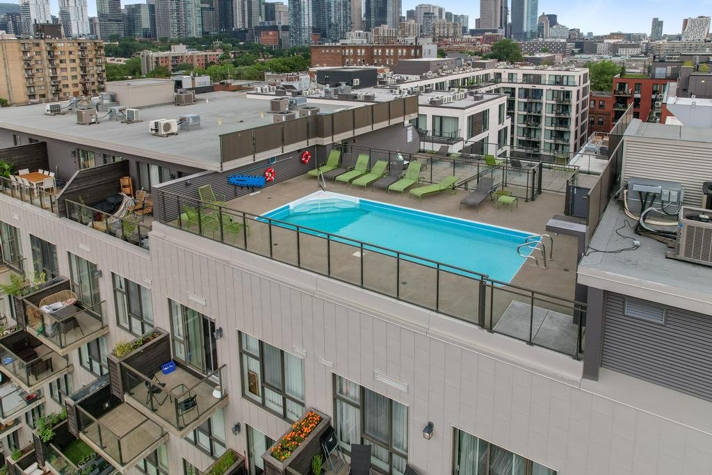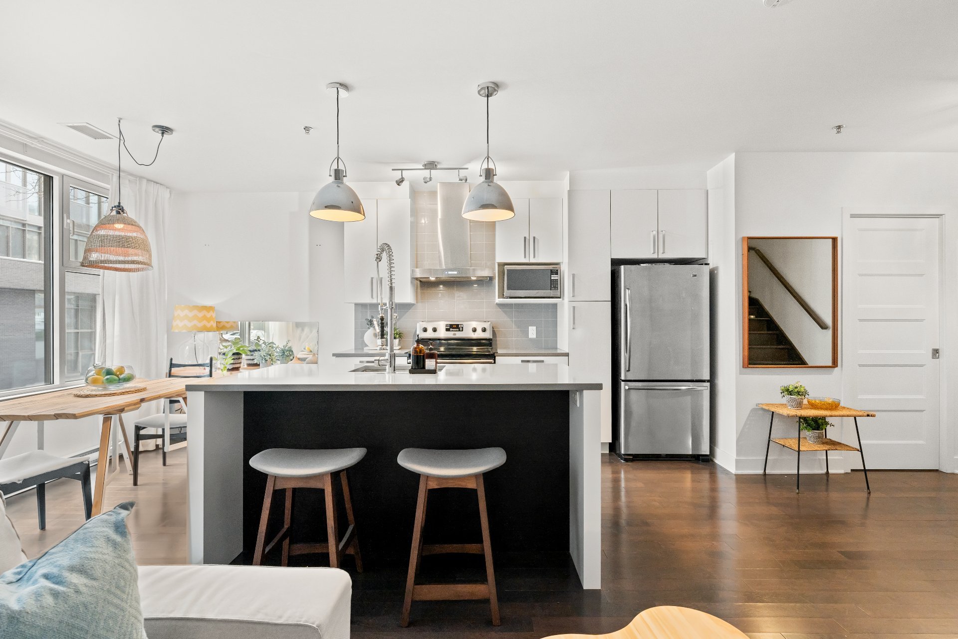 CONDO FEATURES: - Spacious 968 sq ft. of living space, dispersed on two levels - Open floorplan with high ceilings, over 9 feet with exposed concrete as a design feature - Modern kitchen, with an eat-in island - Living room with direct access to the private balcony - Closet and powder room from the entrance - Primary bedroom offers an abundance of natural light with a direct access to the walk-in closet leading into the en-suite bathroom and laundry area, where a stackable washer/dryer are placed - Ultra luxurious en-suite with a shower/tub design - 2nd bedroom offers its own private balcony and the 3rd is ideal for an office or atelier LOCATION: - Ideally located near Notre-Dame Street, where all the trendy restaurants and cafes are located - Short walking distance to the Lachine Canal and all the neighbouring seasonal activities - Close to the Atwater Market and multiple public transportation options (bus station, train and access to Metro) - A 3 min. Walk to École De La Petite-Bourgogne, and quick access to major schools within the city
