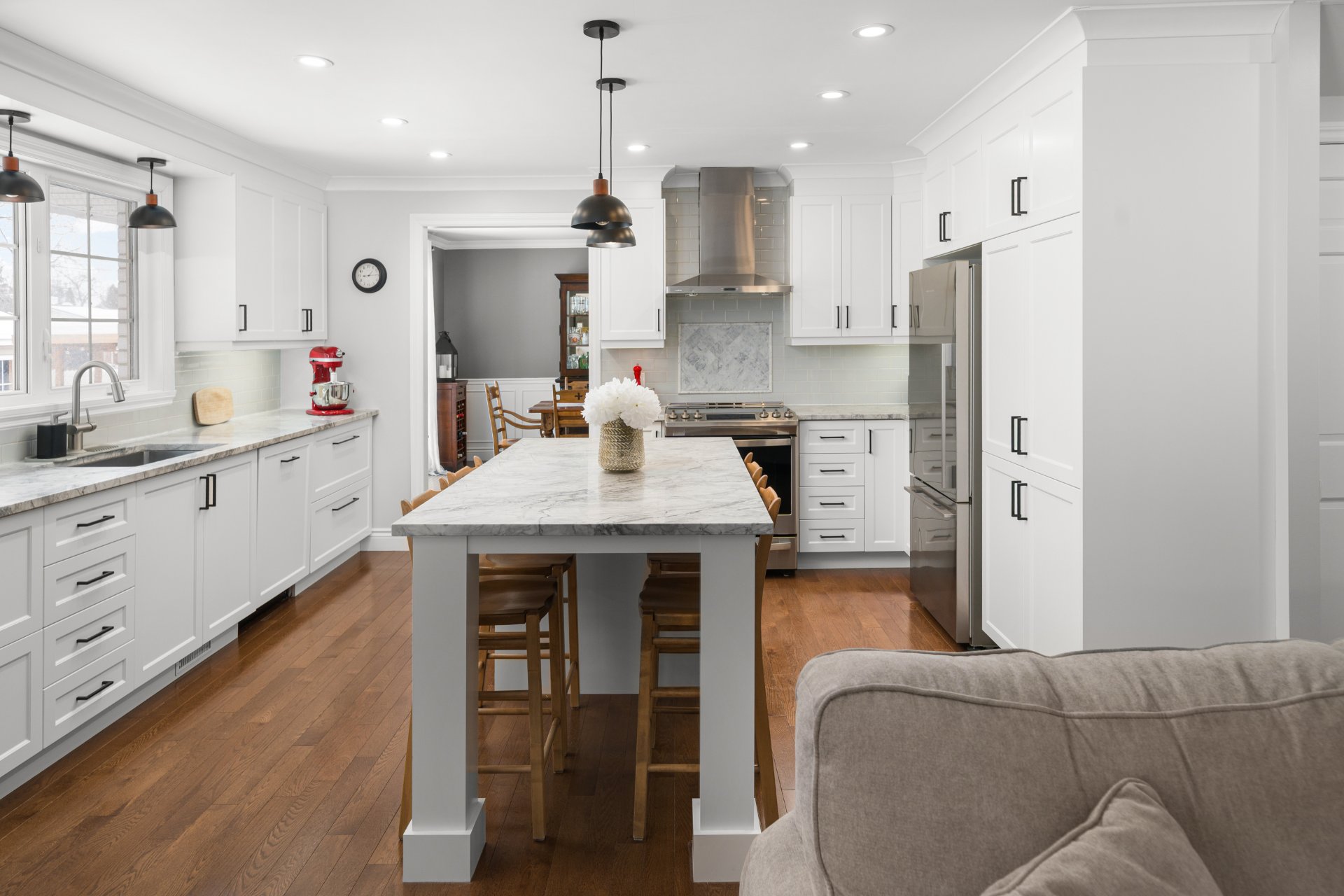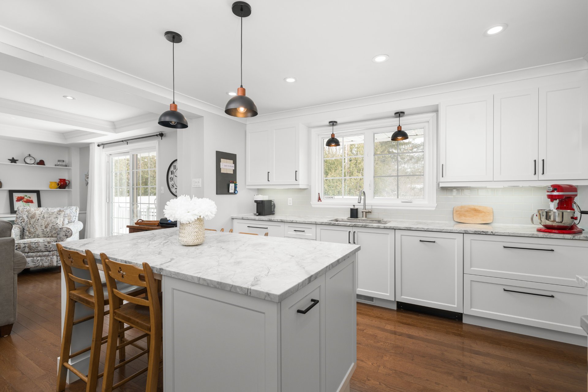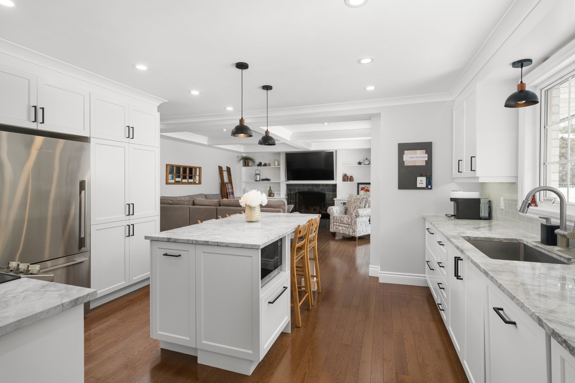 The main floor showcases strip wood flooring throughout, creating a warm and cohesive feel. A spacious foyer opens to a bright living and dining room combination, perfect for entertaining. The updated kitchen features white granite countertops, a large central island ideal for family gatherings, and flows seamlessly into the inviting family room with a wood-burning fireplace, vaulted ceiling, and custom built-ins.