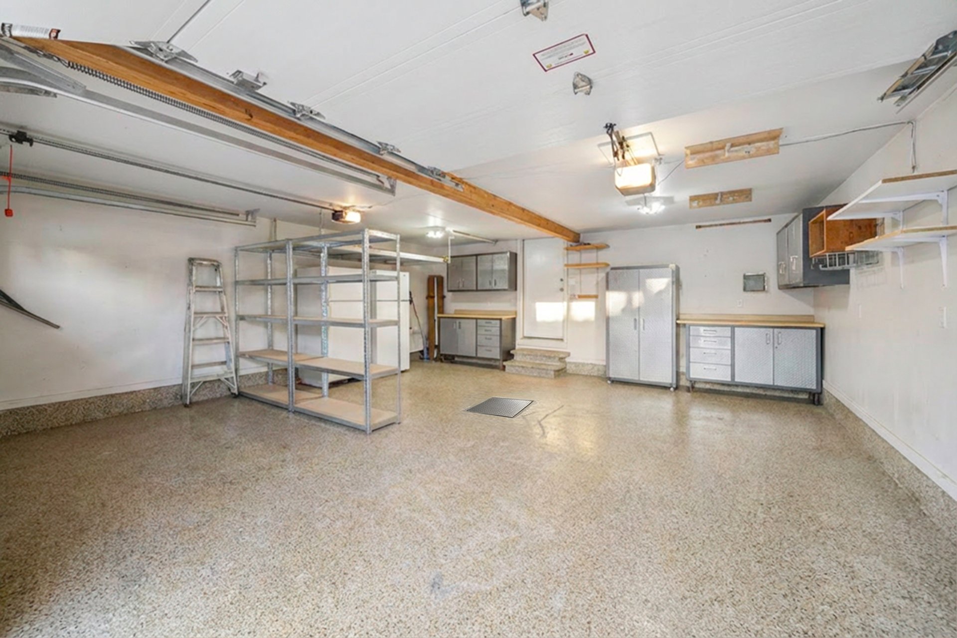 The double garage is thoughtfully finished with epoxy flooring, wall organizers, and ceiling-mounted storage racks, both functional and polished.