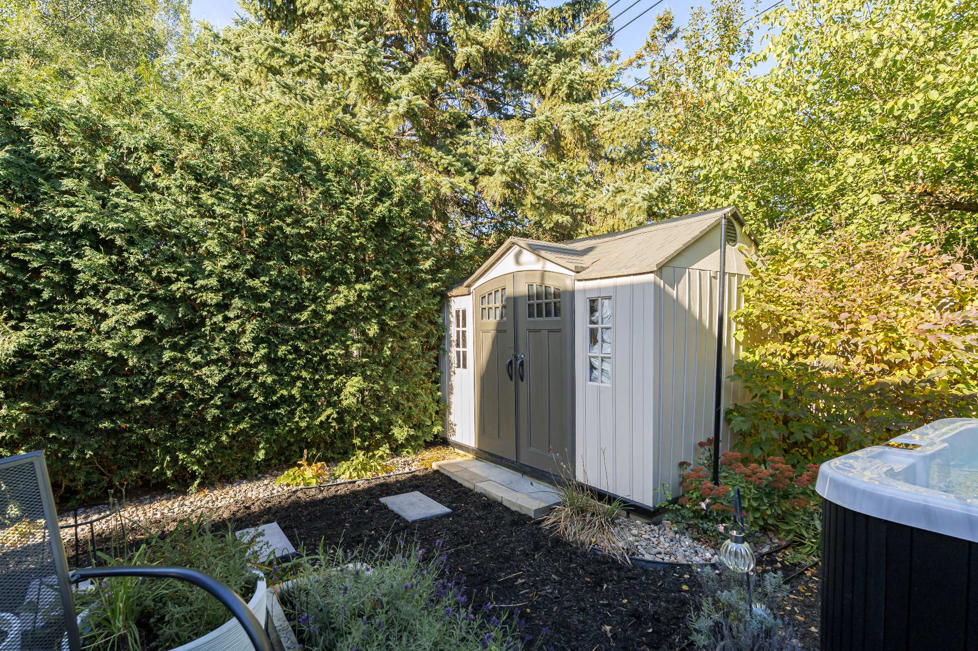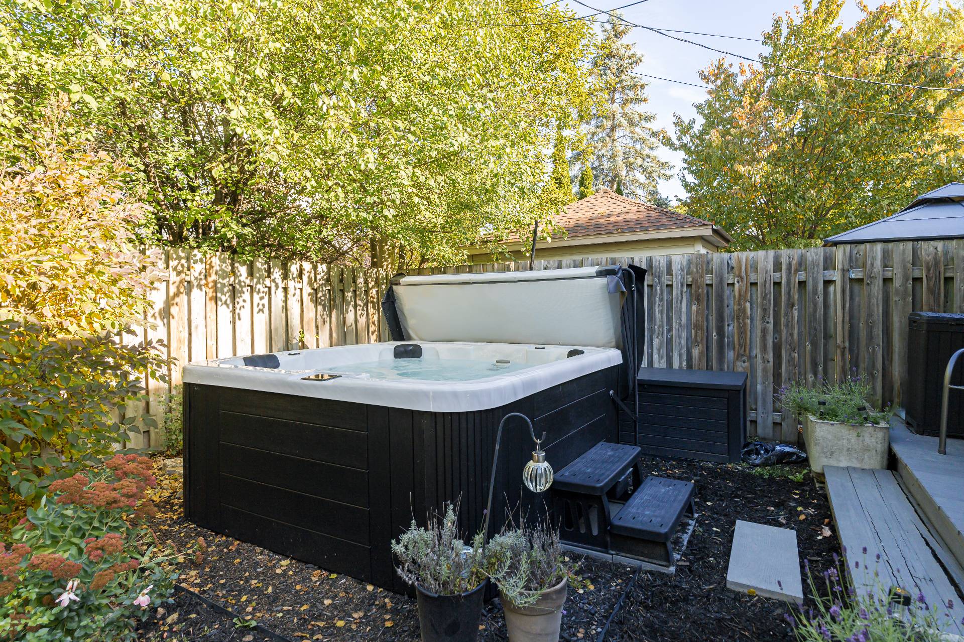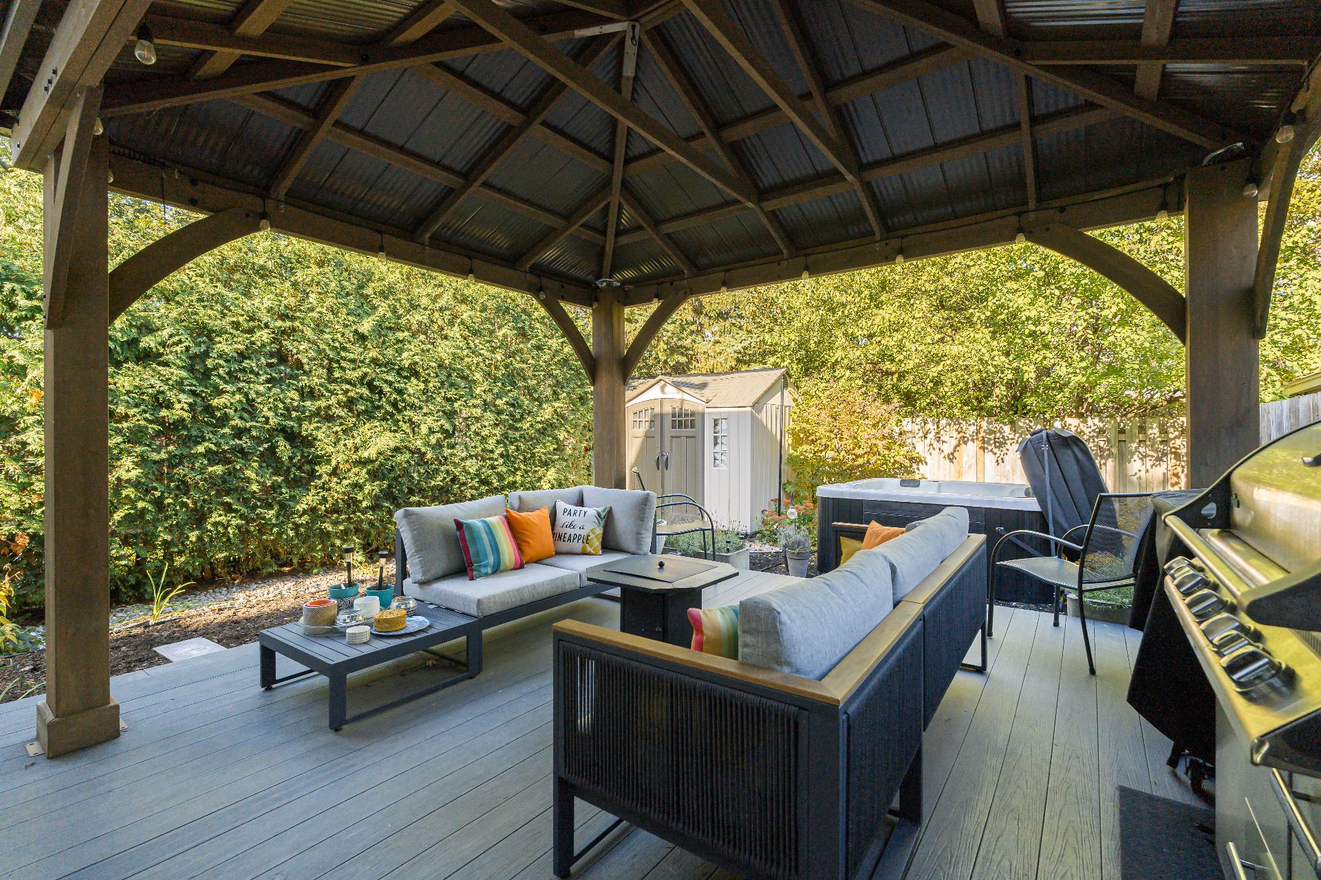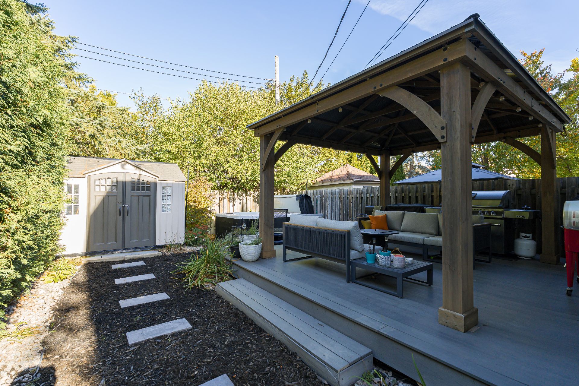 The main floor features a spacious kitchen with ample counter and storage space, seamlessly connected to an open-concept living and dining area - perfect for both everyday living and entertaining. Step outside to your fully enclosed backyard, complete with a composite deck, cabana, and a large gazebo surrounded by mature trees and hedges, offering a private, peaceful retreat. A convenient powder room completes the main level.